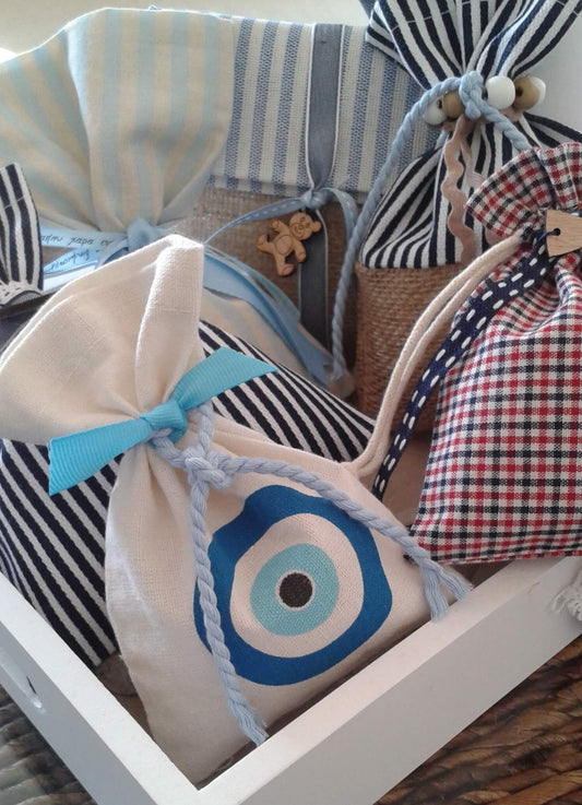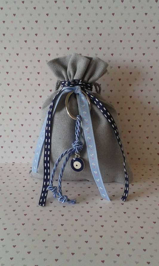 Μπομπονιέρα βάπτισης βαμβακερό πουγκί με μπρελόκ και μάτι