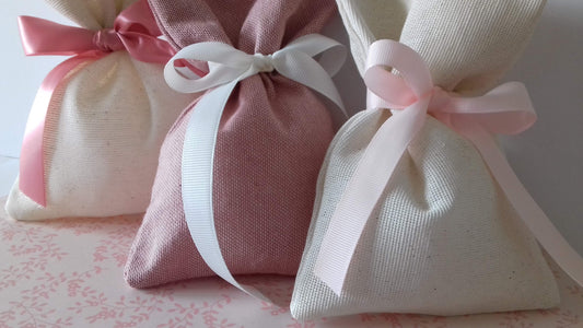 Μπομπονιέρα βάπτισης λινό πουγκί με κορδέλα φιόγκο