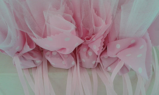 Μπομπονιέρα με πουά ύφασμα και κορδέλες