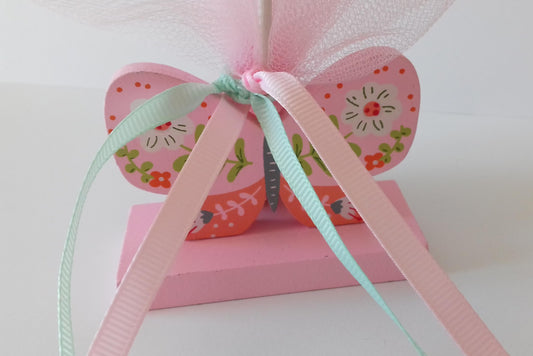 Μπομπονιέρα βάπτισης ξύλινο σταντ πεταλούδα για φωτογραφίες