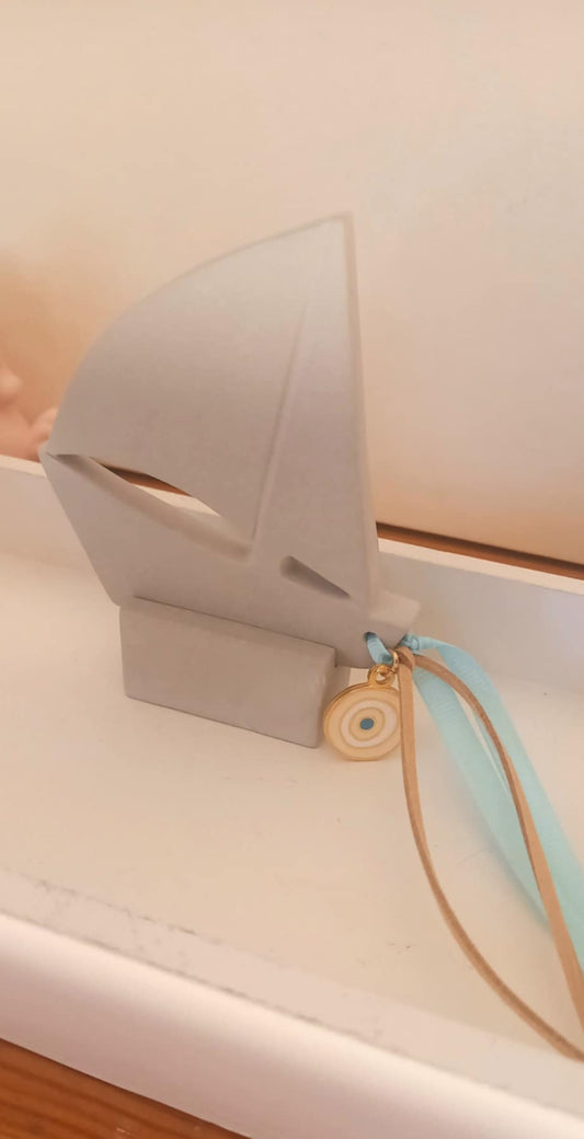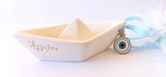 Μπομπονιέρα βάπτισης κεραμικό καράβι με όνομα, και μάτι
