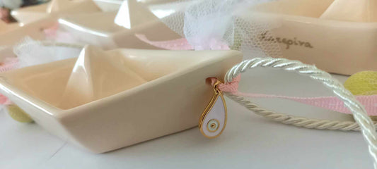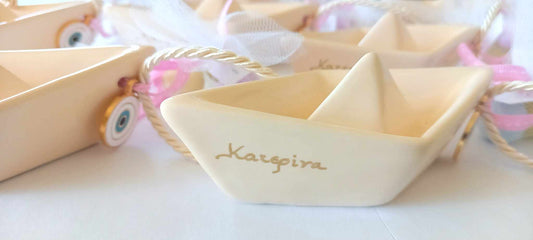 Μπομπονιέρα βάπτισης κεραμικό καράβι με όνομα, μάτι και κορδέλες