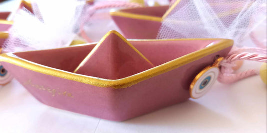 Μπομπονιέρα βάπτισης κεραμικό καράβι με γιορτινές κορδέλες και όνομα