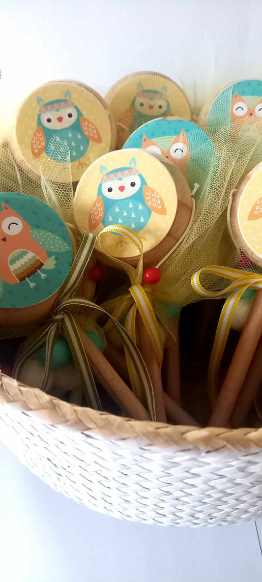 Παιδική μπομπονιέρα βάπτισης ξύλινο τυμπανάκι κουκουβάγια