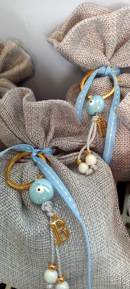 Μπομπονιέρα βάπτισης πουγκί με μπρελόκ και μονόγραμμα