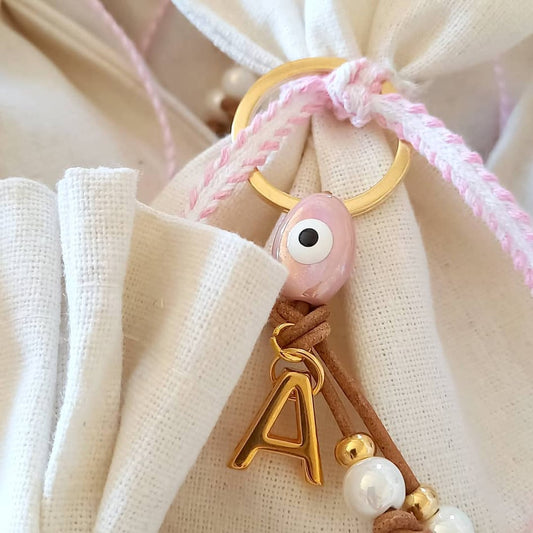 Μπομπονιέρα βάπτισης με μπρελόκ με μάτι και μονόγραμμα