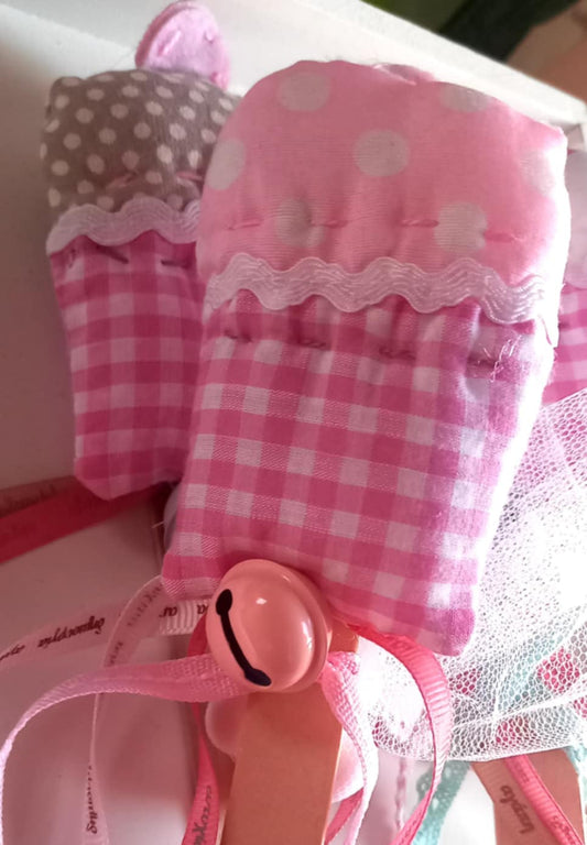 Παιδική μπομπονιέρα βάπτισης υφασμάτινη κουδουνίστρα cupcake