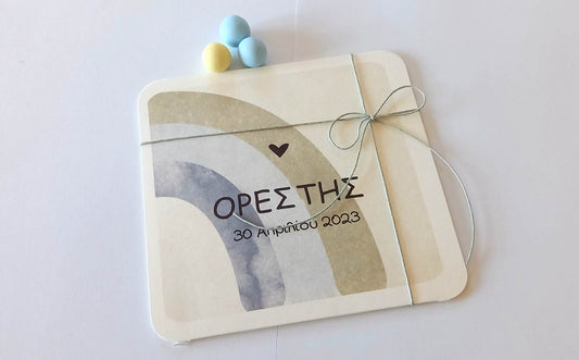 Προσκλητήριο βάπτισης σε ρομαντικό ύφος και καρτελάκι με κορδόνι