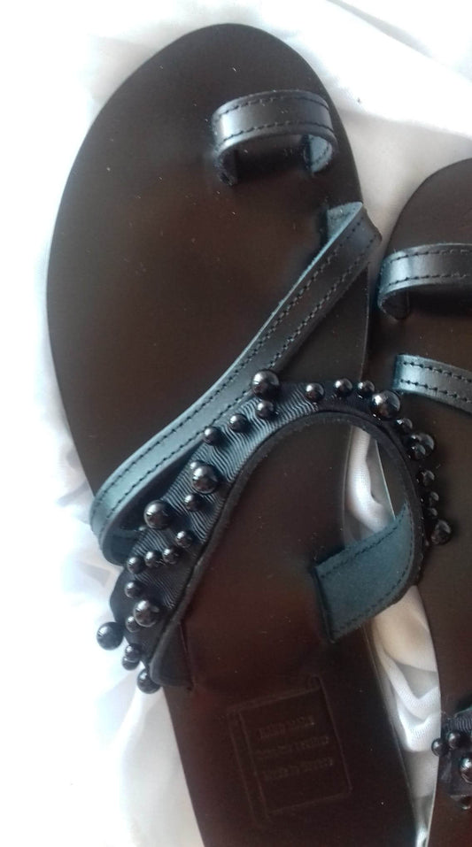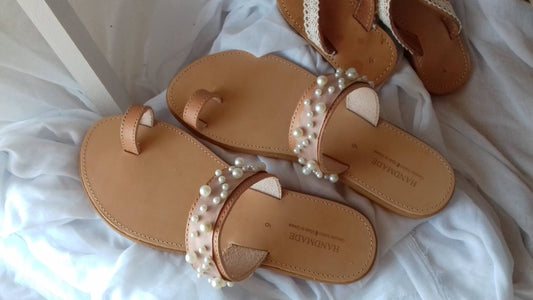 Χειροποίητα δερμάτινα γυναικεία σανδάλια με πέρλες