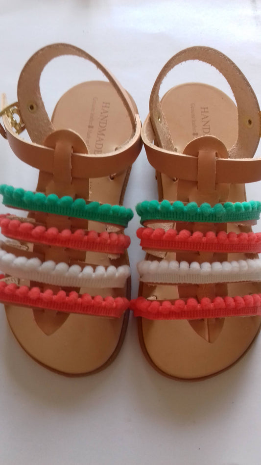 Χειροποίητα δερμάτινα παιδικά πέδιλα με μικρά πον πον