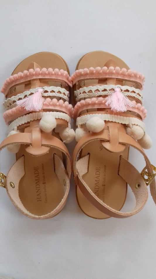 Χειροποίητα δερμάτινα παιδικά πέδιλα με πον πον και φουντίτσες