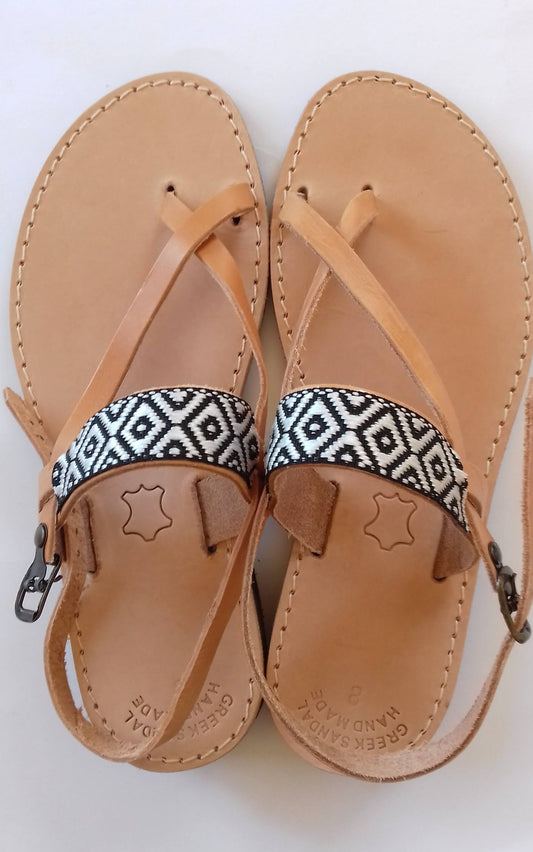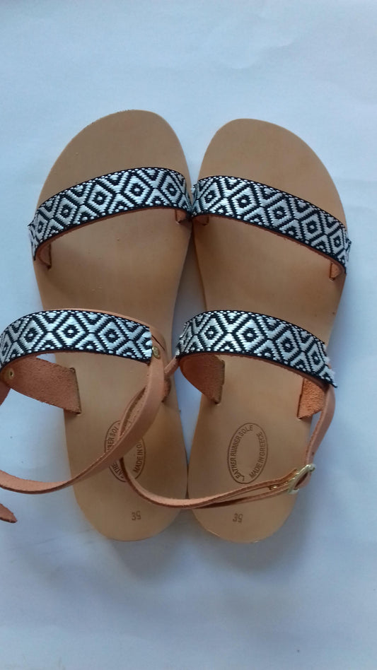 Χειροποίητα δερμάτινα σανδάλια με έθνικ ασπρόμαυρο σχέδιο