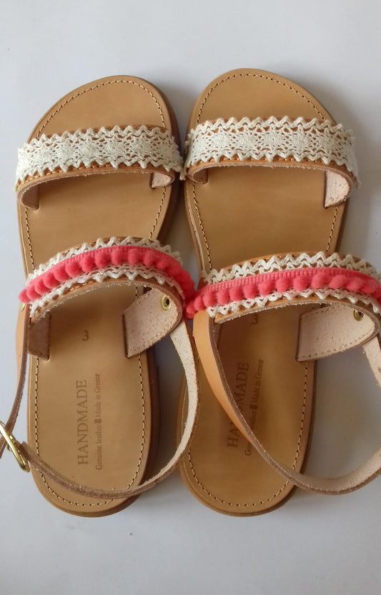 Χειροποίητα δερμάτινα παιδικά πέδιλα με δαντέλα και πον πον