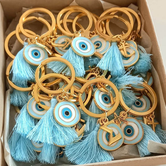 Μαρτυρικό βάπτισης μπρελόκ με μάτι, μονόγραμμα, σταυρό και φουντίτσα