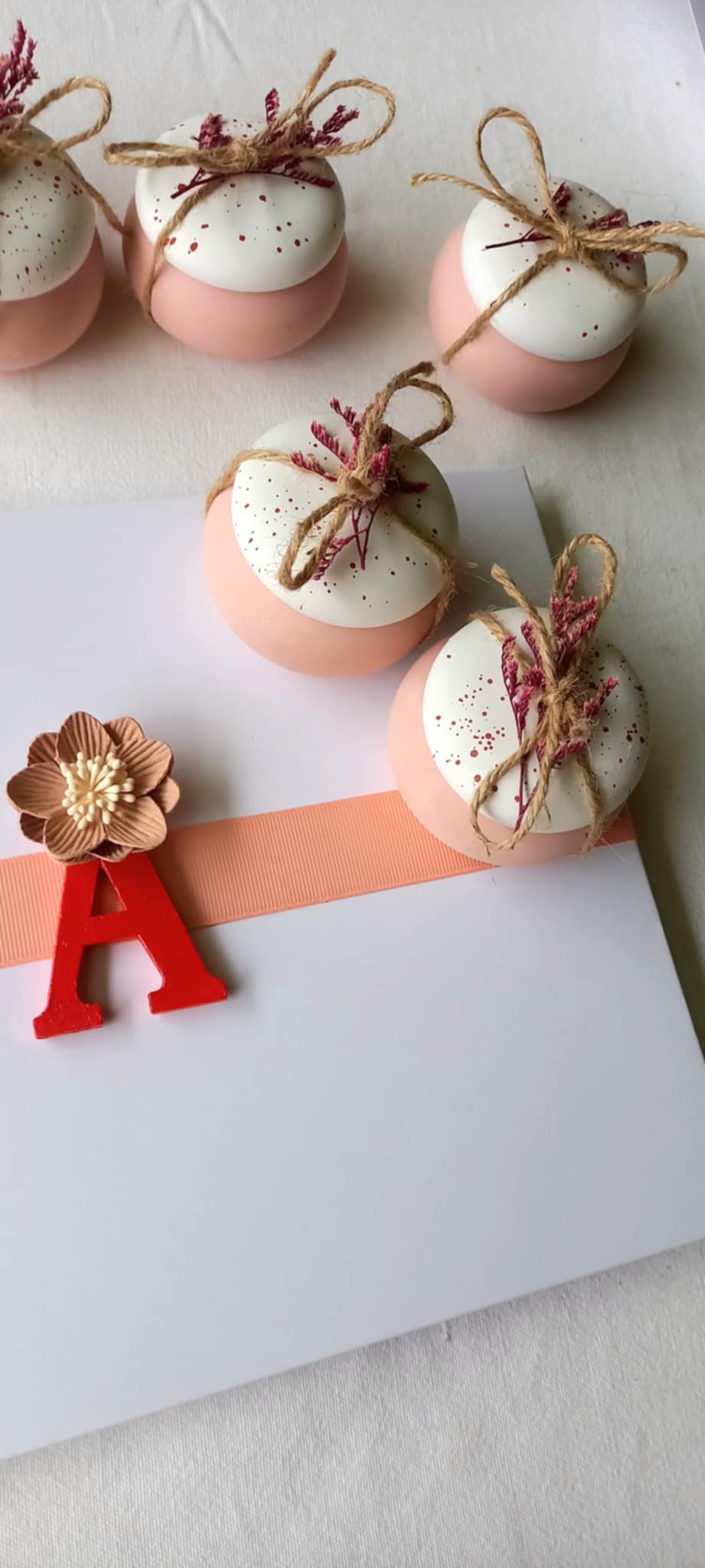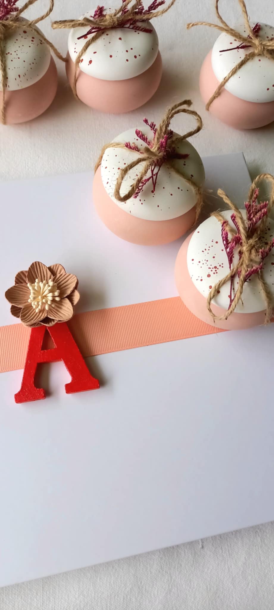 Βιβλίο ευχών σε λευκό χρώμα με κορδέλα σε σομόν απόχρωση, ξύλινο μονόγραμμα σε φωτεινό κόκκινο χρώμα και λουλούδι.