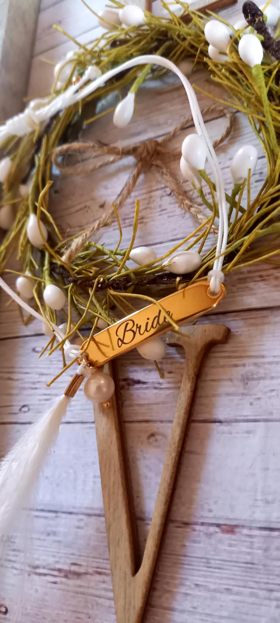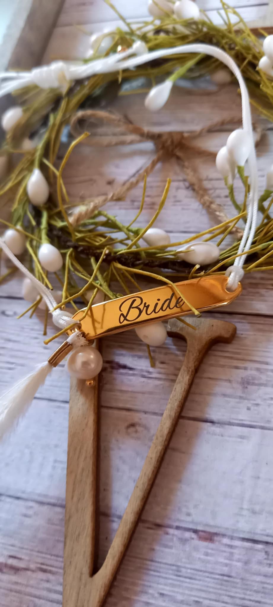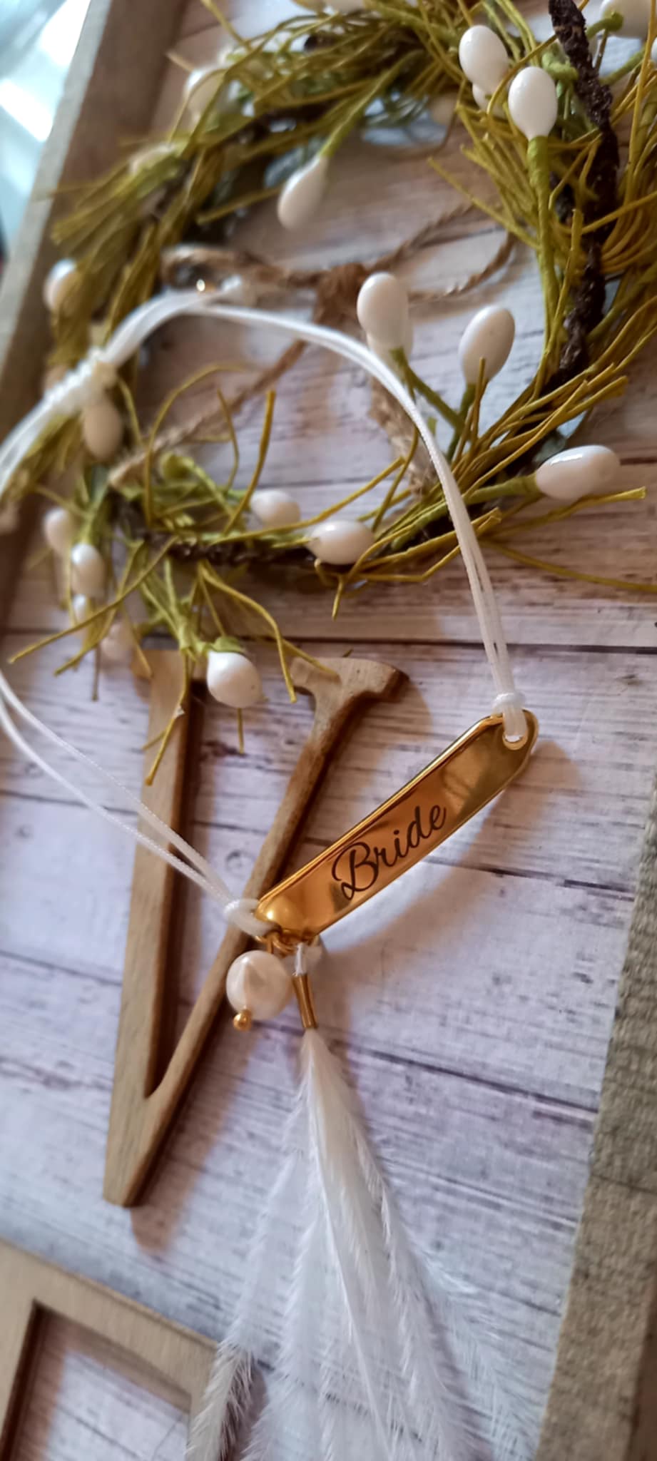 Κομψό χειροποίητο βραχιόλι για bachelor party για τη νύφη με μεταλλική ταυτότητα "Bride", κορδόνι σε ουδέτερο μπεζ χρώμα, φτερά και μαργαριτάρι καλλιέργειας.