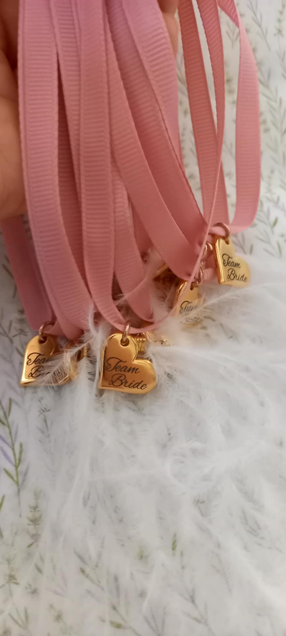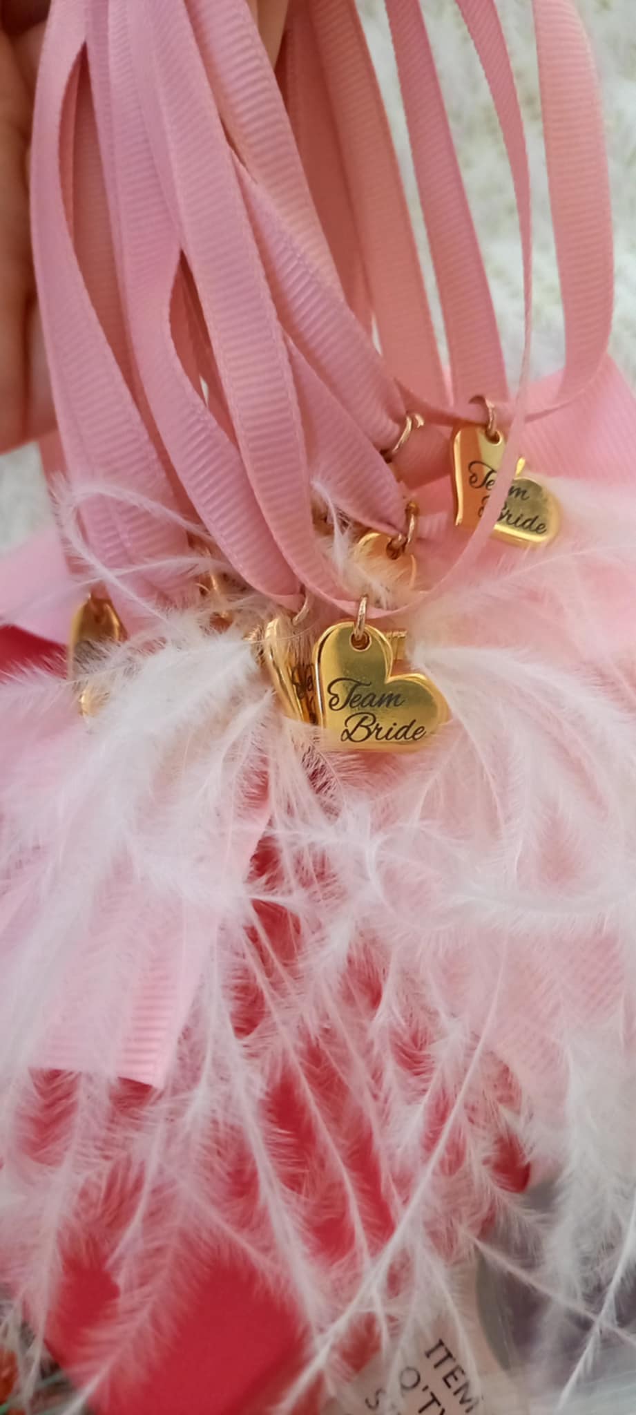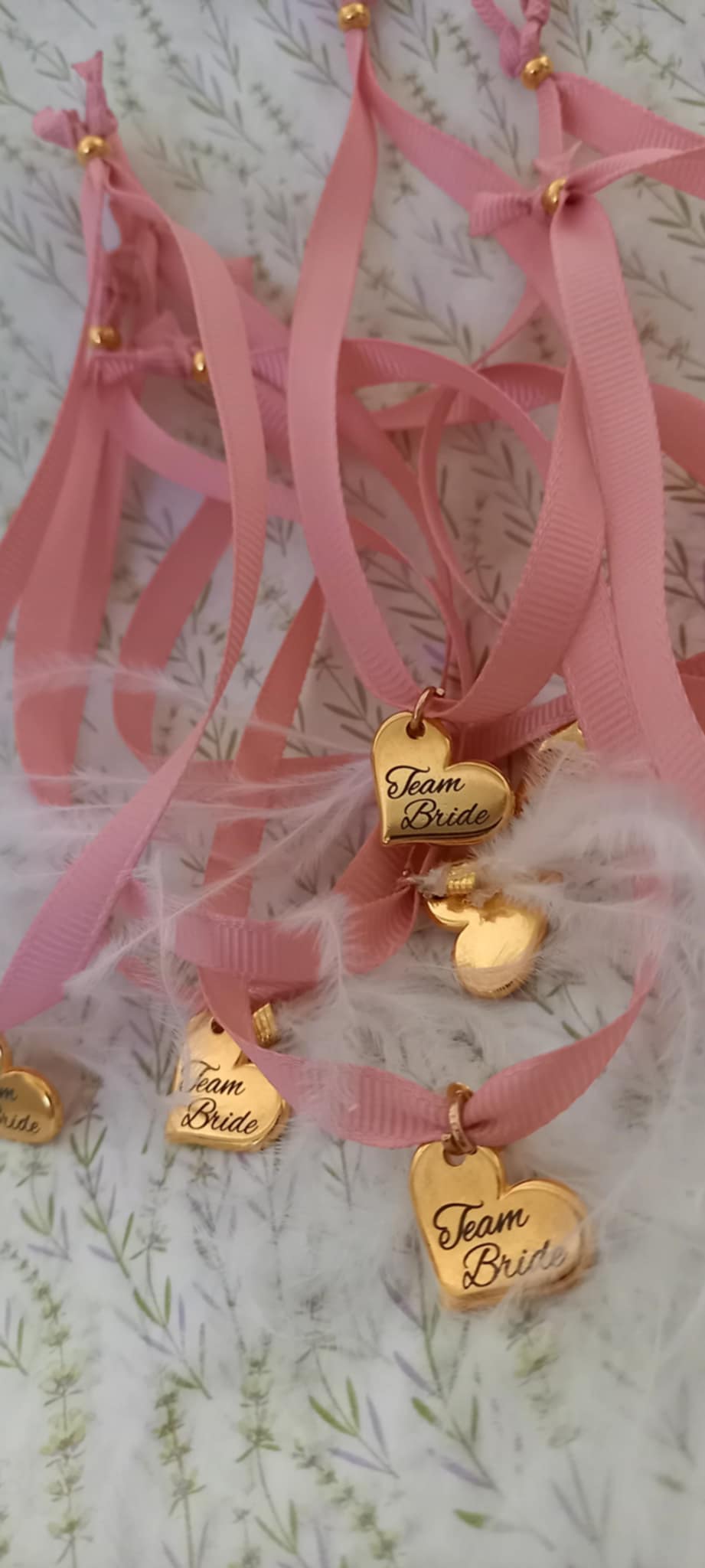Βραχιόλι για bachelor party με κορδέλα σε ροζ χρώμα, επιχρυσωμένη καρδιά team bride και φτερά στην ίδια απόχρωση.