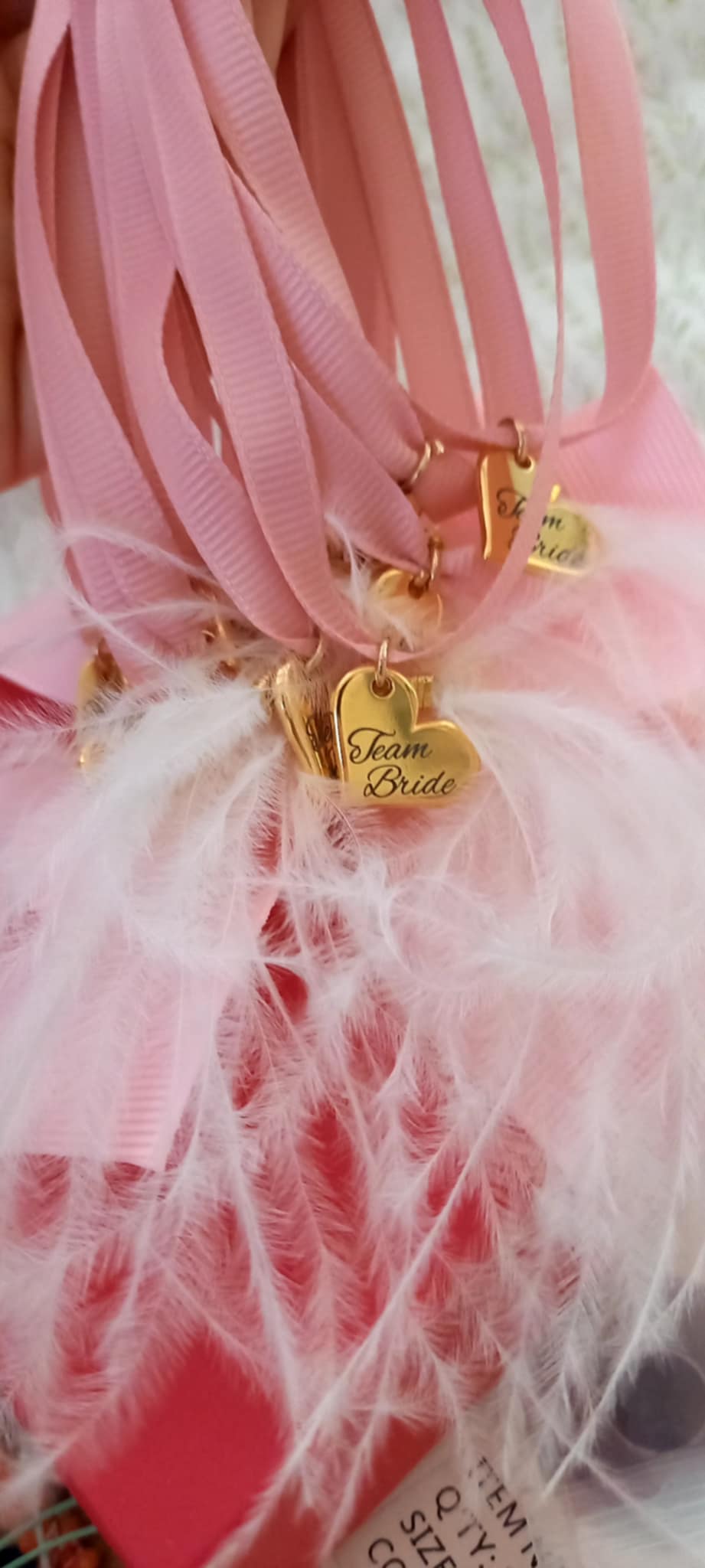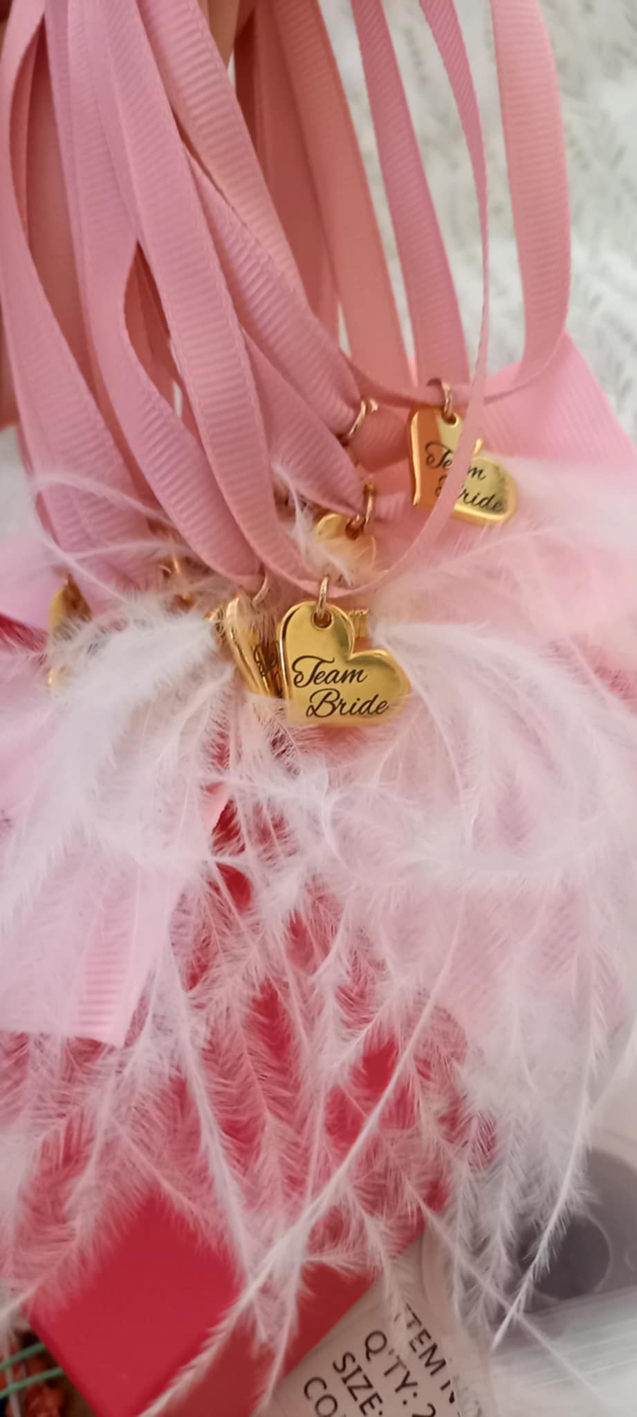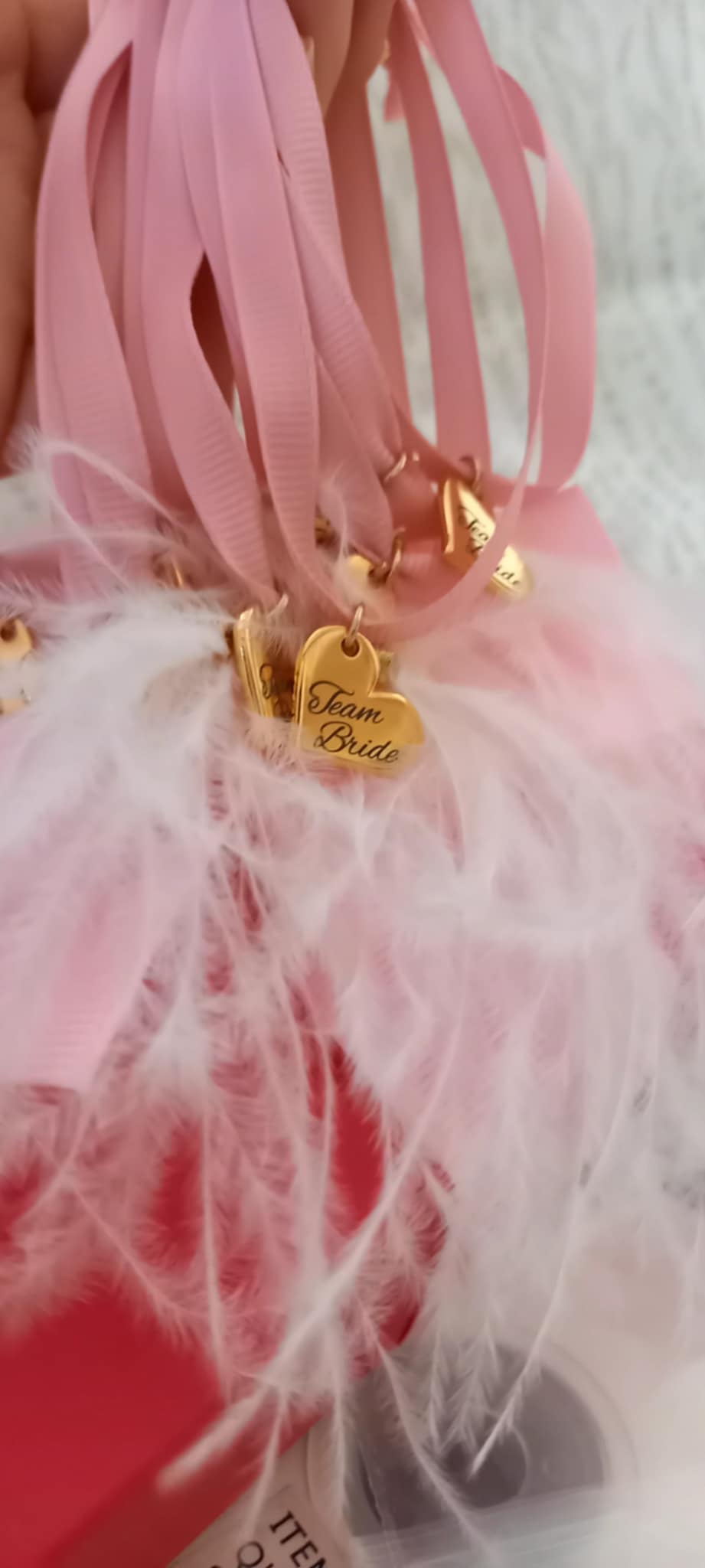 Βραχιόλι για bachelor party με κορδέλα σε ροζ χρώμα, επιχρυσωμένη καρδιά team bride και φτερά στην ίδια απόχρωση.