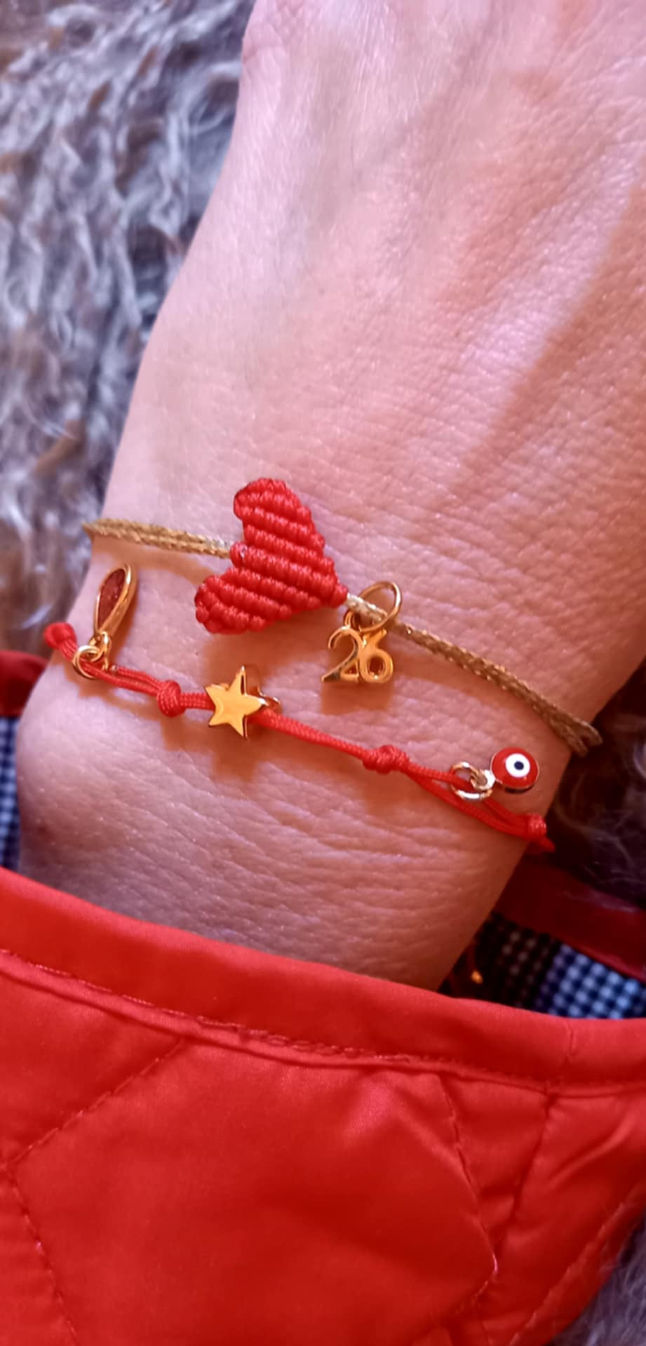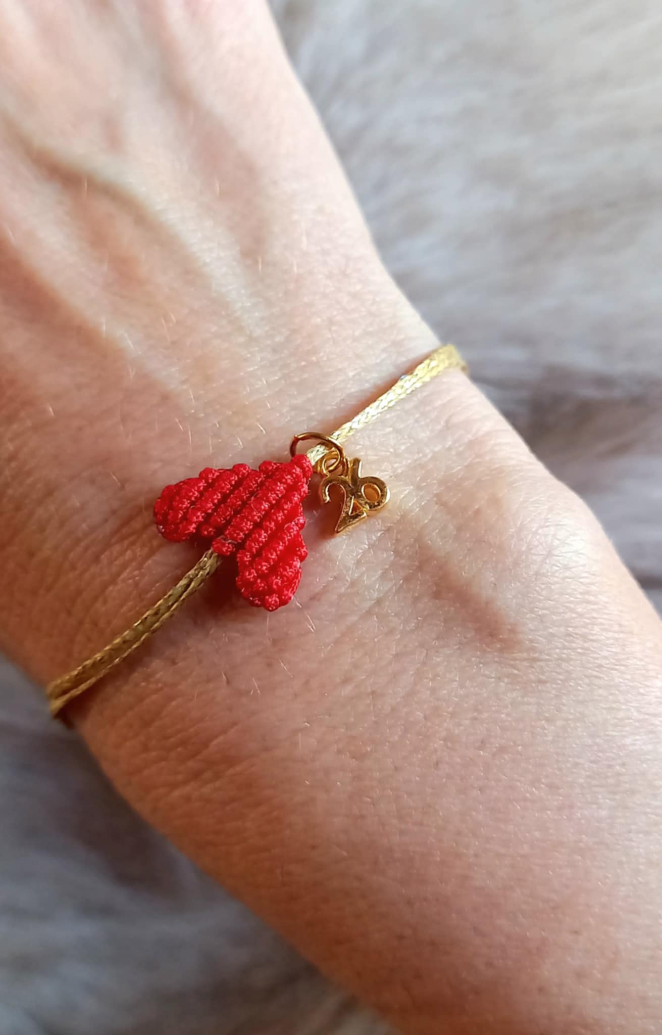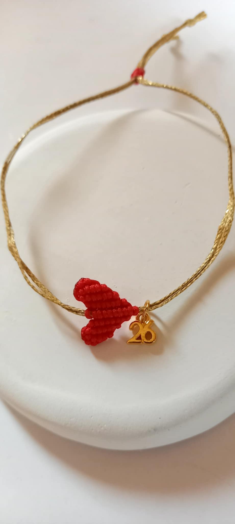 Χειροποίητο βραχιόλι - γούρι με κερωμένο κορδόνι σε χρυσό χρώμα. κόκκινη μακραμέ καρδιά και στοιχείο "26".