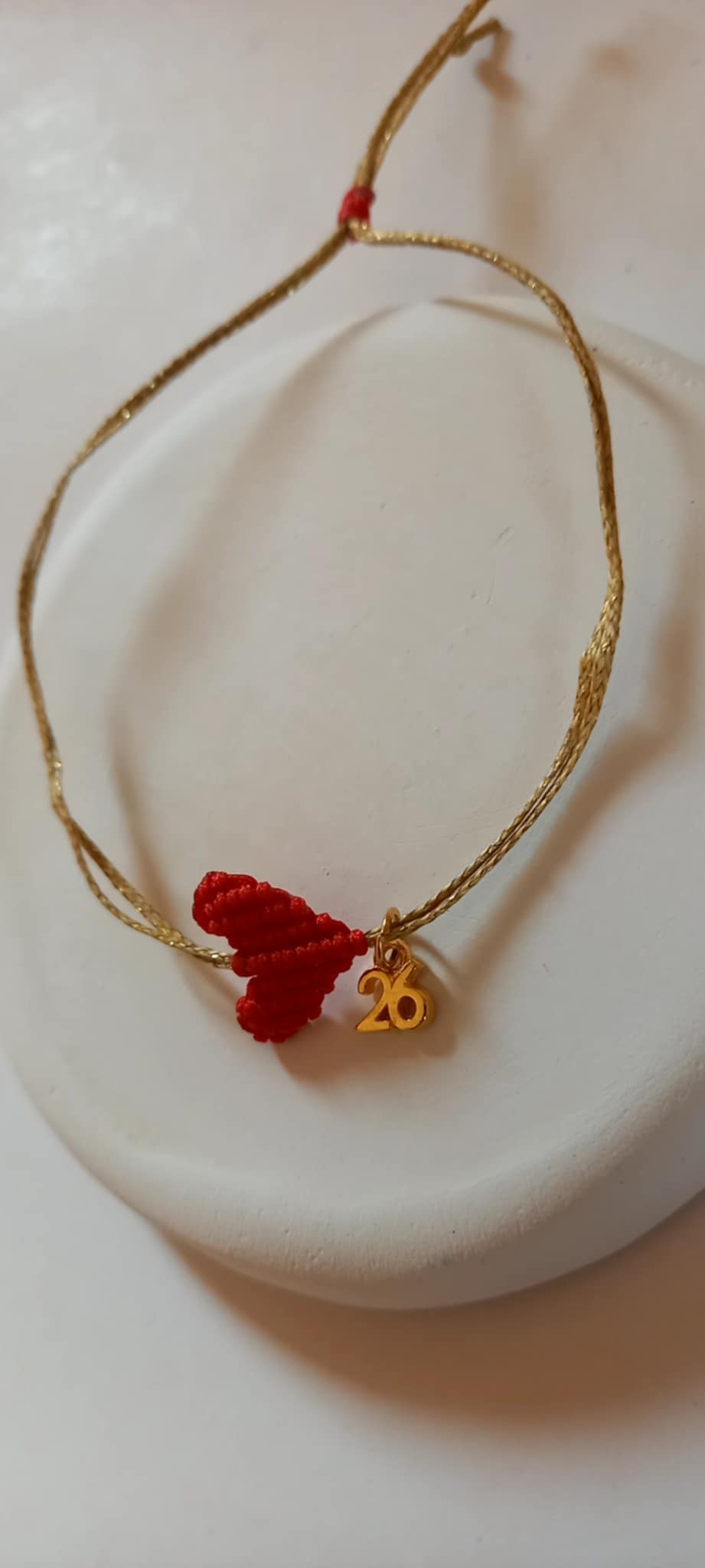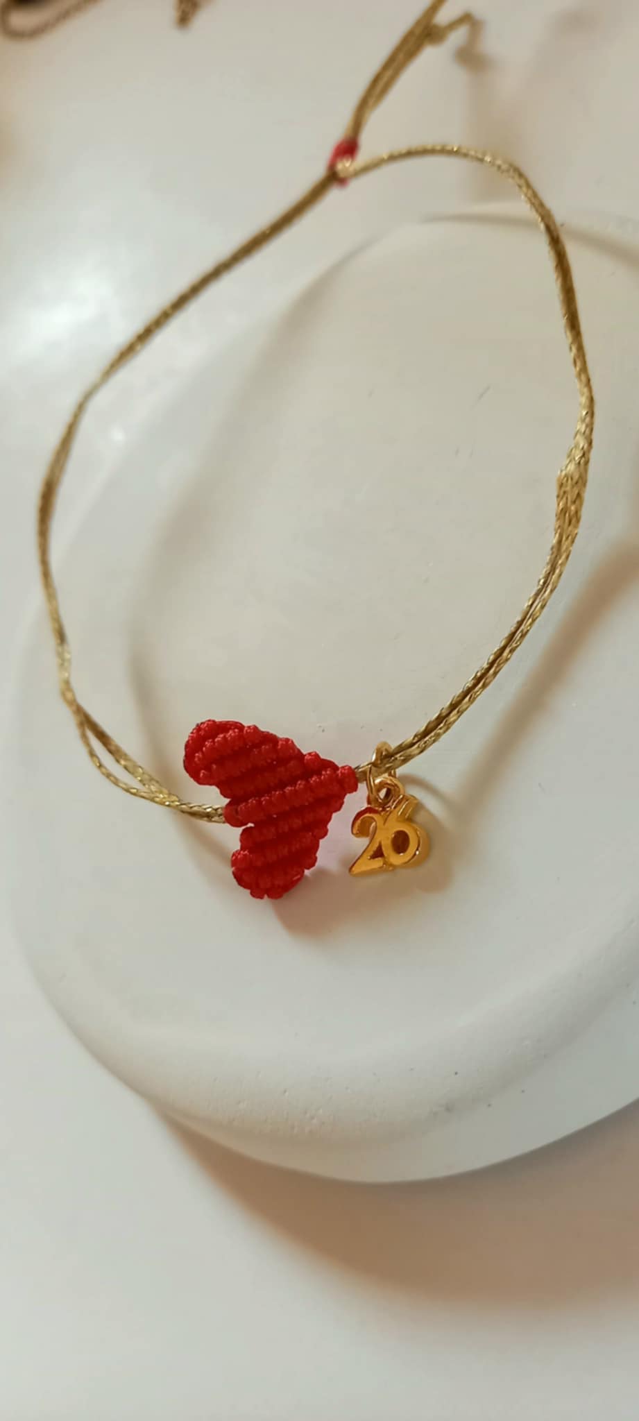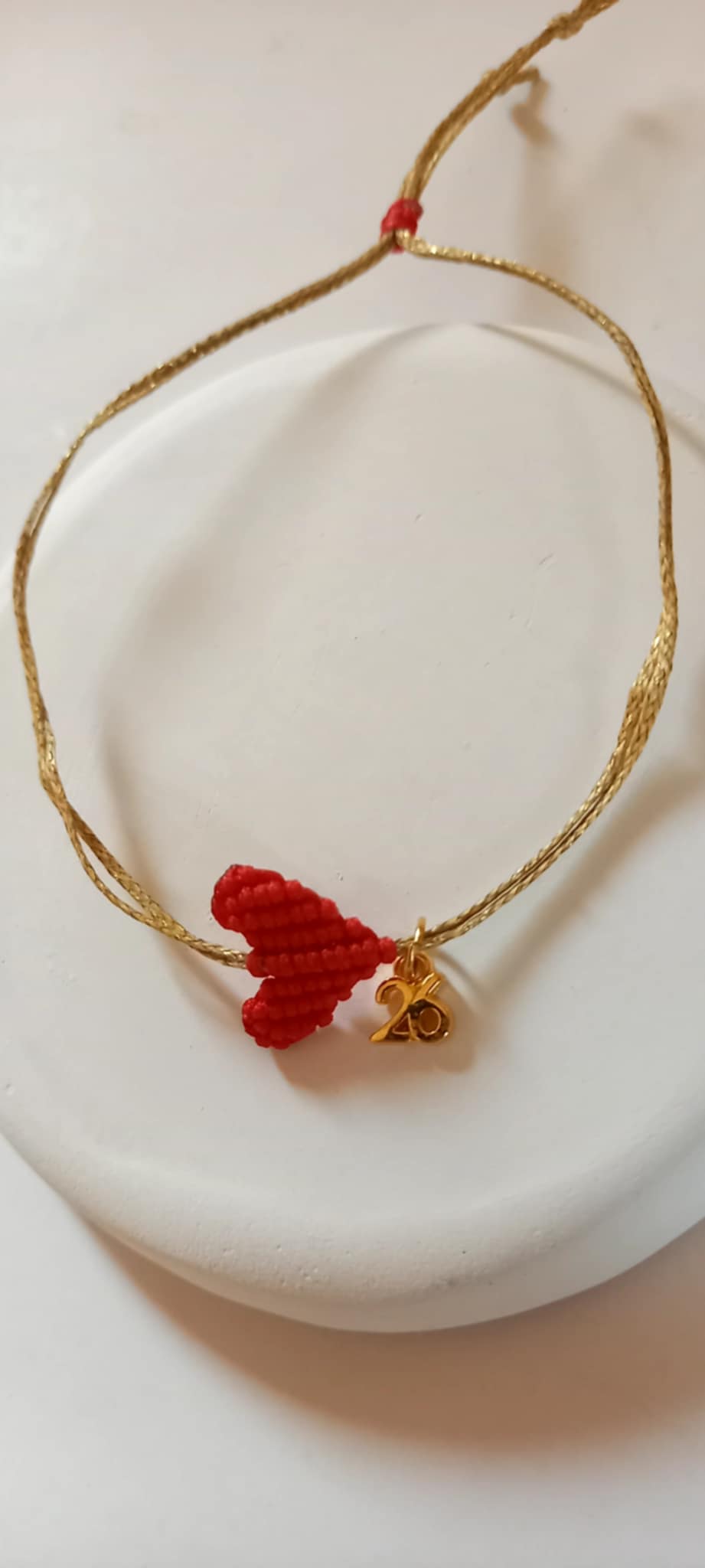Χειροποίητο βραχιόλι - γούρι με κερωμένο κορδόνι σε χρυσό χρώμα. κόκκινη μακραμέ καρδιά και στοιχείο "26".