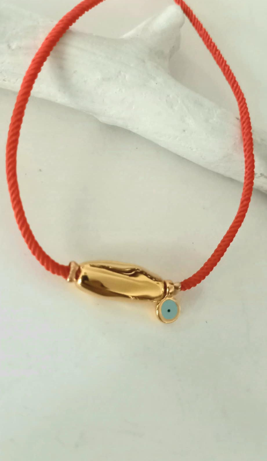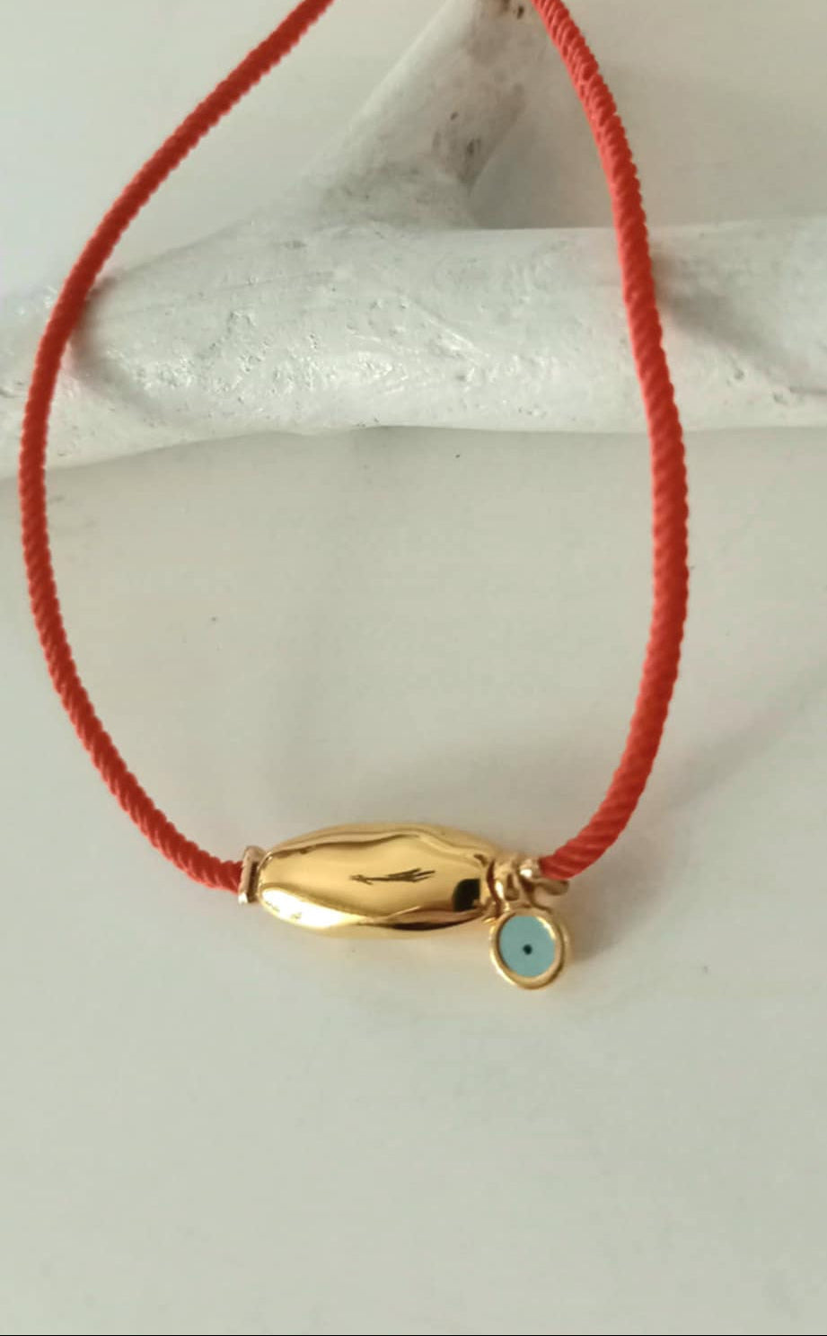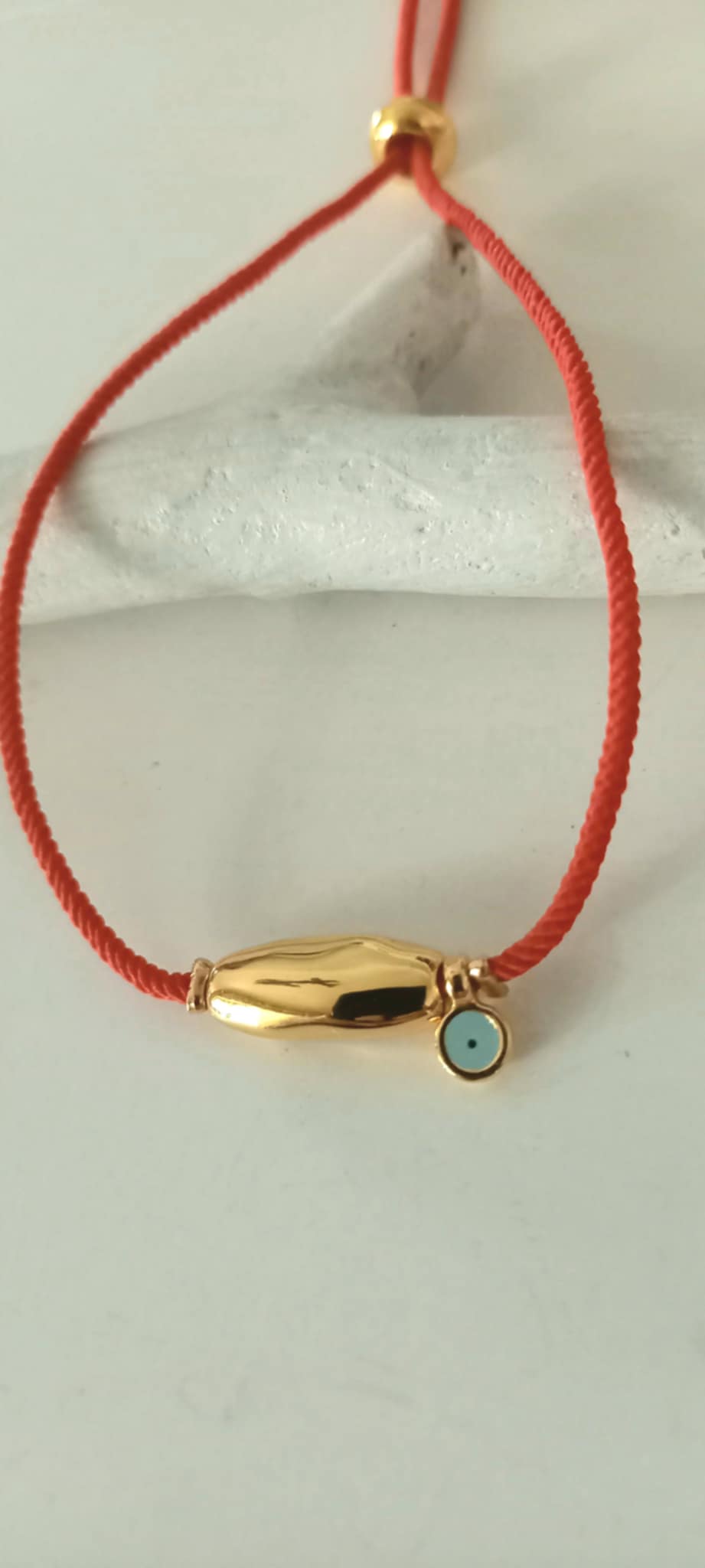 Βραχιόλι μαρτάκι με πολυτελές κόκκινο κορδόνι, επιχρυσωμένη μπάρα και ματάκι με σμάλτο σε απαλό γαλάζιο.