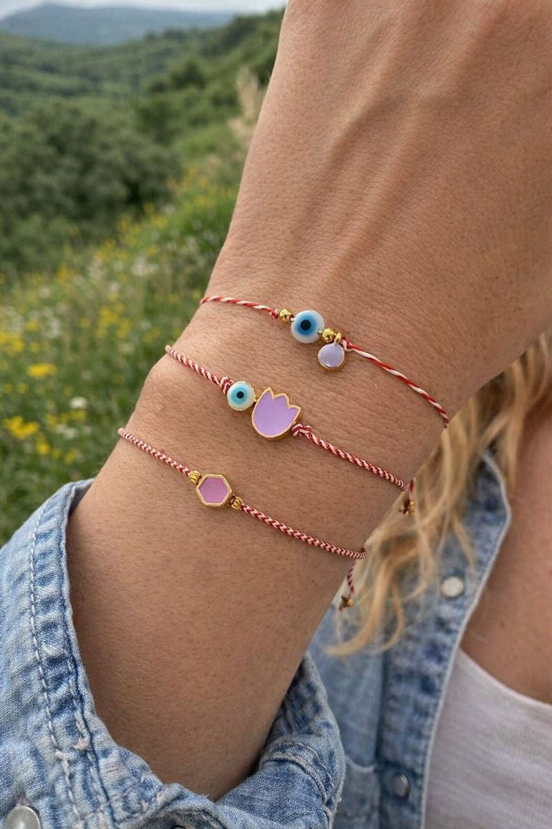 Χειροποίητο βραχιόλι μαρτάκι με λευκό μάτι, επιχρυσωμένο στοιχείο με σμάλτο σε λιλά απόχρωση και χρυσή λεπτομέρεια.
