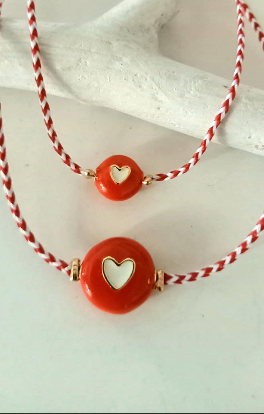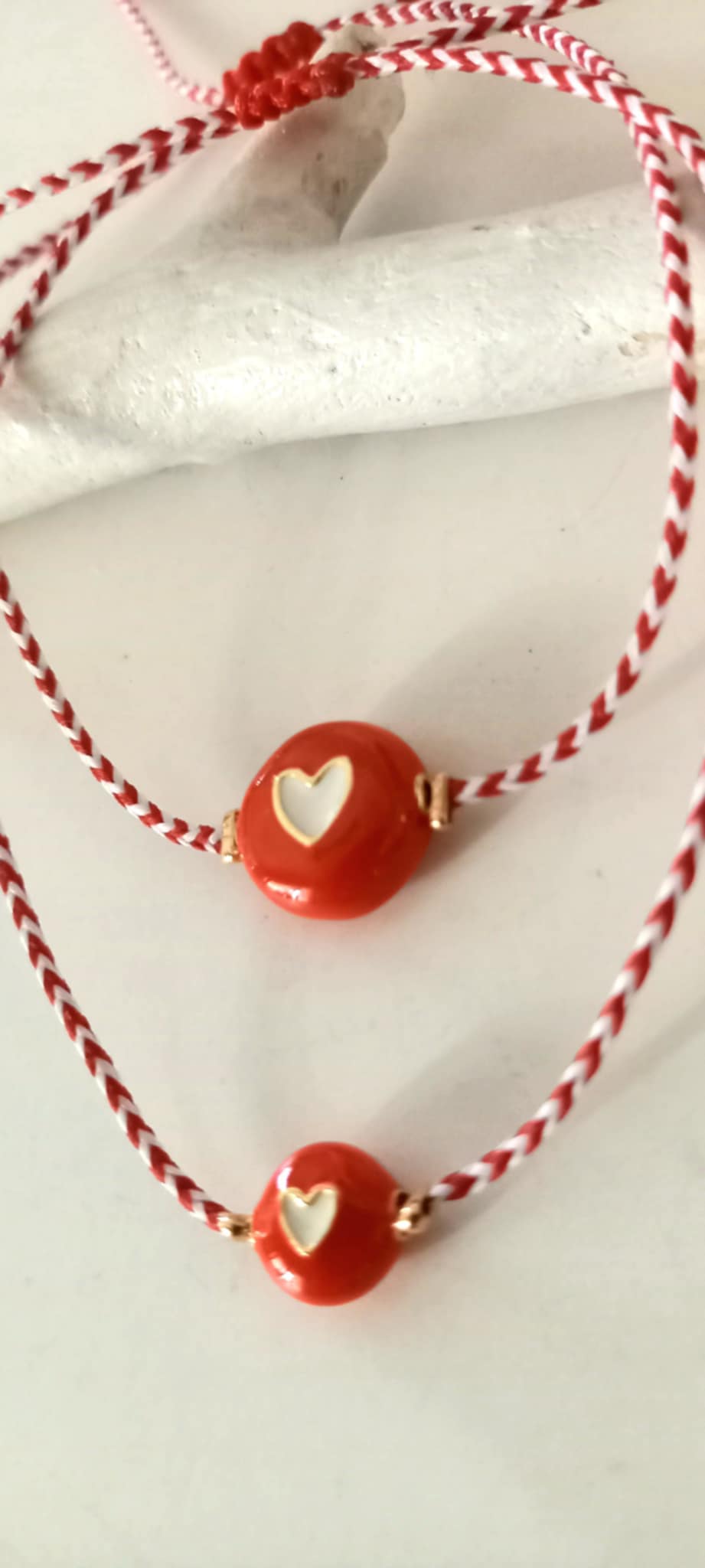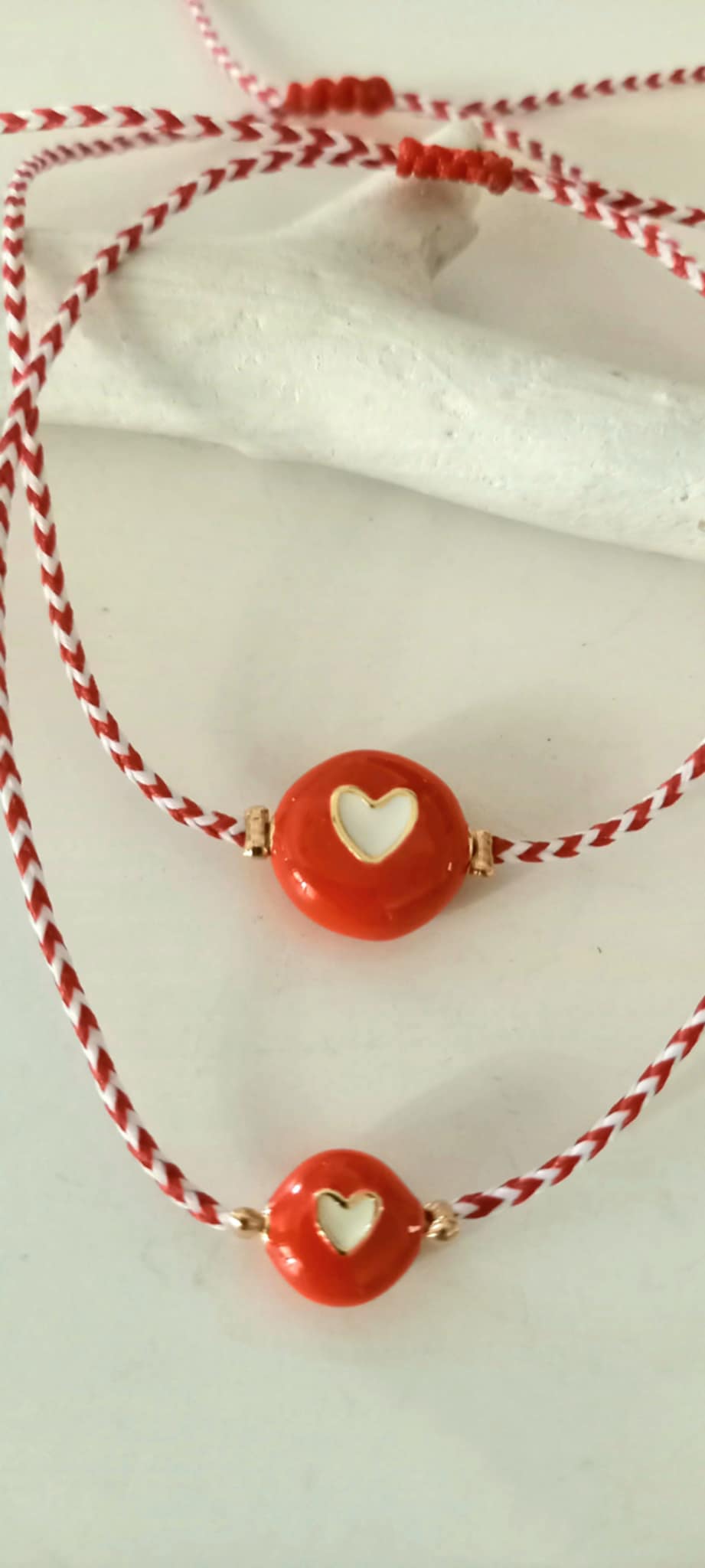 Βραχιόλι μαρτάκι με κορδόνι σε λευκό - κόκκινο χρώμα και μοτίφ καρδιά με σμάλτο.