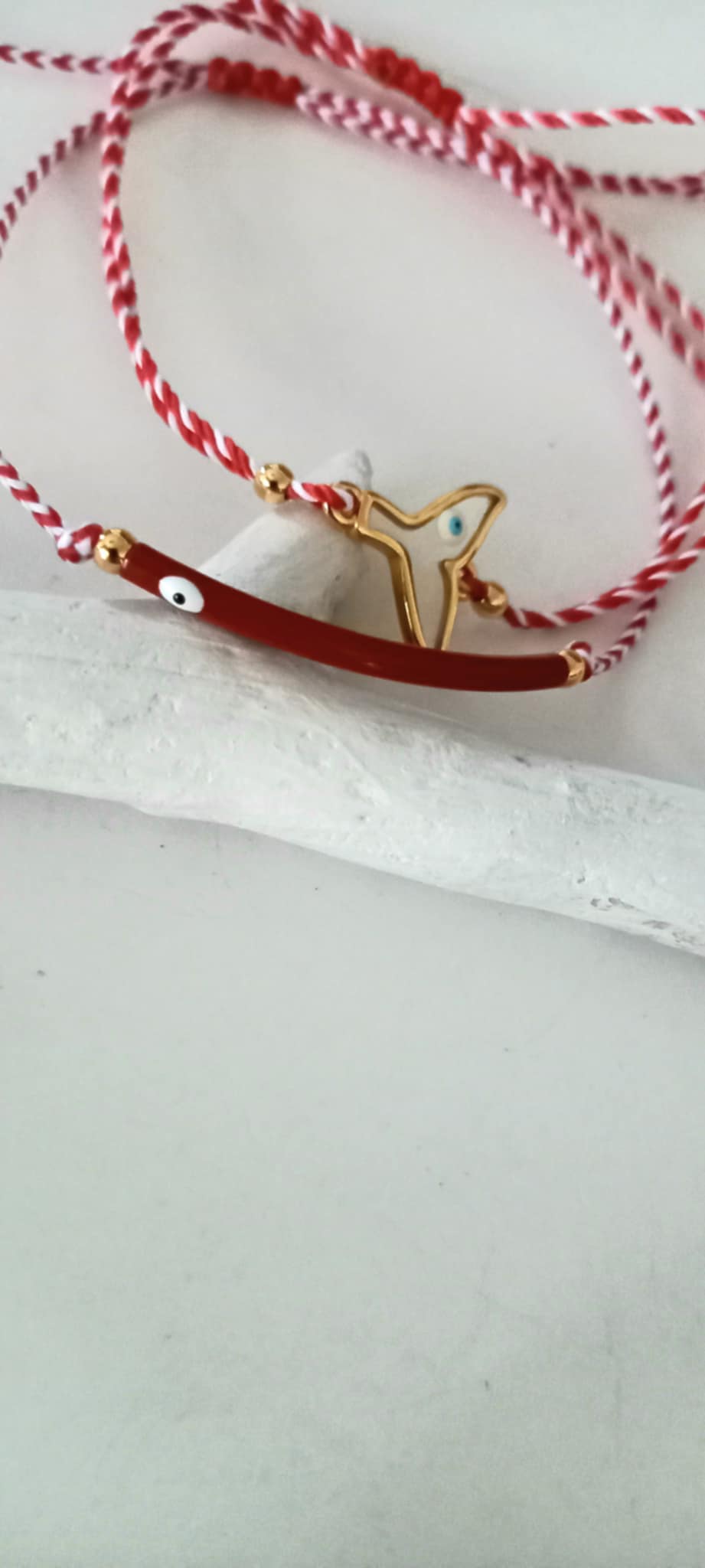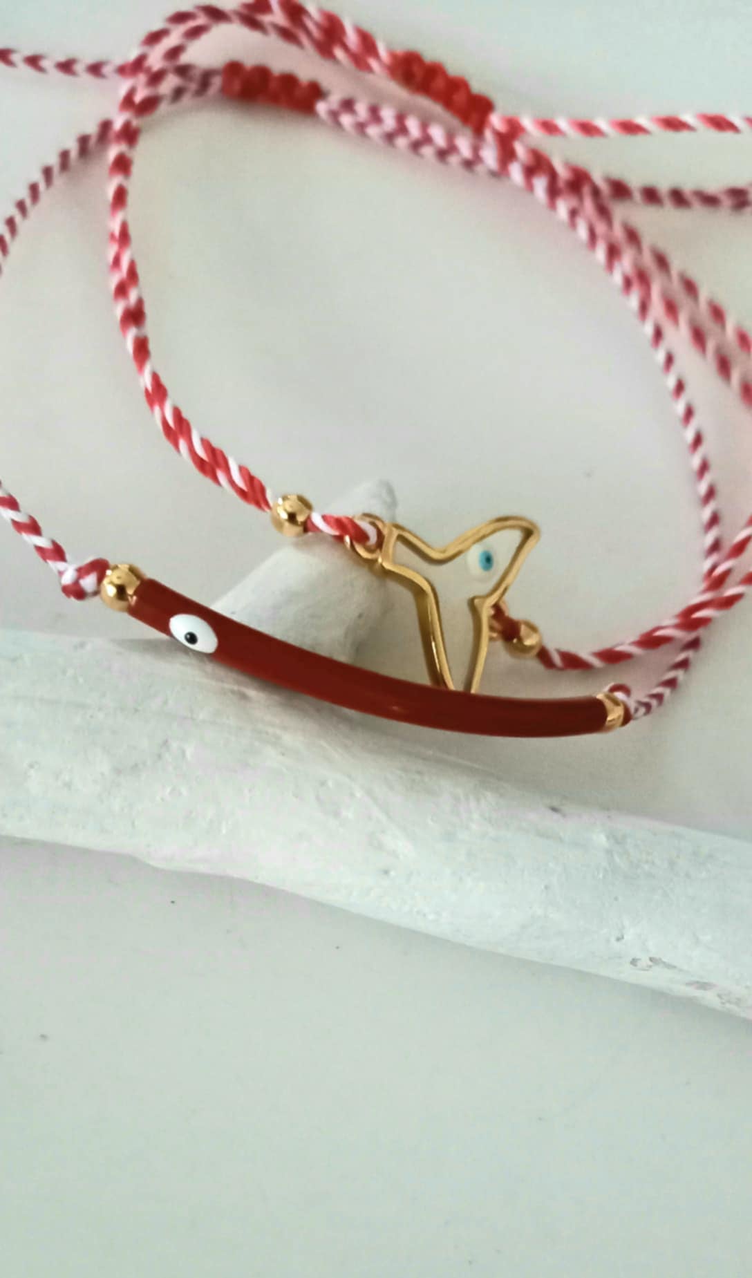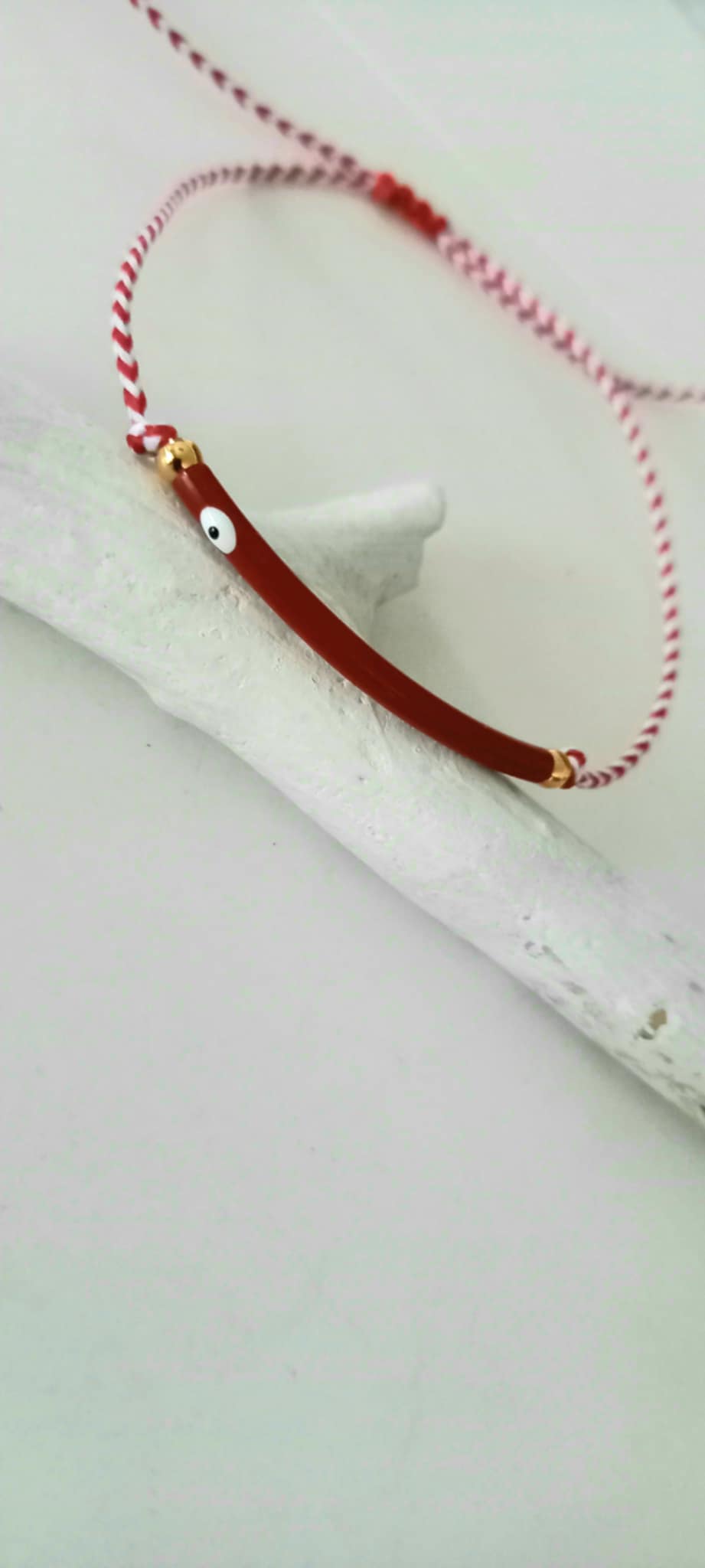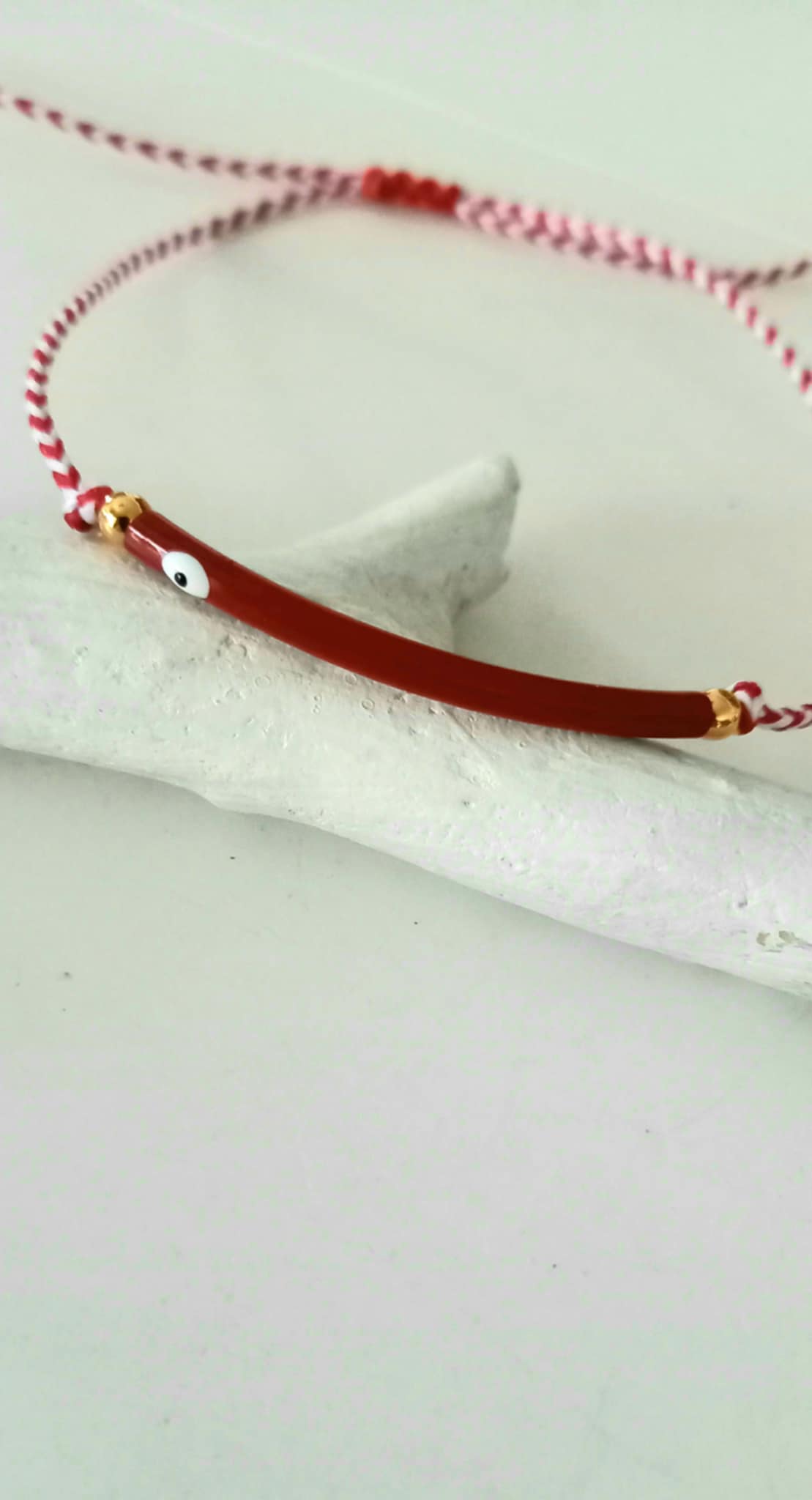 Βραχιόλι μαρτάκι με λευκό - κόκκινο κορδόνι, μπάρα με σμάλτο και μάτι σε βαθύ κόκκινο χρώμα και χρυσές λεπτομέρειες.