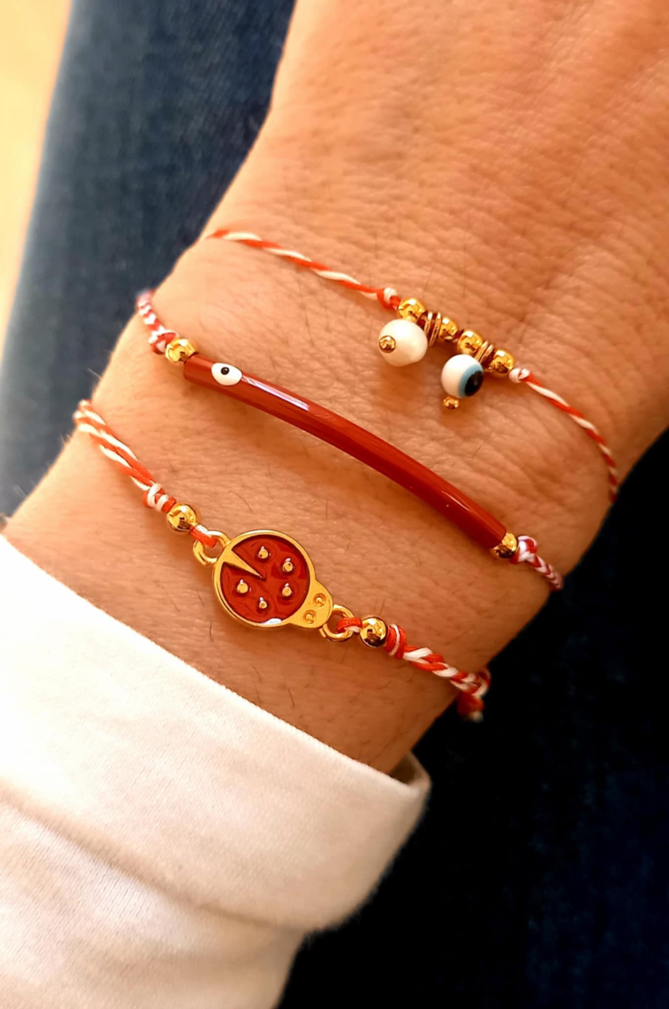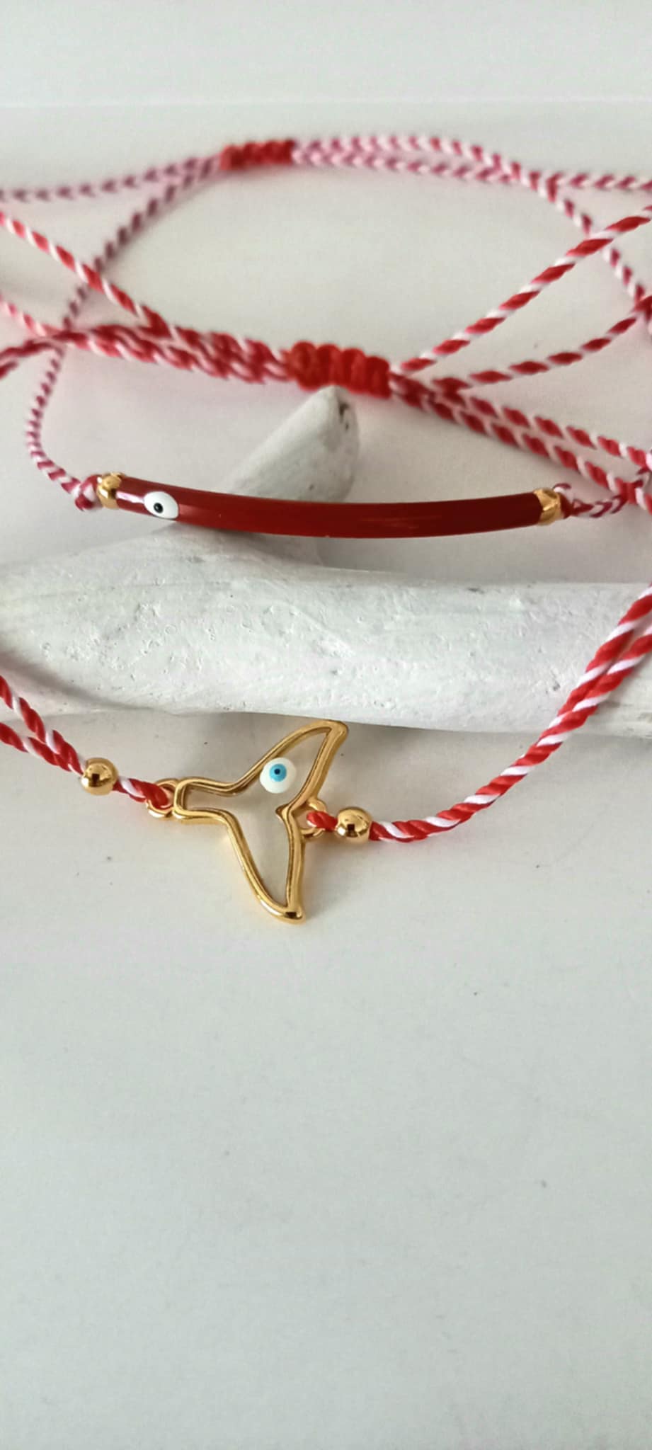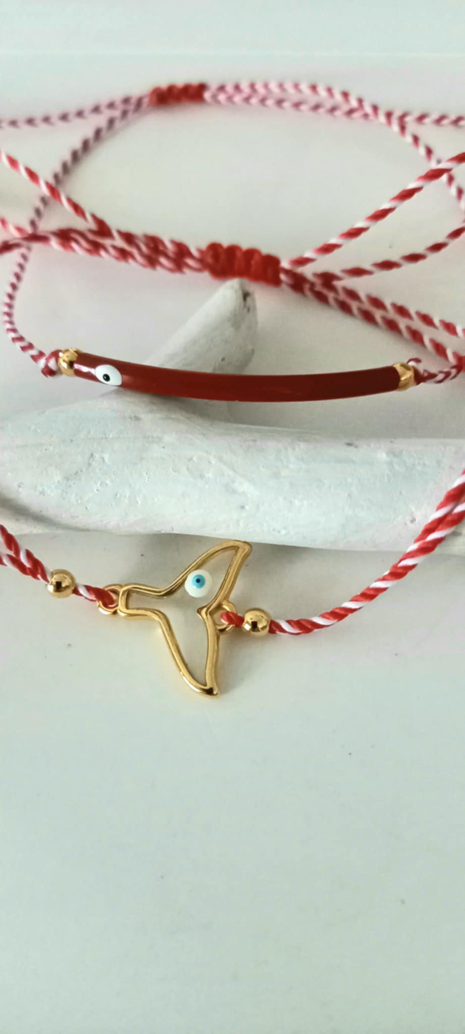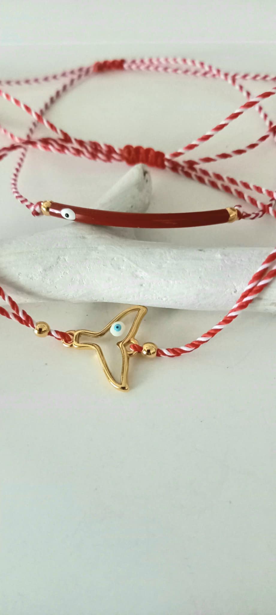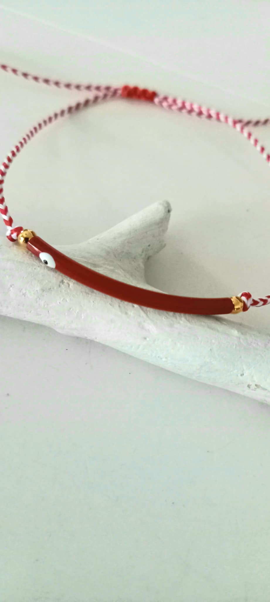 Βραχιόλι μαρτάκι με λευκό - κόκκινο κορδόνι, μπάρα με σμάλτο και μάτι σε βαθύ κόκκινο χρώμα και χρυσές λεπτομέρειες.
