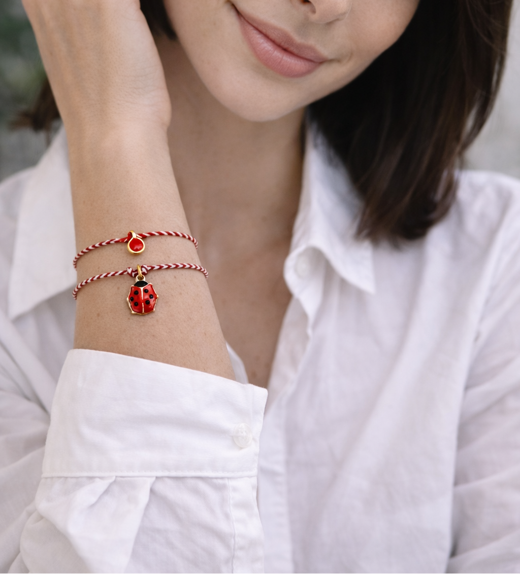 Βραχιόλι μαρτάκι με λευκό - κόκκινο κορδόνι και χαρούμενο μοτίφ πασχαλίτσα με ροζ ή κόκκινο σμάλτο.
