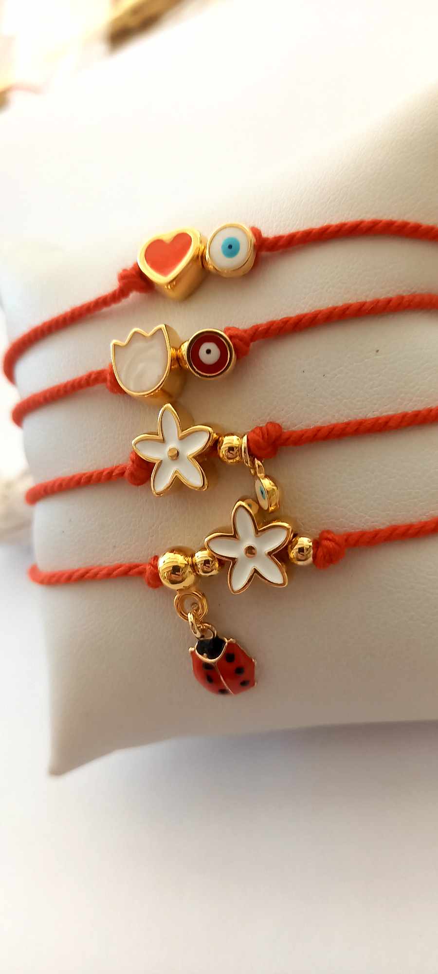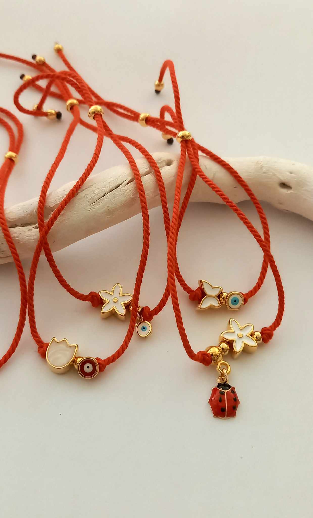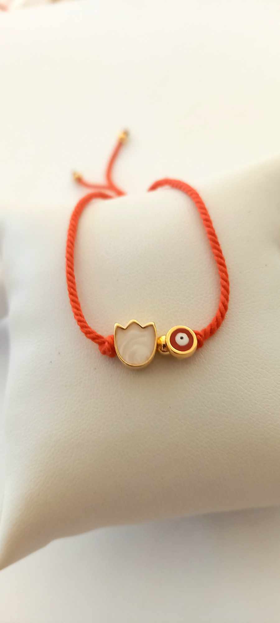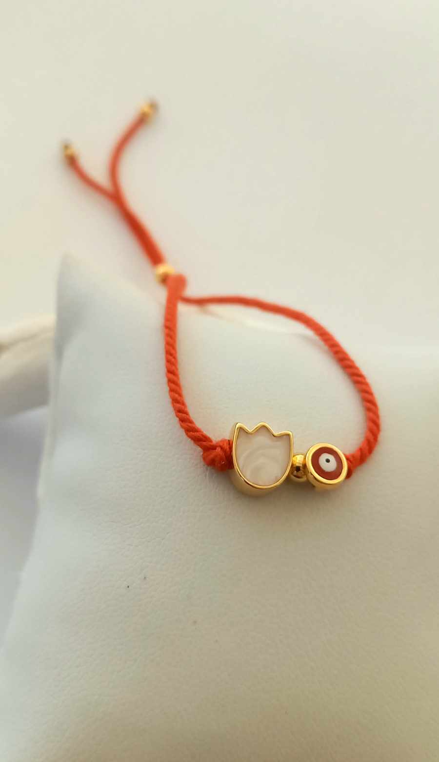 Βραχιόλι μαρτάκι με βαμβακερό κορδόι σε κόκκινο χρώμα, επιχρυσωμένο στοιχείο τουλίπα σε ιβουάρ απόχρωση και ματάκι με σμάλτο σε κόκκινο χρώμα.