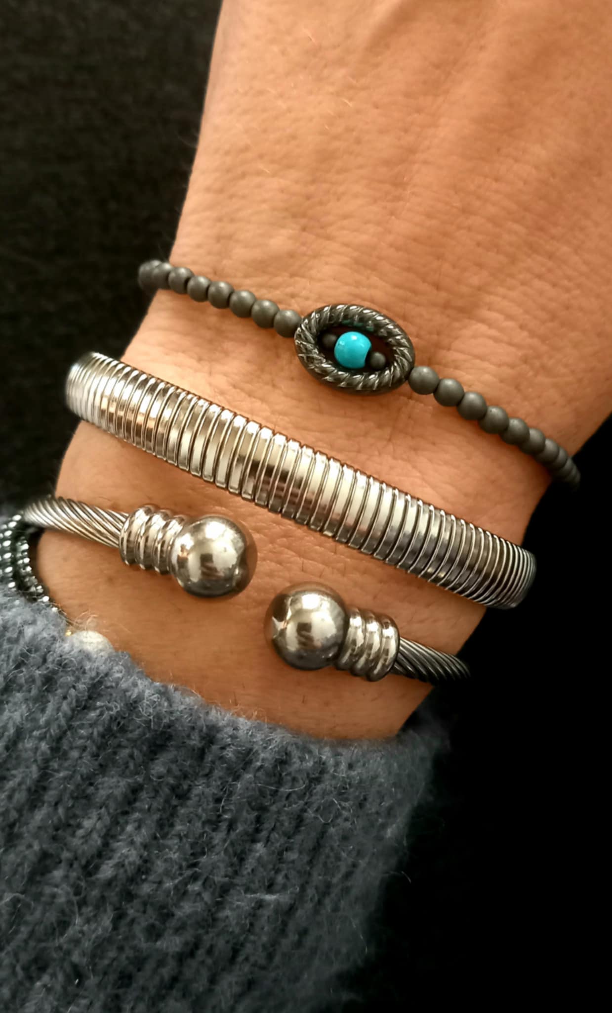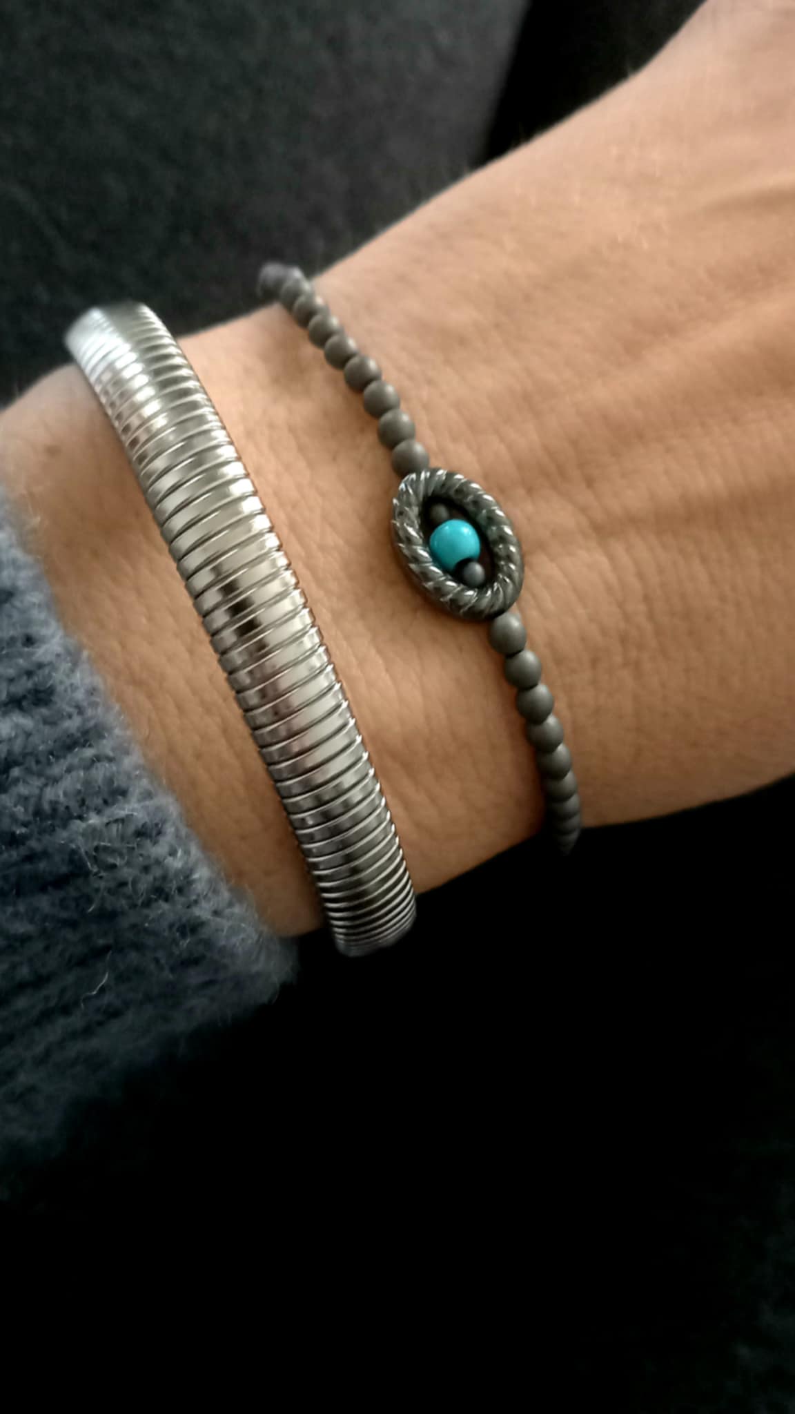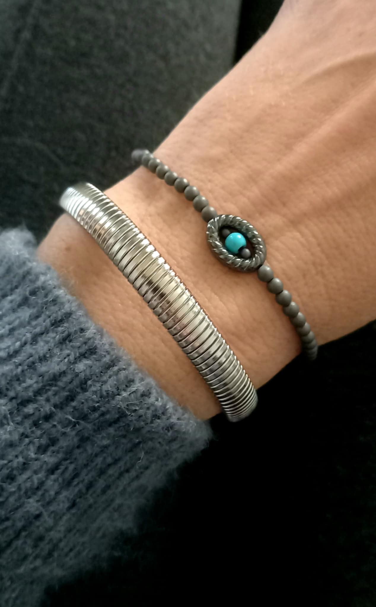 Κομψό βραχιόλι με ματ αιματίτες, μοτίφ αιματίτη και ημιπολύτιμη πέτρα χαολίτη.