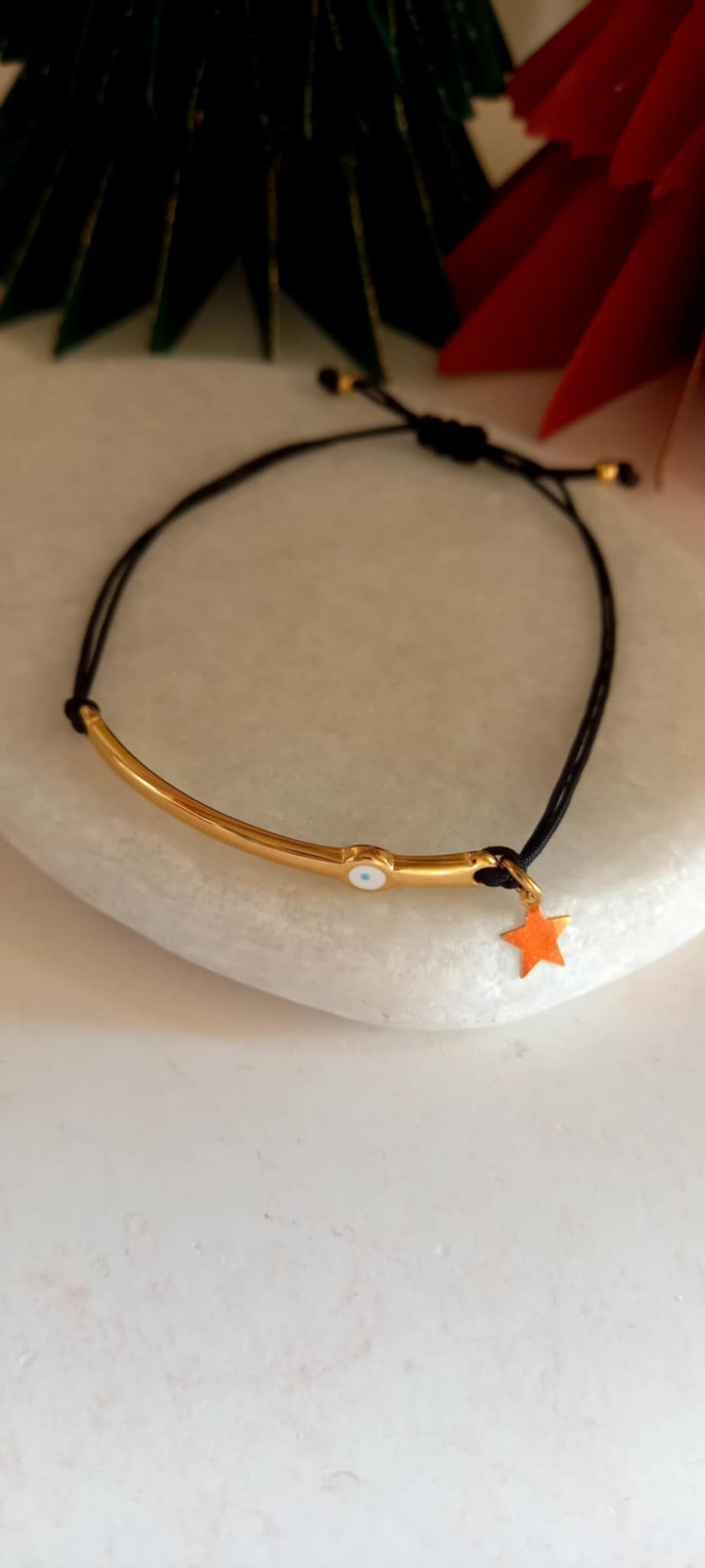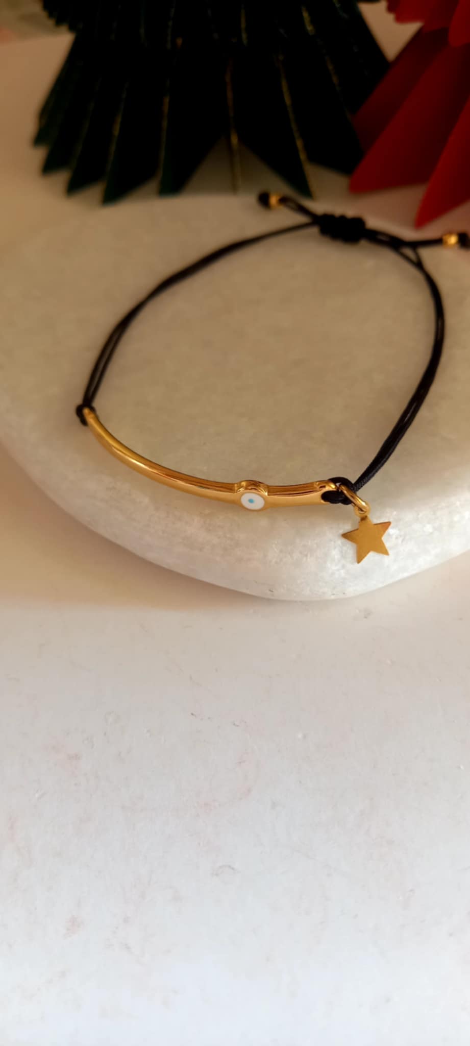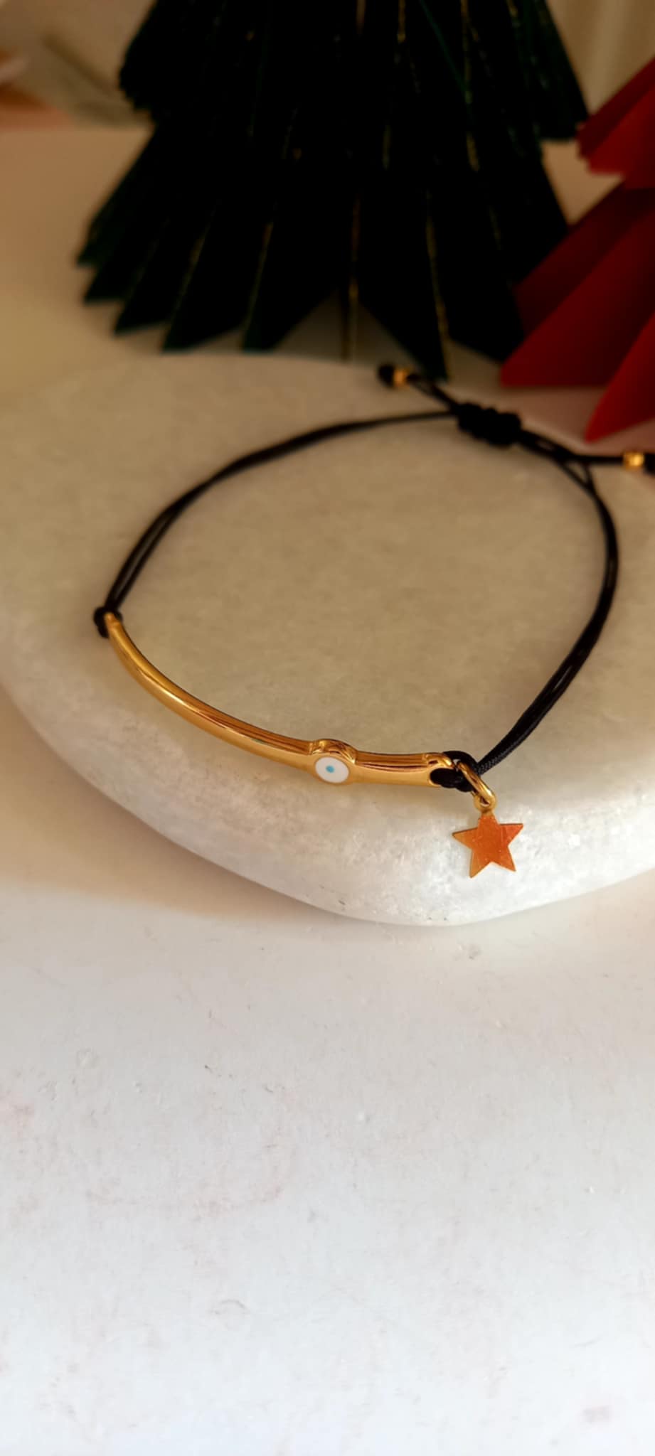 Βραχιόλι με κορδόνι σε μαύρο χρώμα, επιχρυσωμένη μπάρα με μάτι και μοτίφ αστέρι από ατσάλι.