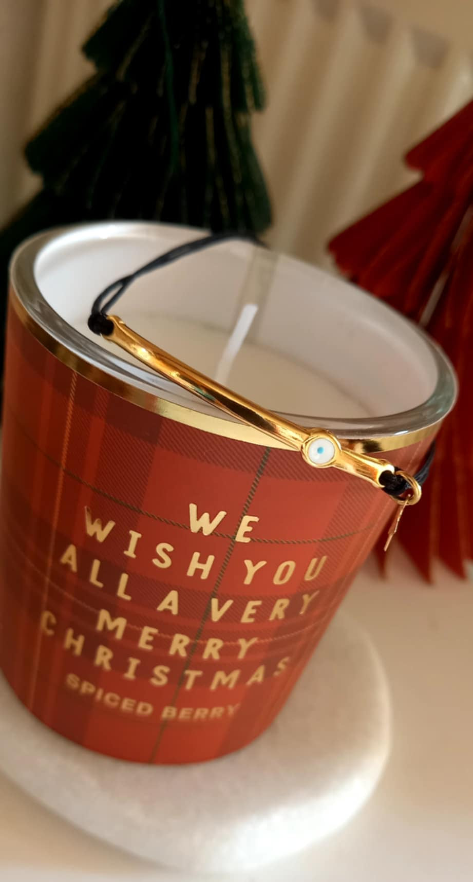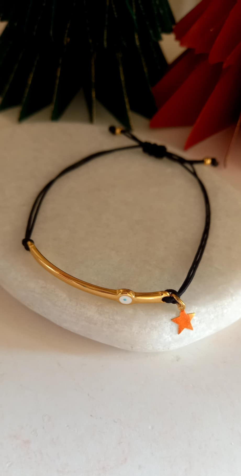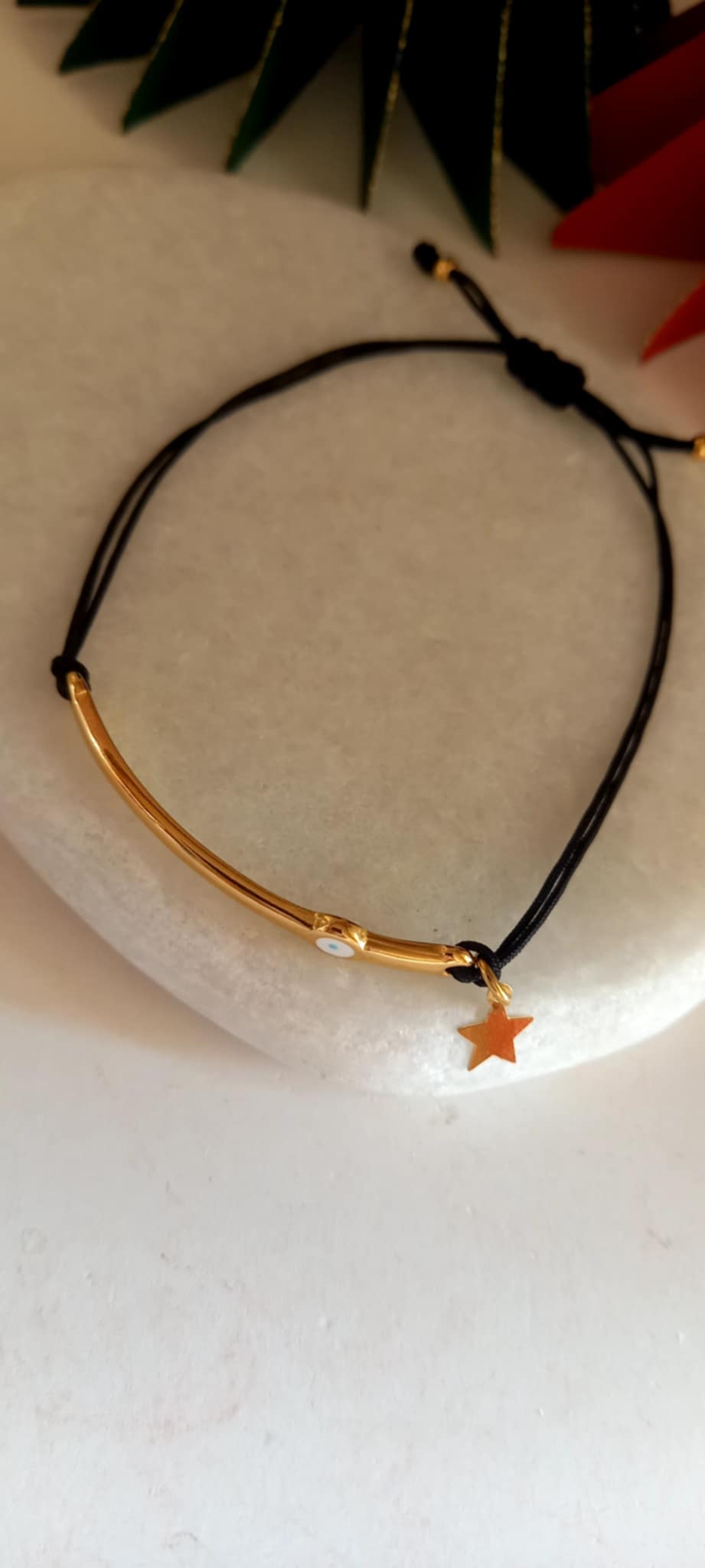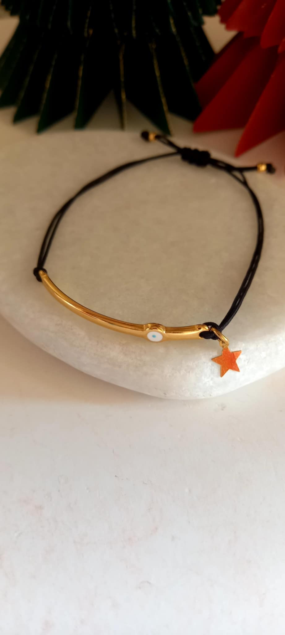Βραχιόλι με κορδόνι σε μαύρο χρώμα, επιχρυσωμένη μπάρα με μάτι και μοτίφ αστέρι από ατσάλι.