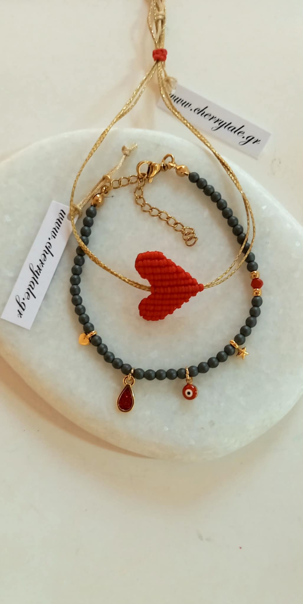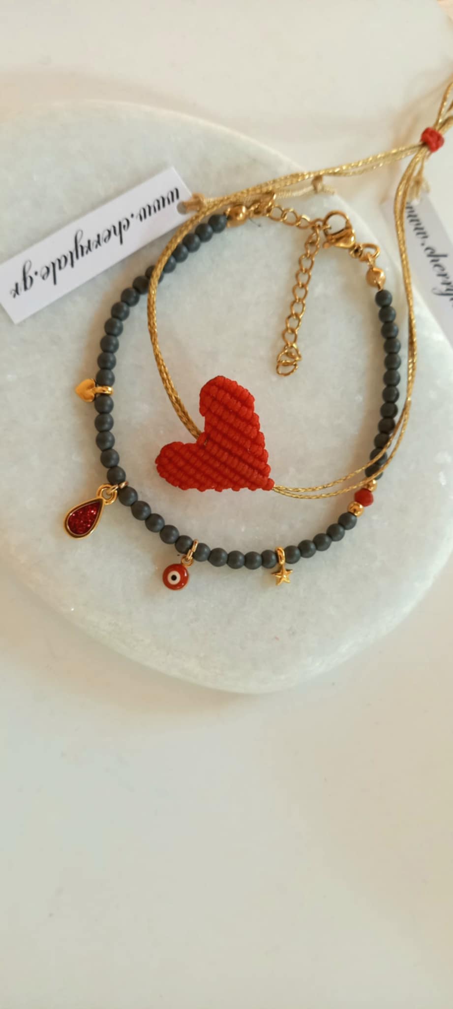 Χειροποίητο βραχιόλι με χρυσό κερωμένο κορδόνι και καρδιά μακραμέ σε κόκκινο χρώμα.