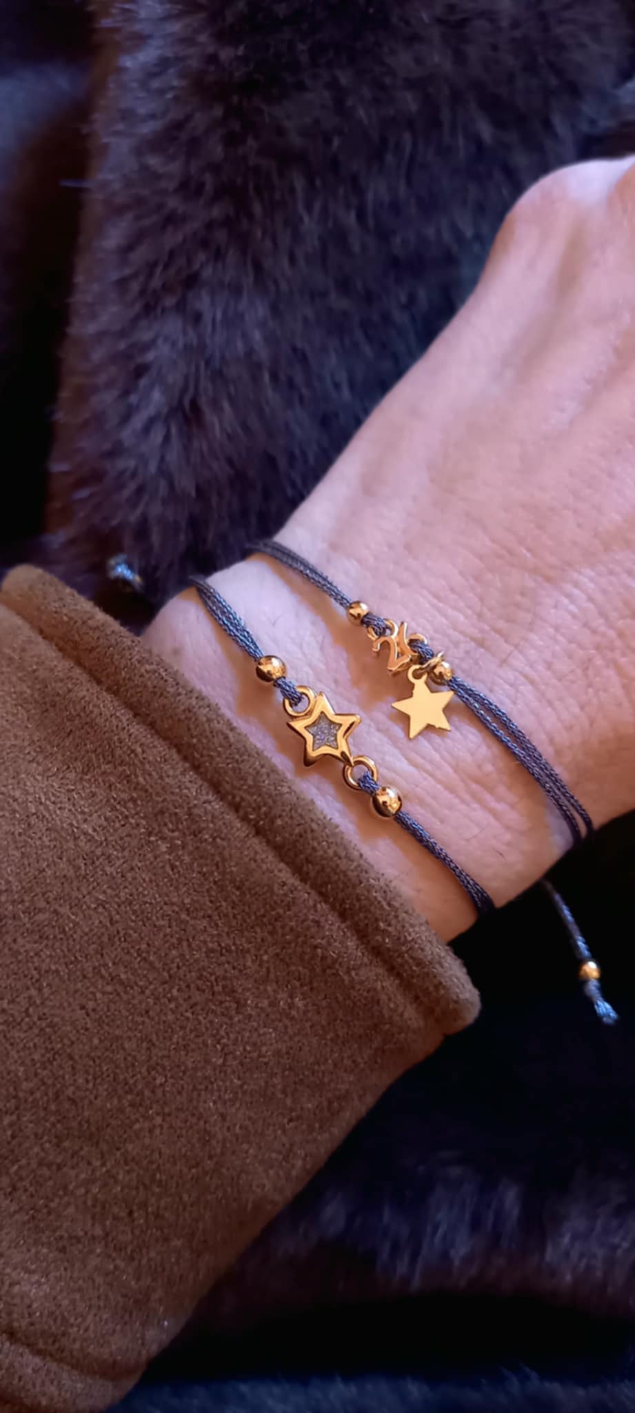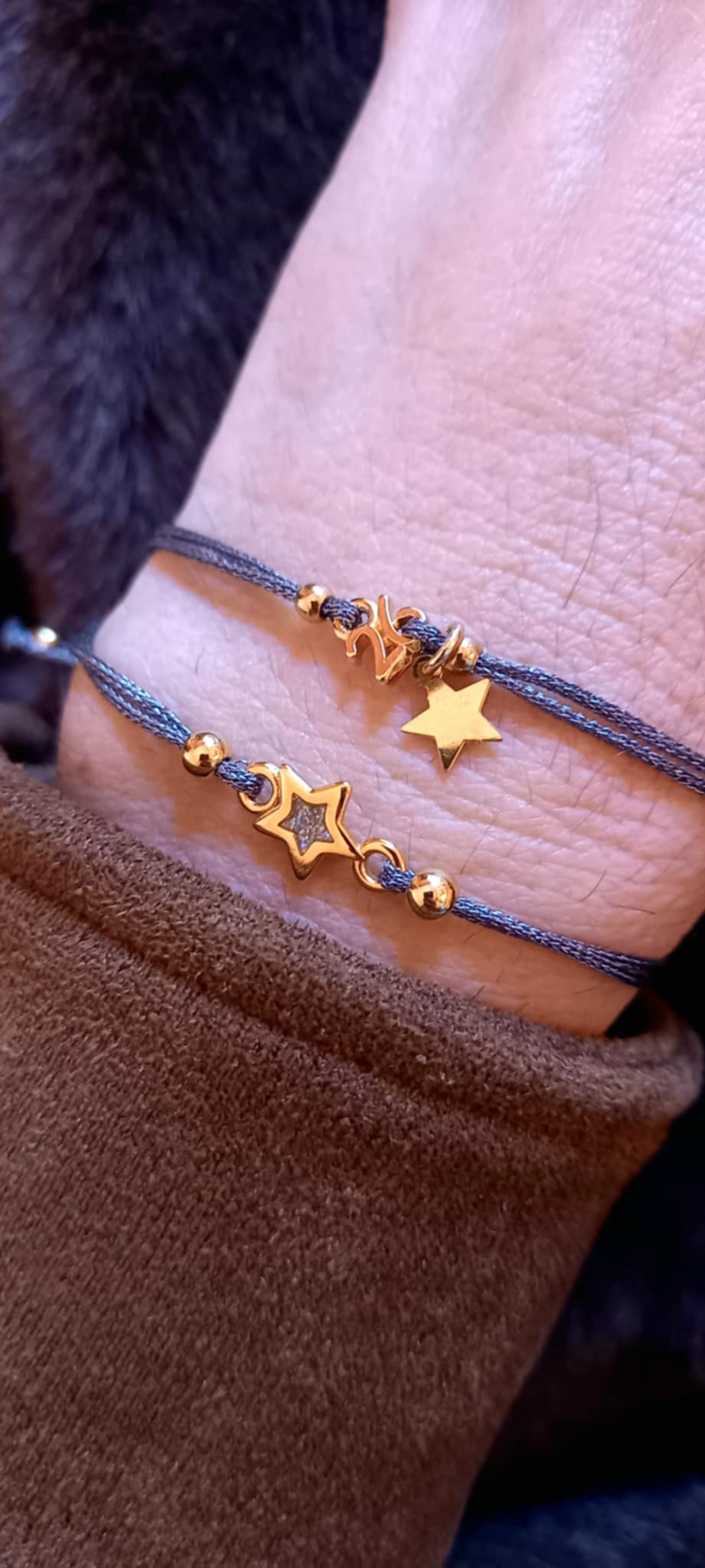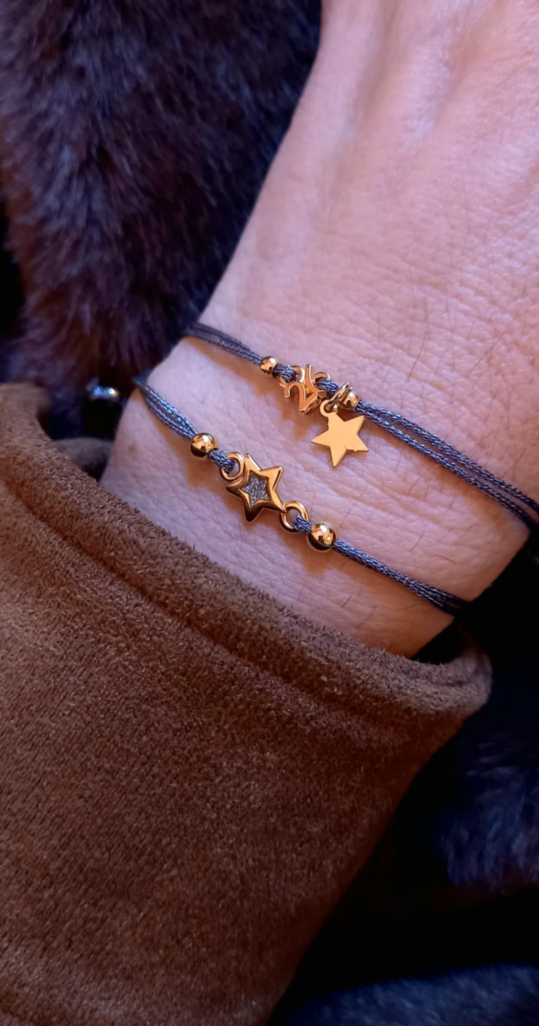 Βραχιόλι γούρι 2026 με κορδόνι σε γκρι μεταλλικό χρώμα, ατσάλινο αστέρι και χρυσές λεπτομέρειες.
