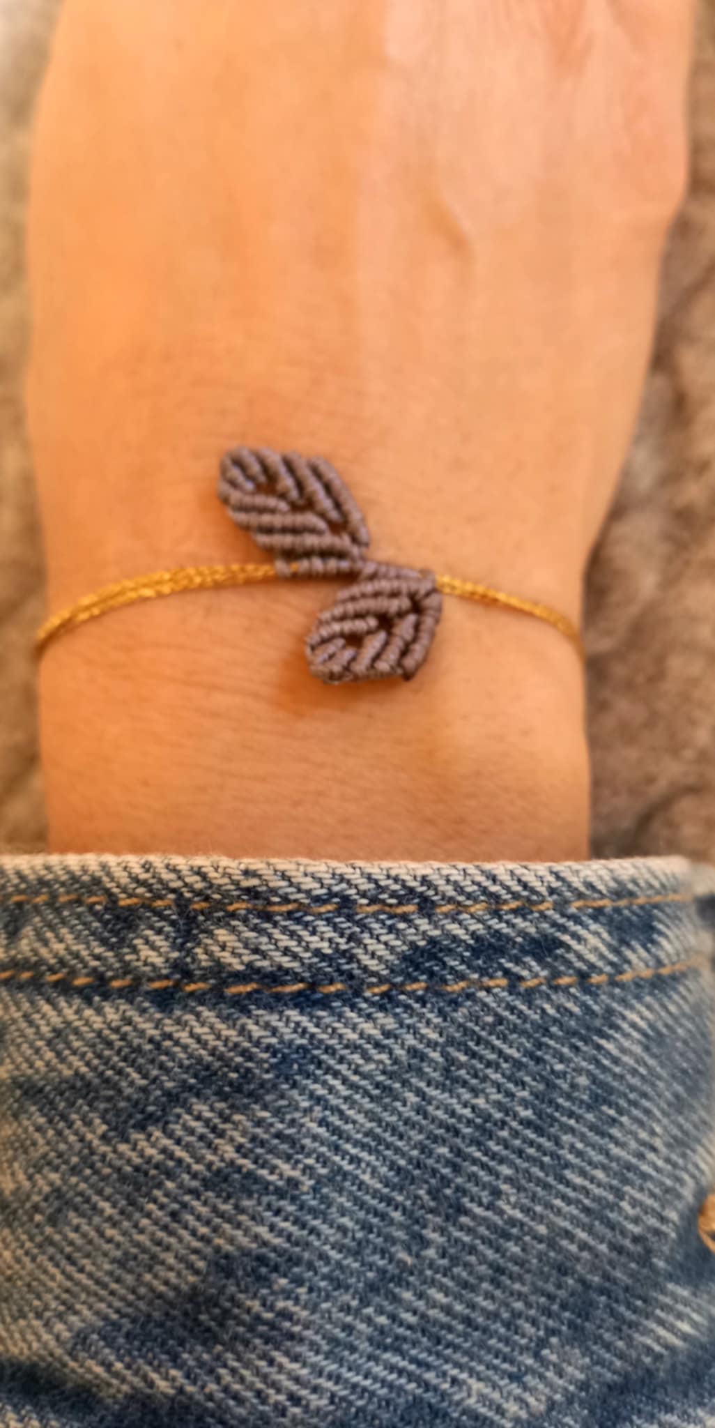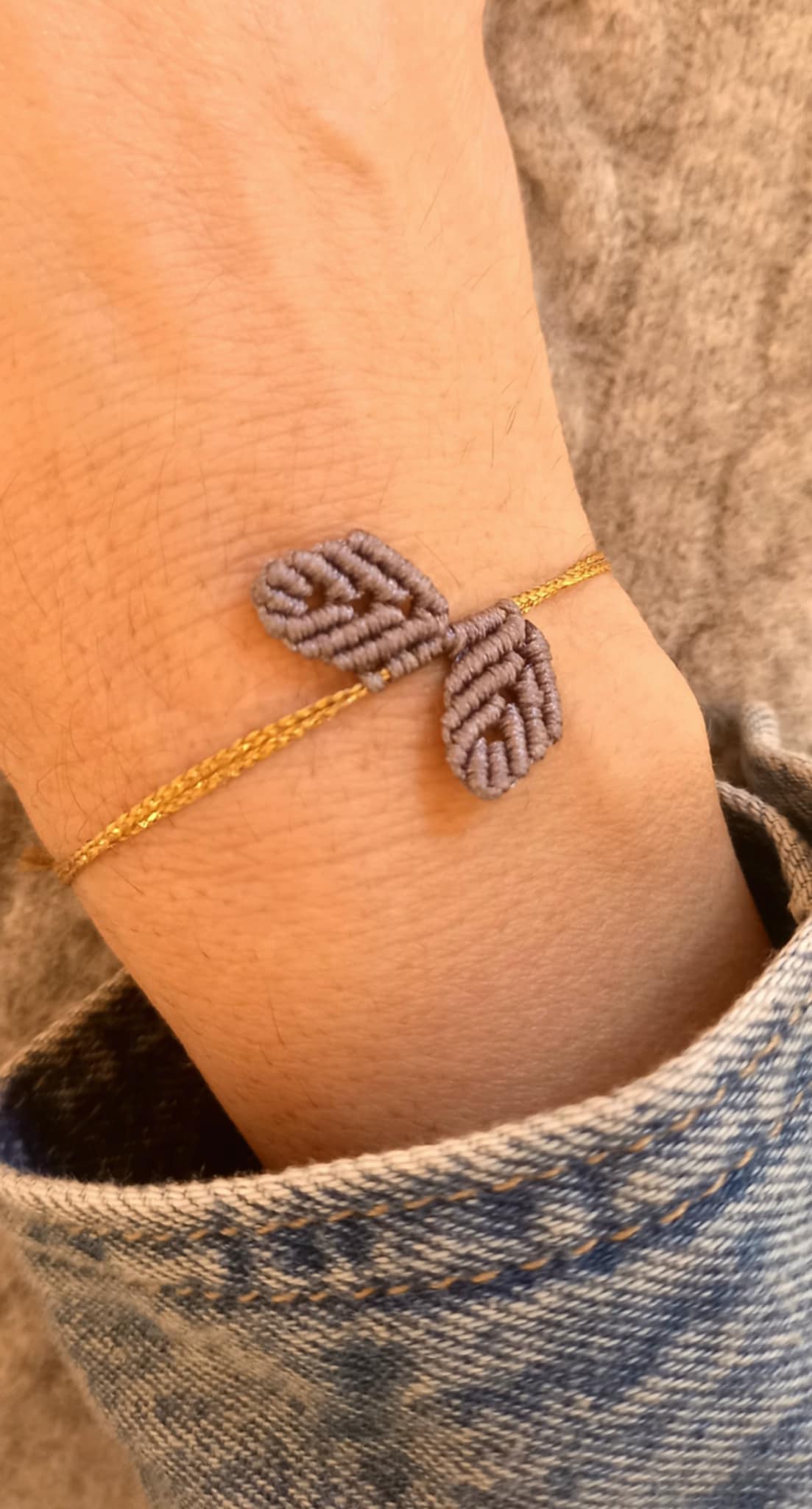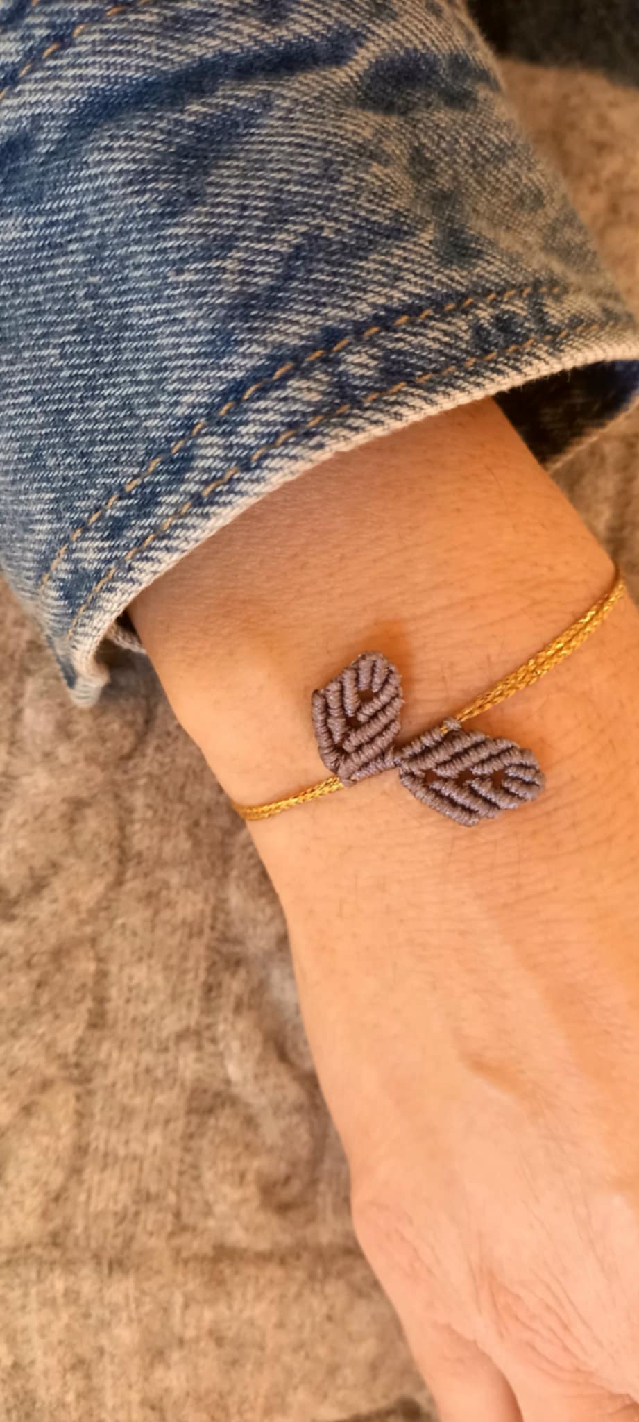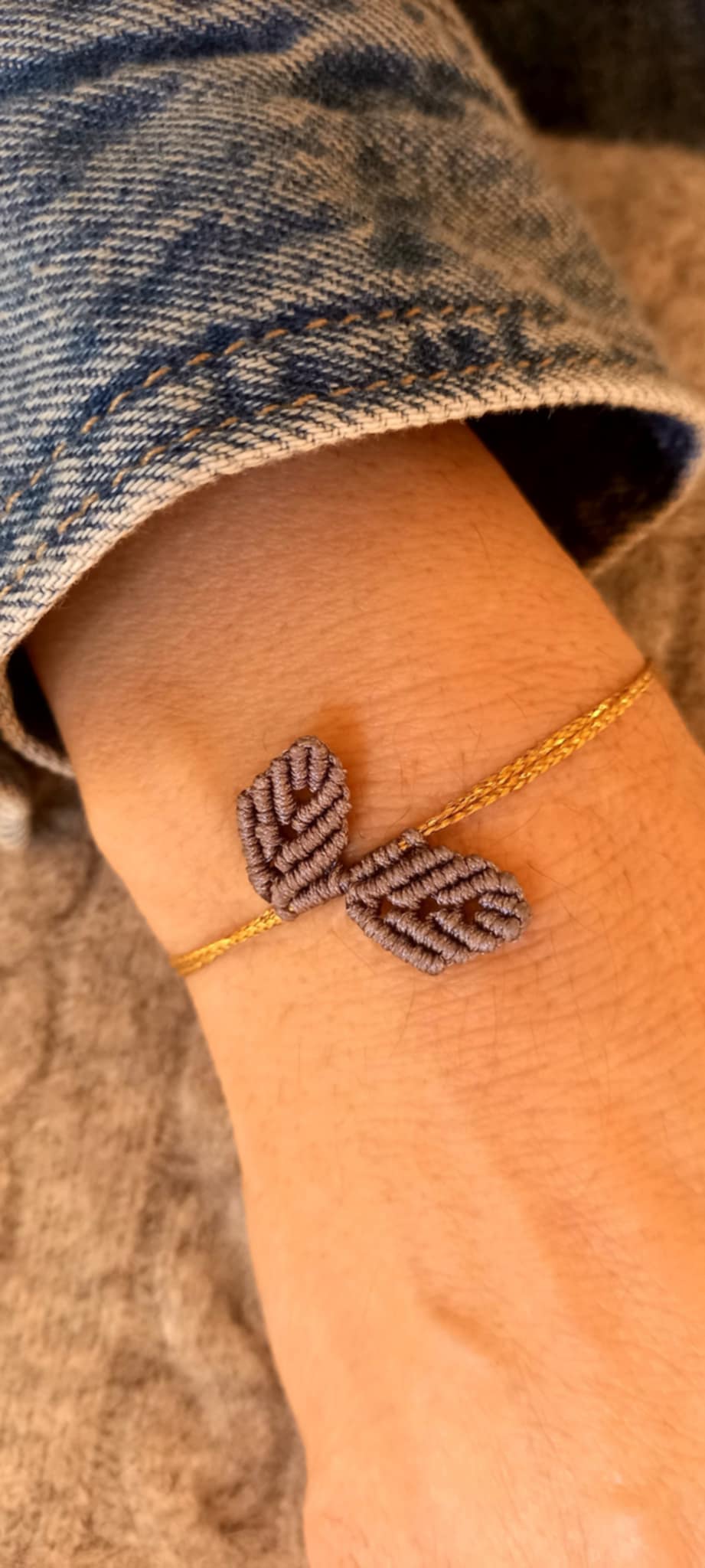 Χειροποίητο βραχιόλι με κερωμένο κορδόνι σε χρυσό χρώμα και μακραμέ διπλά φύλλα.