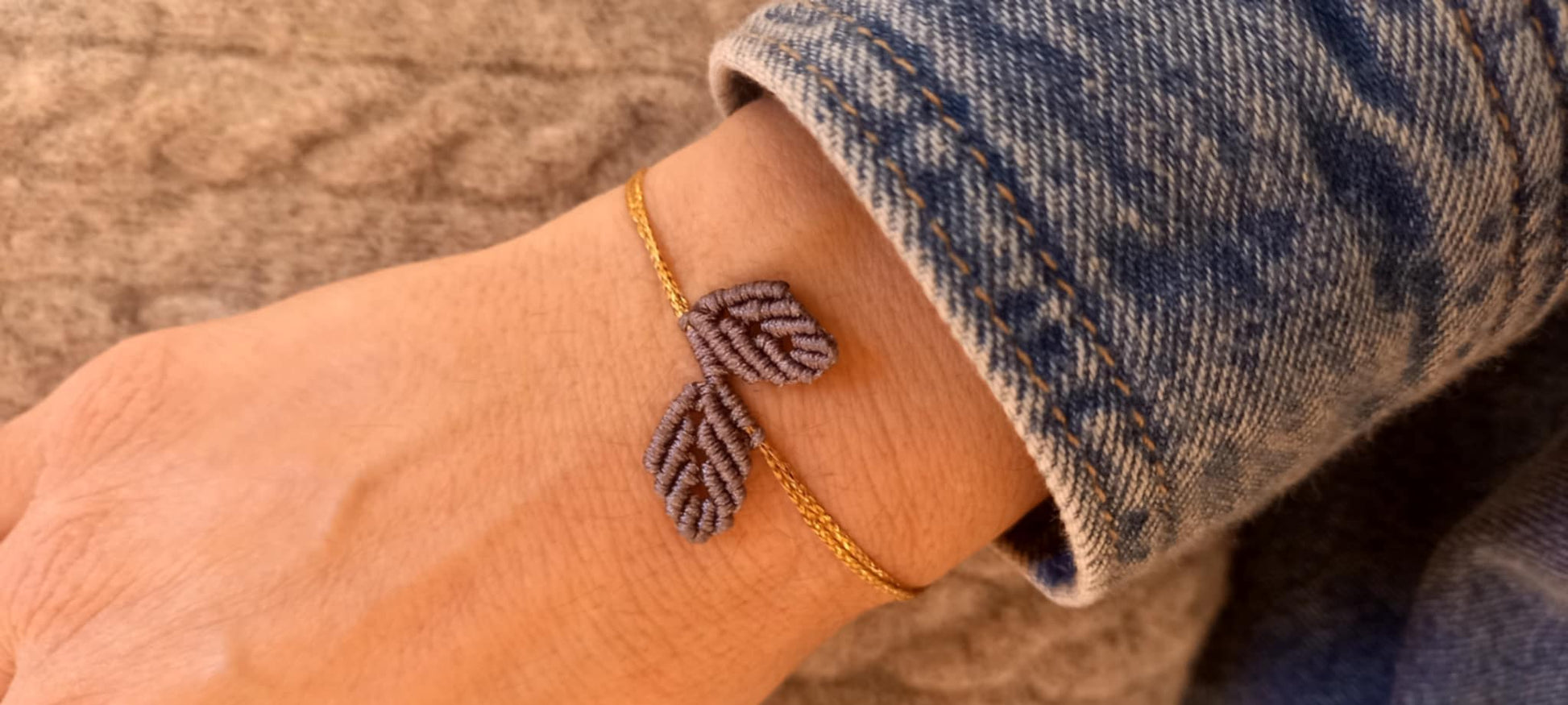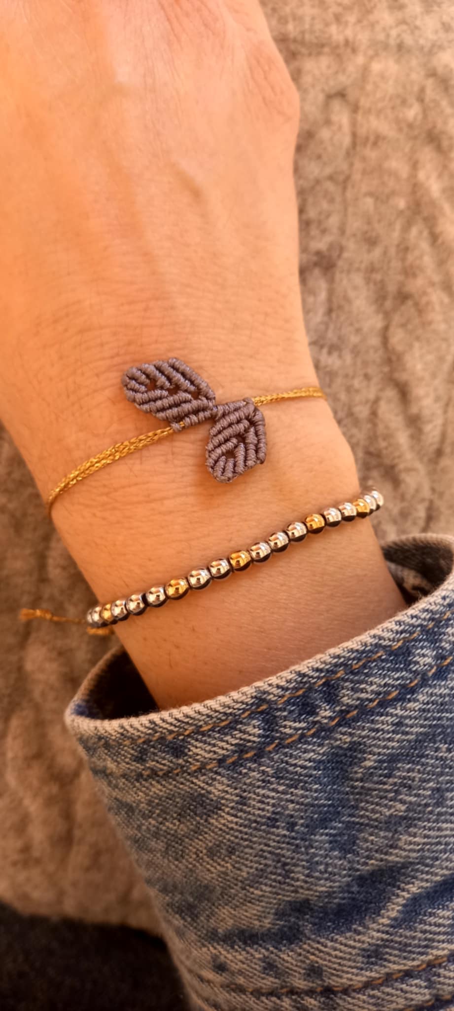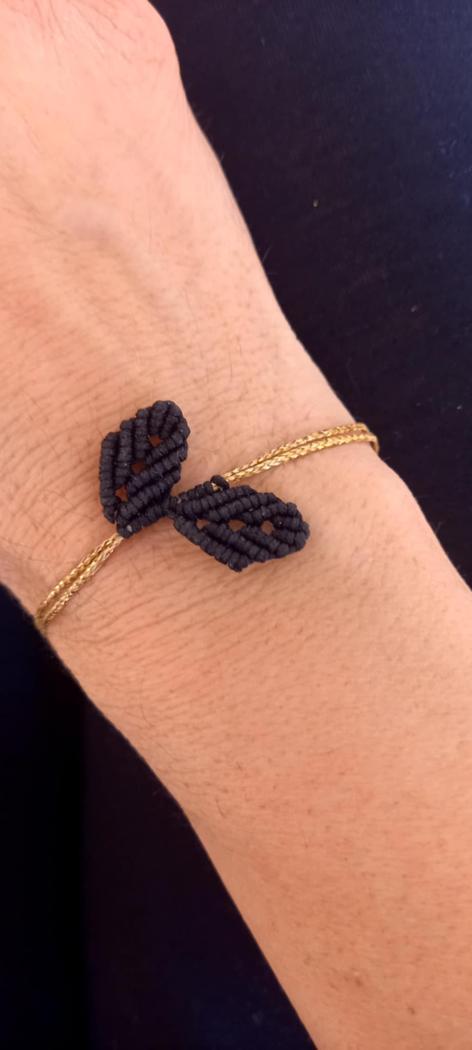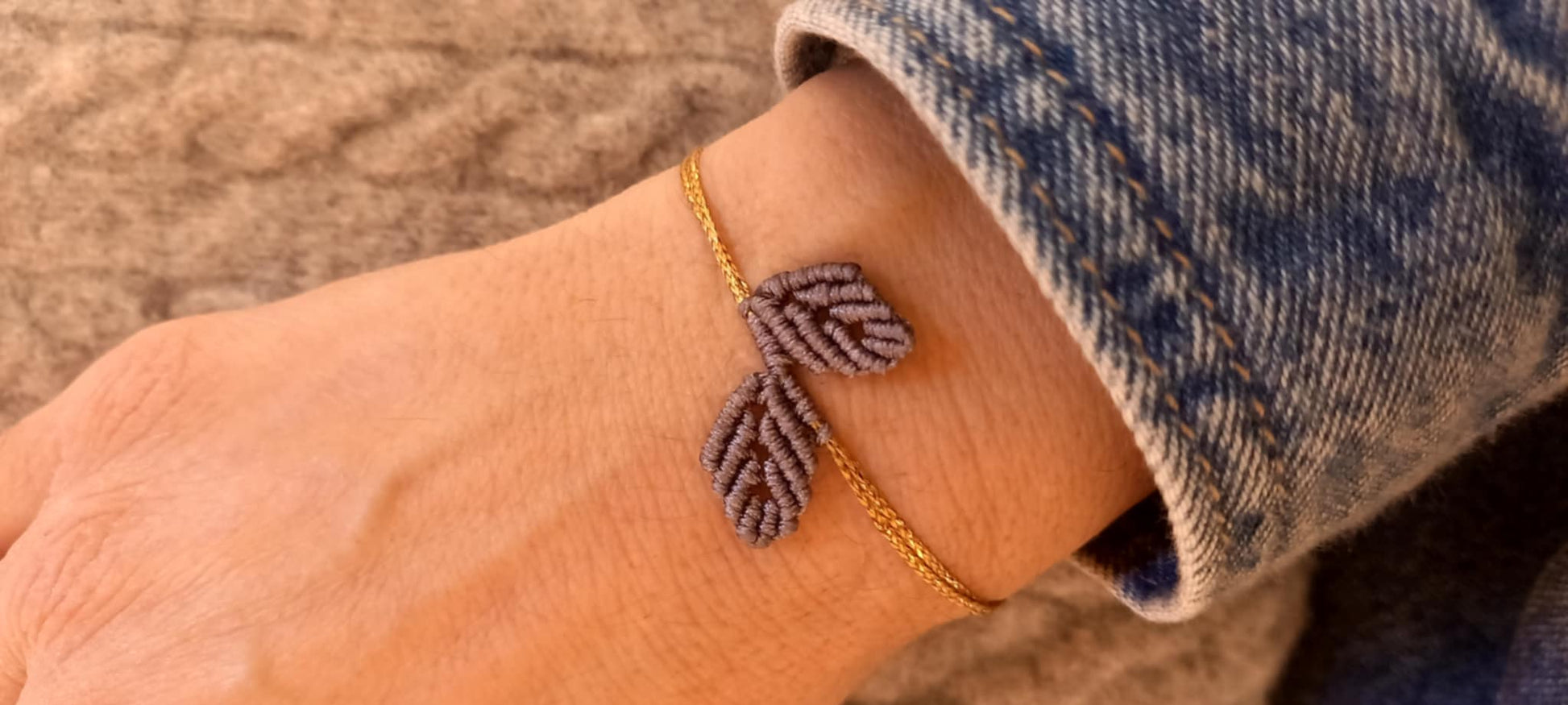 Χειροποίητο βραχιόλι με κερωμένο κορδόνι σε χρυσό χρώμα και μακραμέ διπλά φύλλα.
