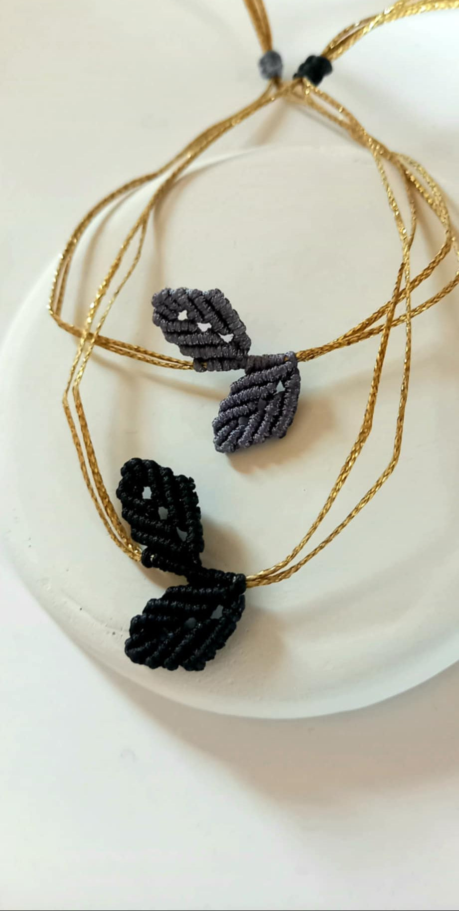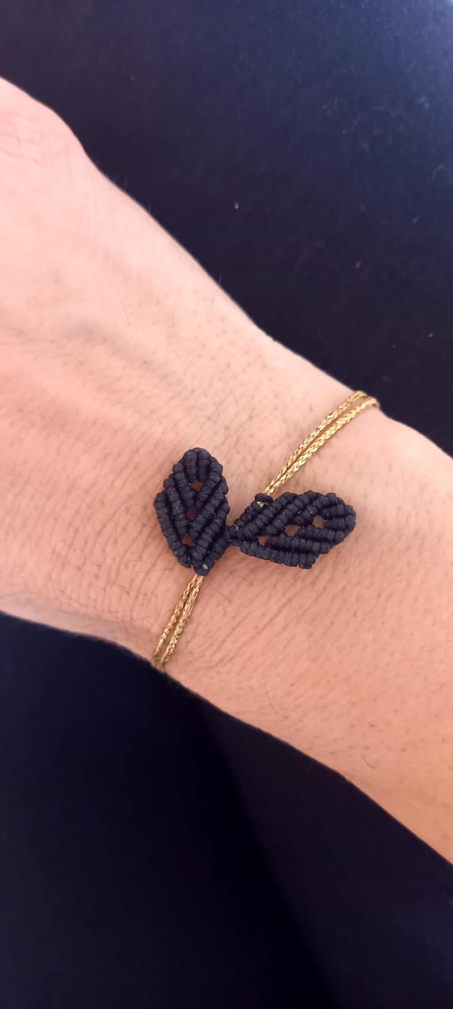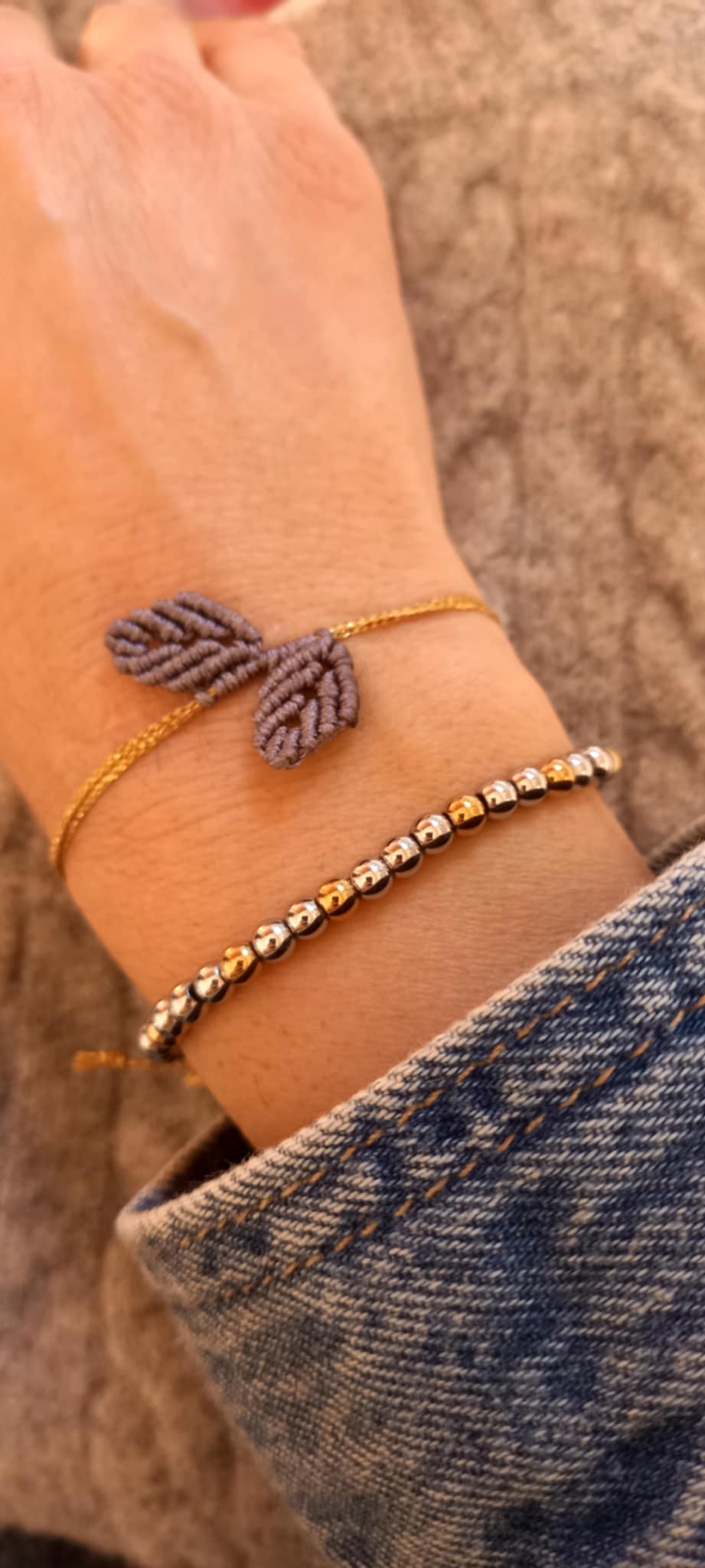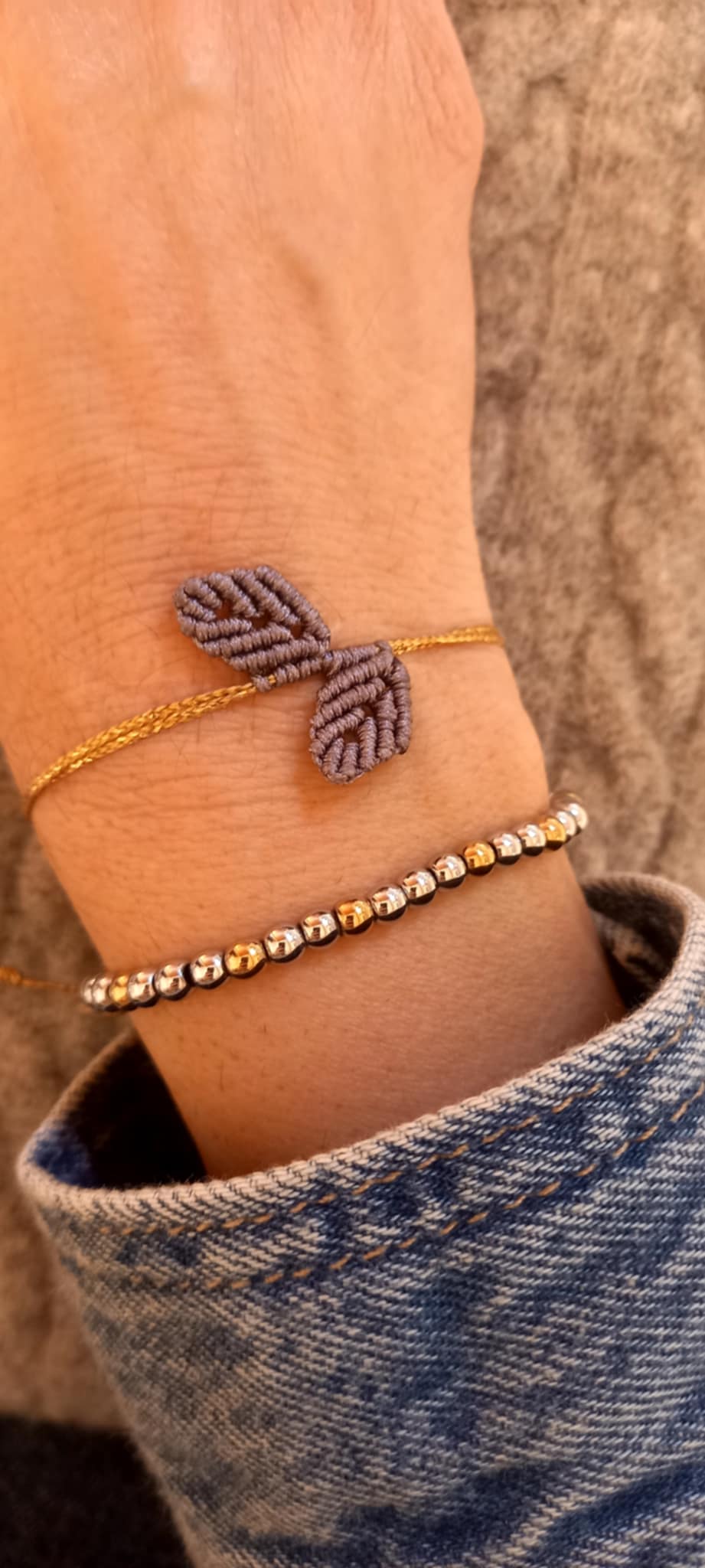 Χειροποίητο βραχιόλι με κερωμένο κορδόνι σε χρυσό χρώμα και μακραμέ διπλά φύλλα.