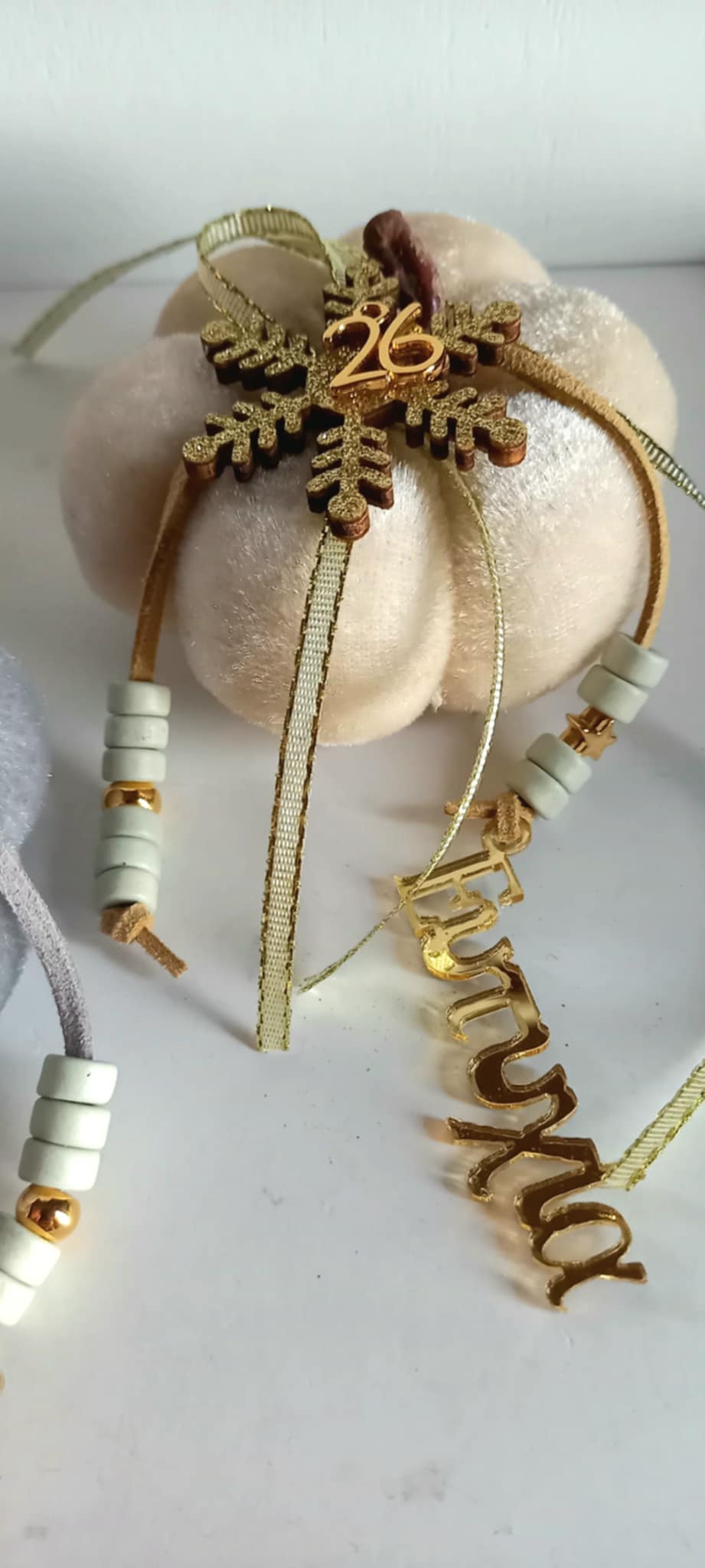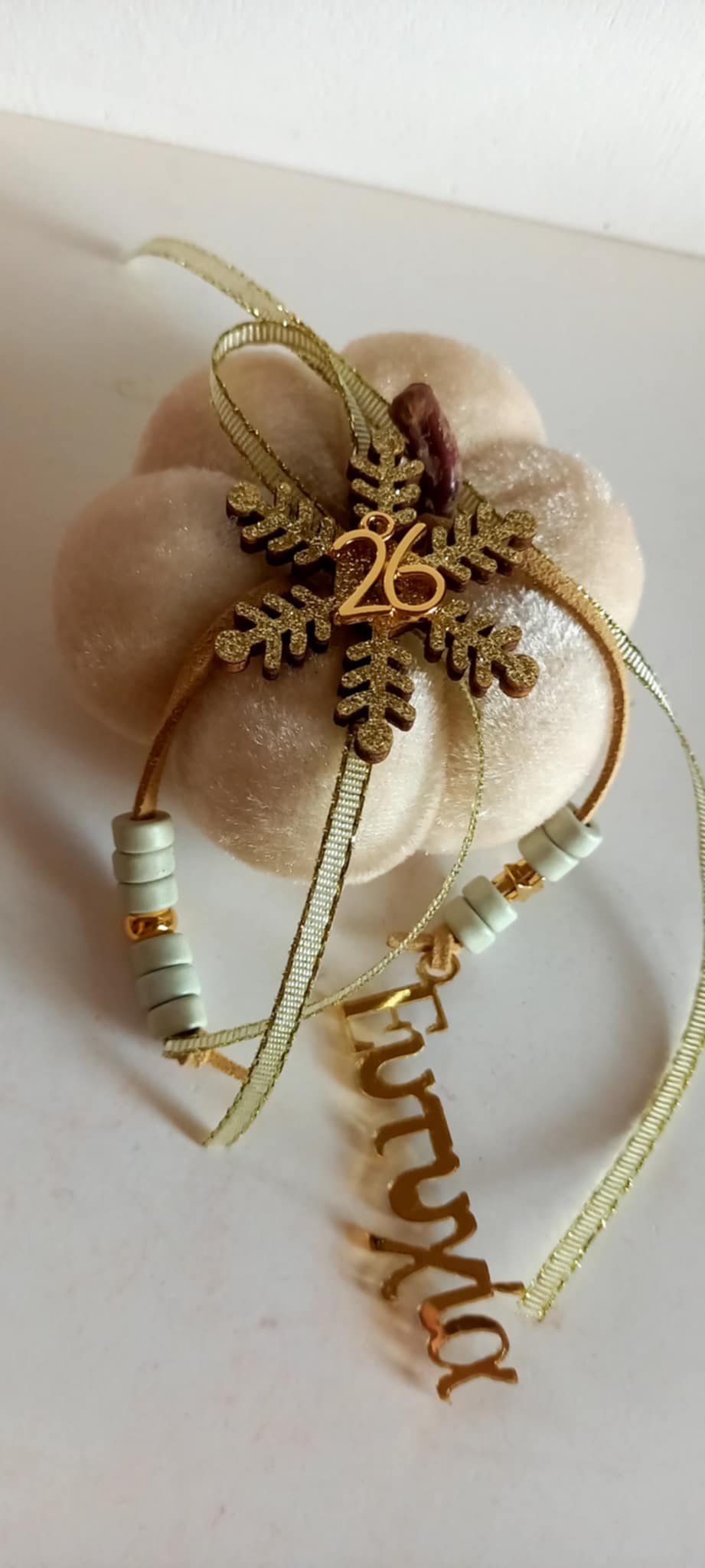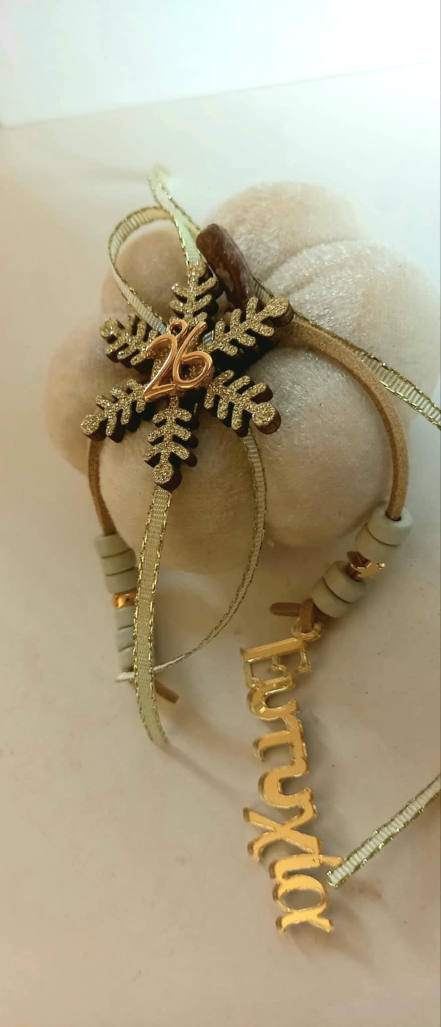 Γούρι 2026 - βελούδινη κολοκύθα σε ιβουάρ χρώμα με δερμάτινο κορδόνι, κεραμικές χάνρτες, plexi στοιχείο "Ευτυχία", μοτίφ "26" και χιονονιφάδα.