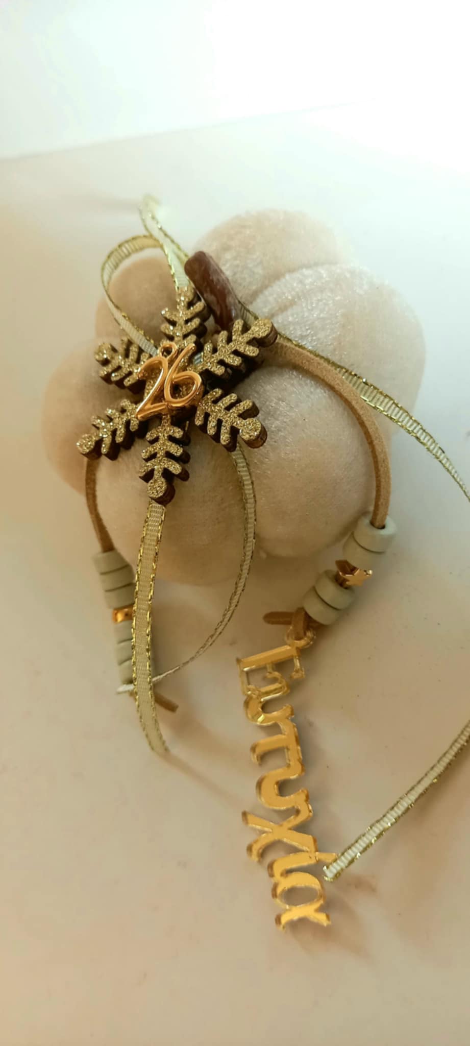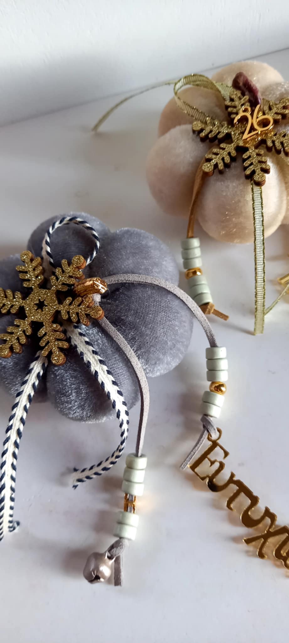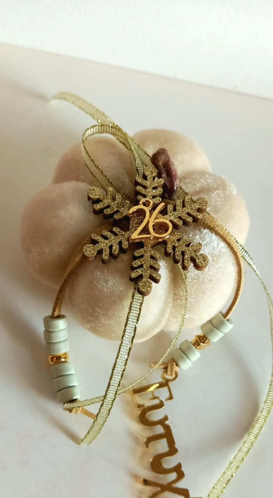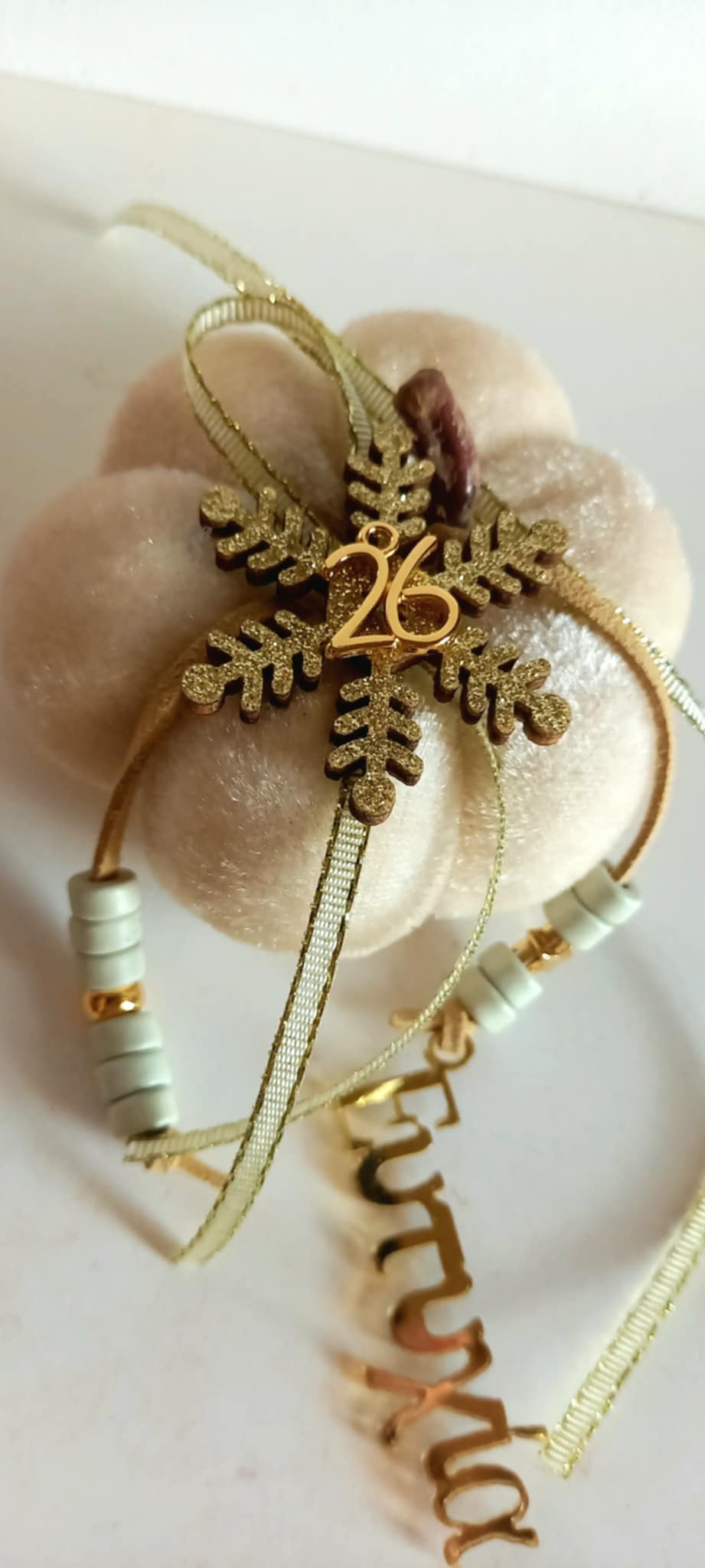 Γούρι 2026 - βελούδινη κολοκύθα σε ιβουάρ χρώμα με δερμάτινο κορδόνι, κεραμικές χάνρτες, plexi στοιχείο "Ευτυχία", μοτίφ "26" και χιονονιφάδα.