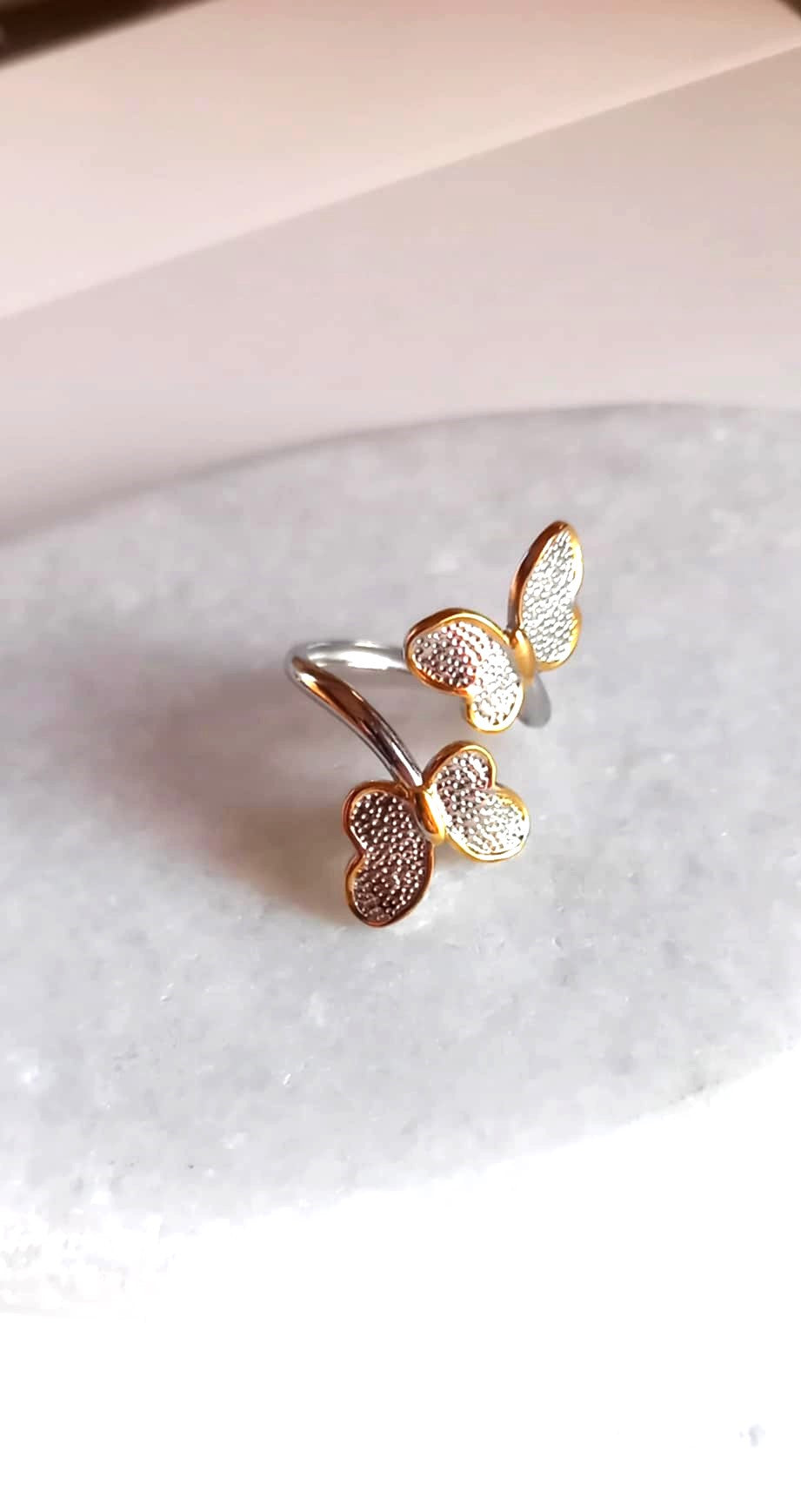 Δαχτυλίδι από ατσάλι με πεταλούδες και συνδυασμό ασημί-χρυσού.