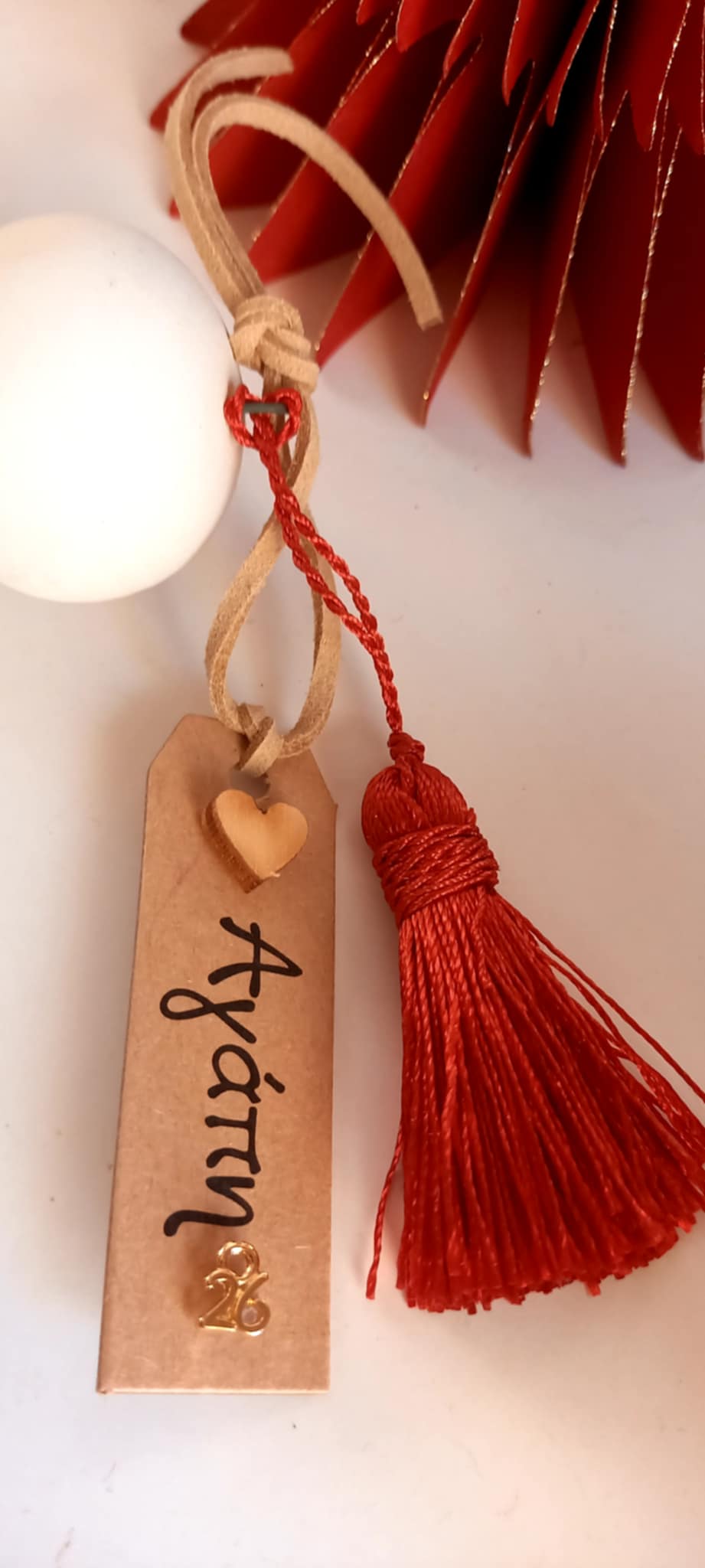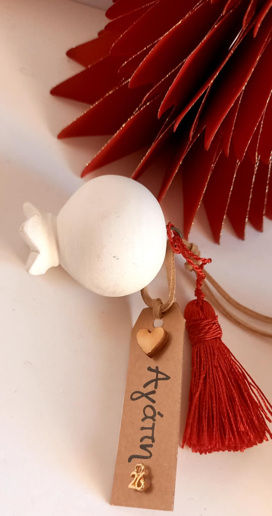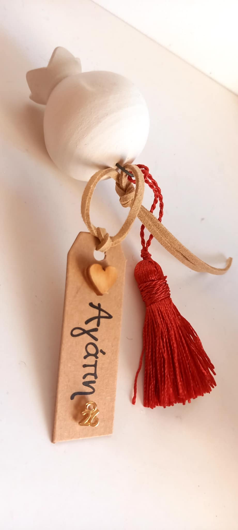 Επιτραπέζιο γούρι 2026 κεραμικό ρόδι με φούντα σε κόκκινο χρώμα, ευχή "Αγάπη", μεταλλικό στοιχείο "26" και καστόρι στο χρώμα της άμμου.