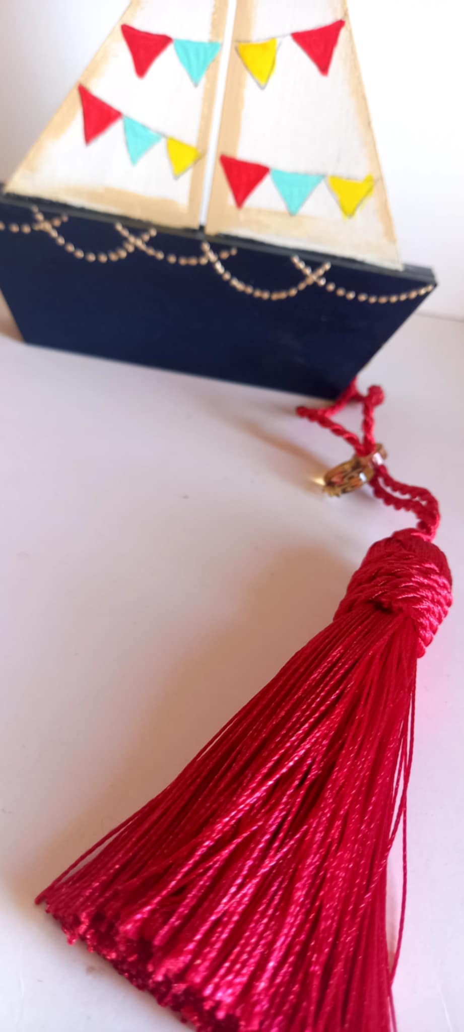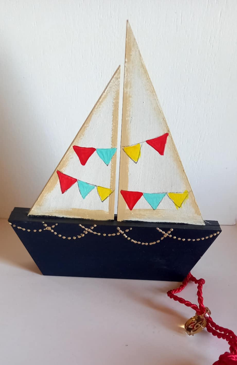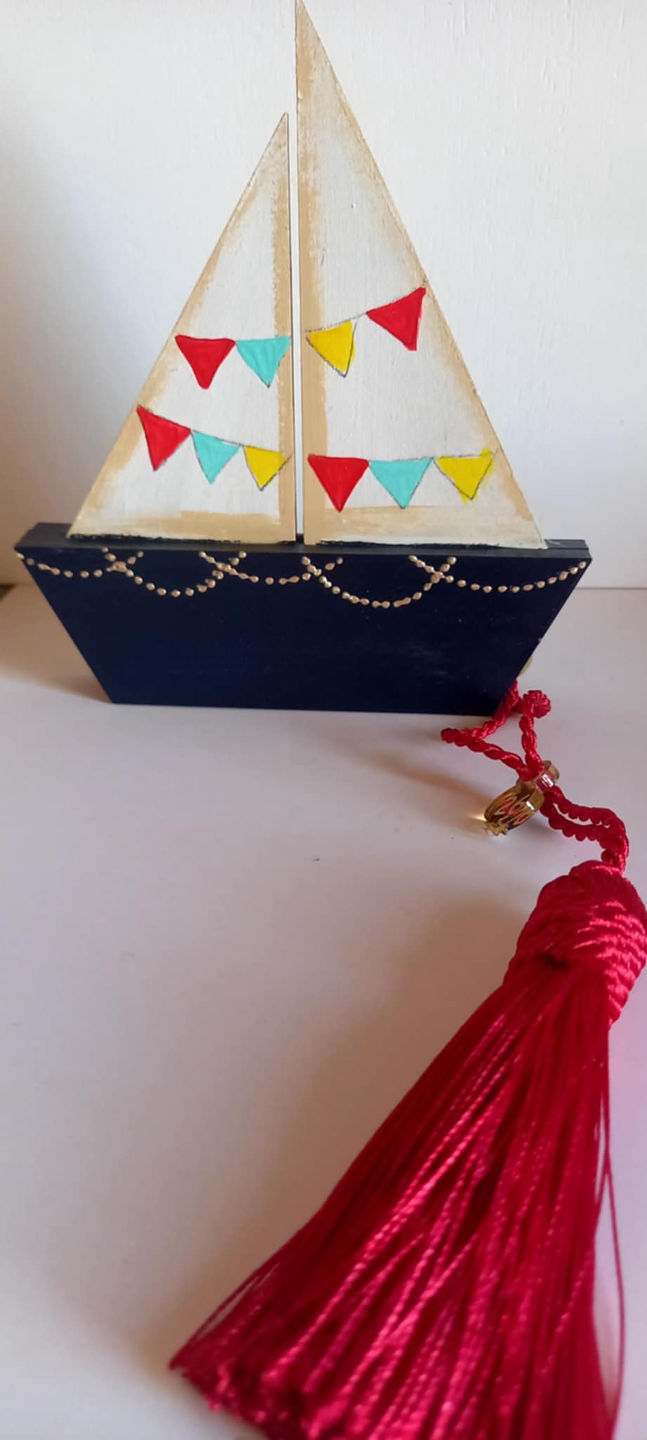 Επιτραπέζιο γούρι 2026 ξύλινο καράβι σε μπλε χρώμα με κόκκινη φούντα και στοιχείο plexi "26".