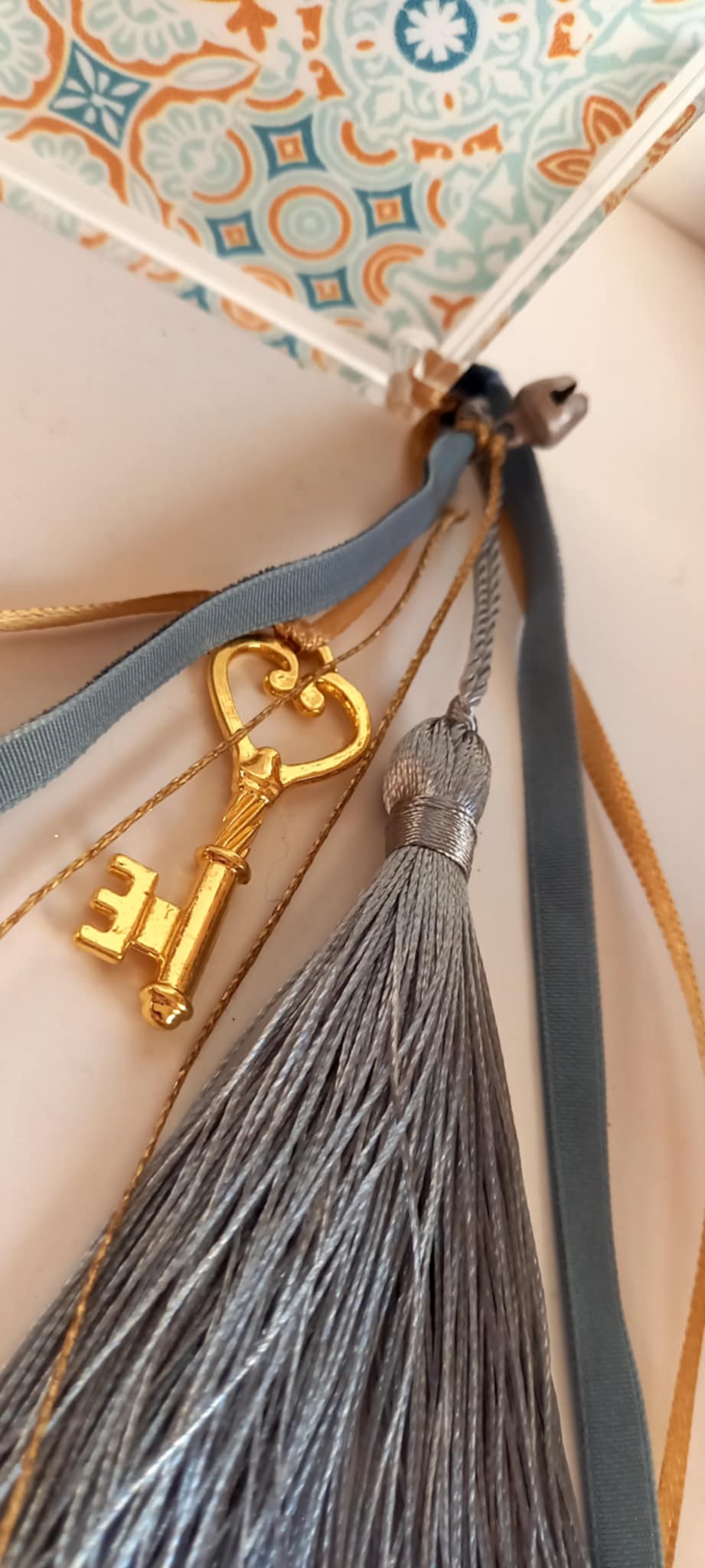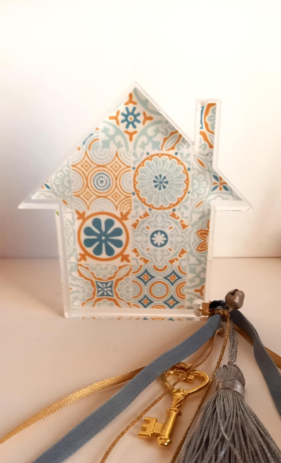 Επιτραπέζιο γούρι 2026 σπιτάκι από plexi glass με μοτίβο σε μπλε και μελί αποχρώσεις με γκρι φούντα, μεταλλικό κλειδί, κοτδουνάκι, στοιχείο "26" και ασορτί κορδέλες.