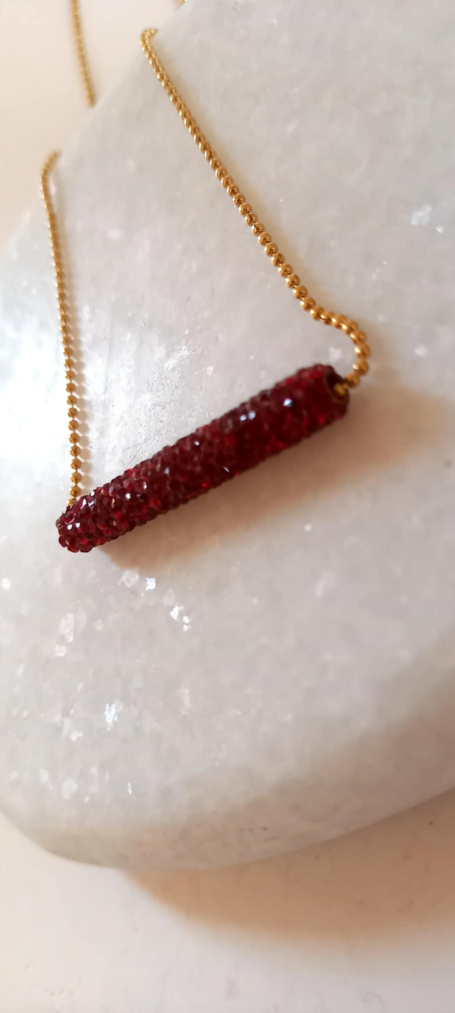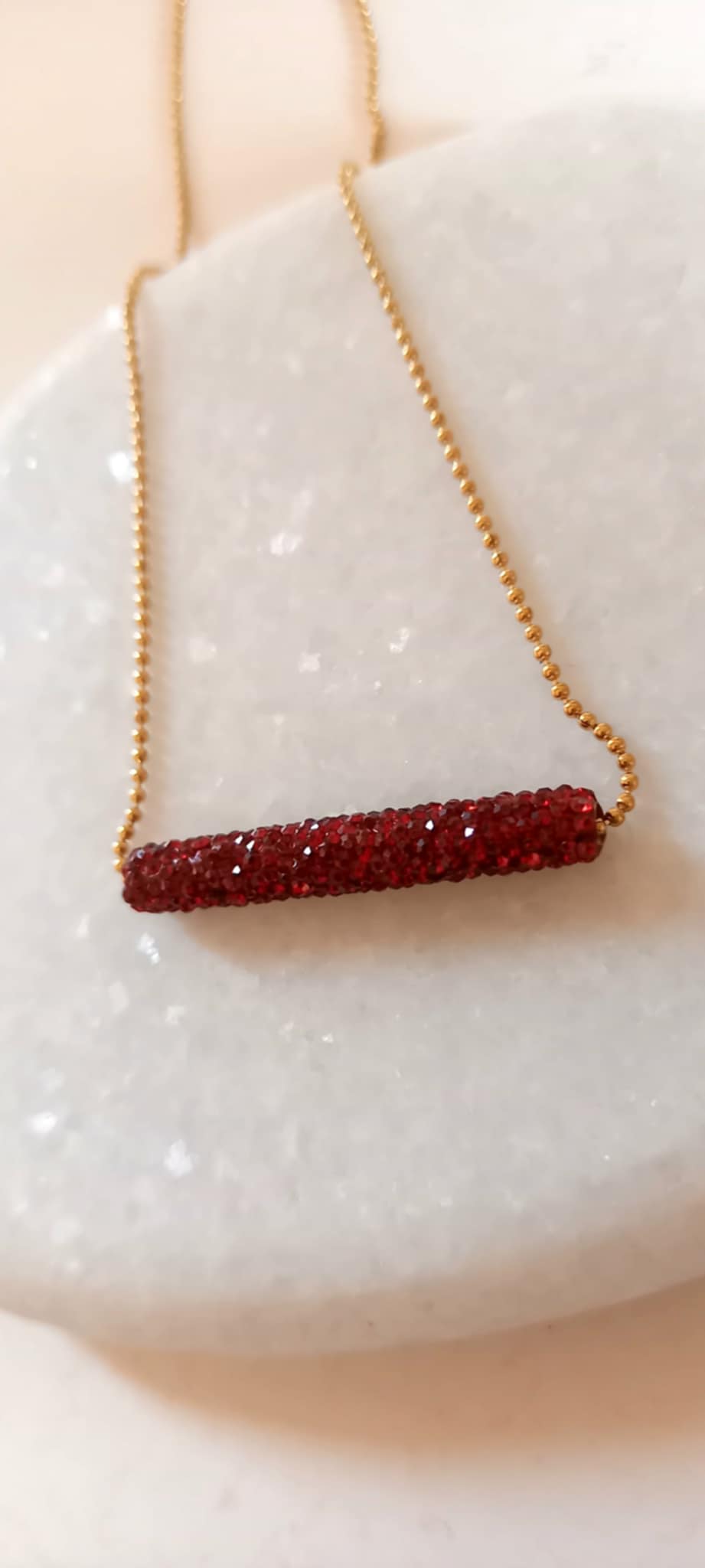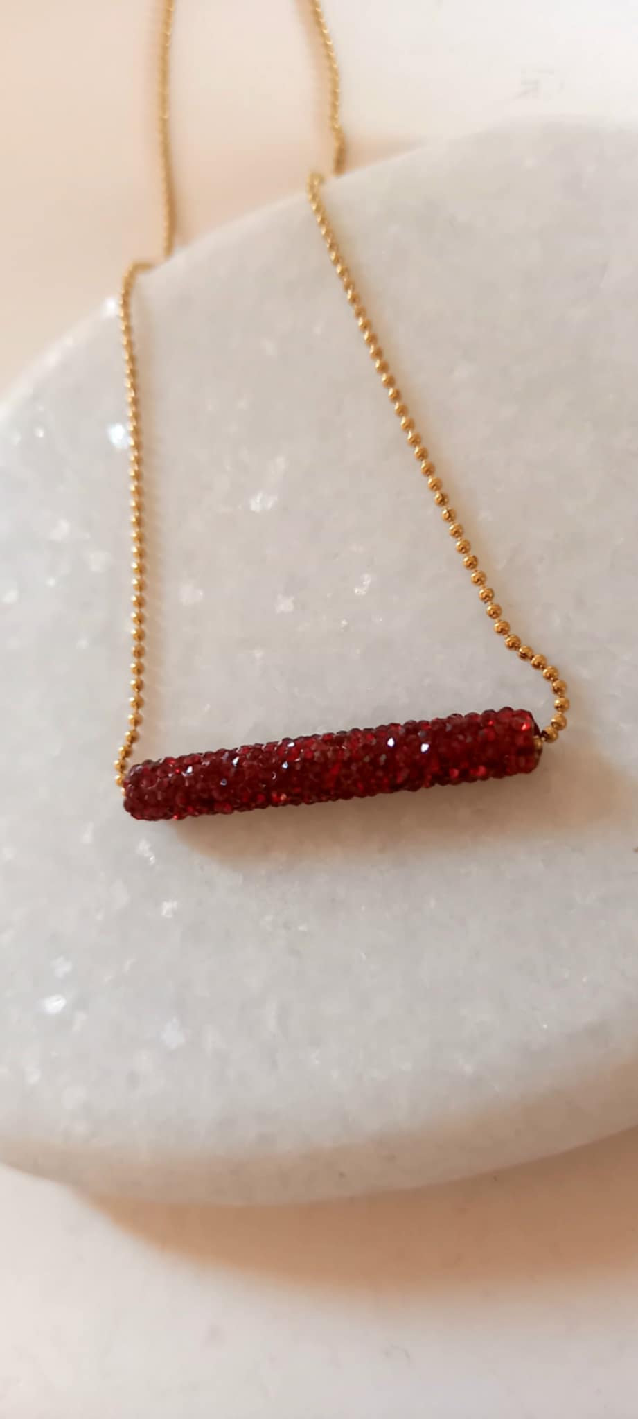 Εντυπωσιακό κολιέ με αλυσίδα από επιχρυσωμένο ατσάλι και μοτίφ με κρύσταλλα σε υπέροχο μπορντώ χρώμα.