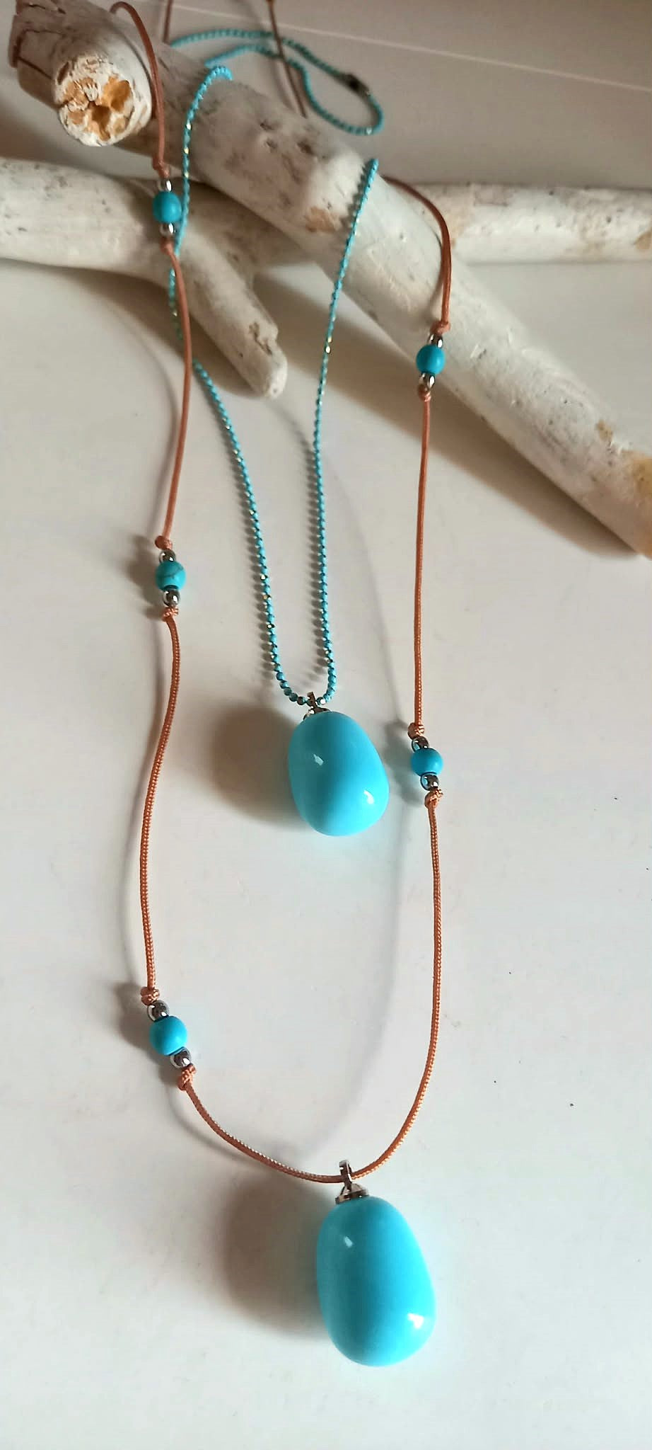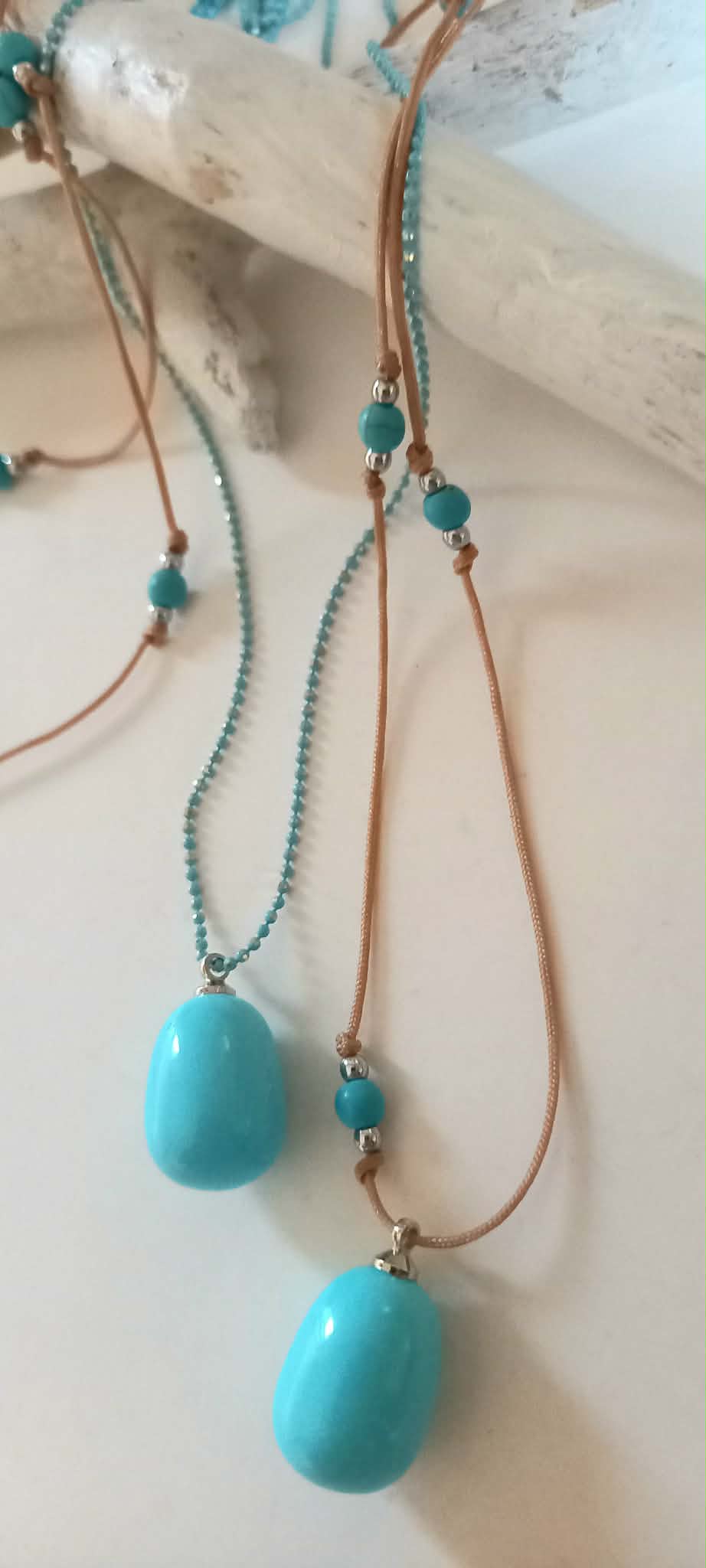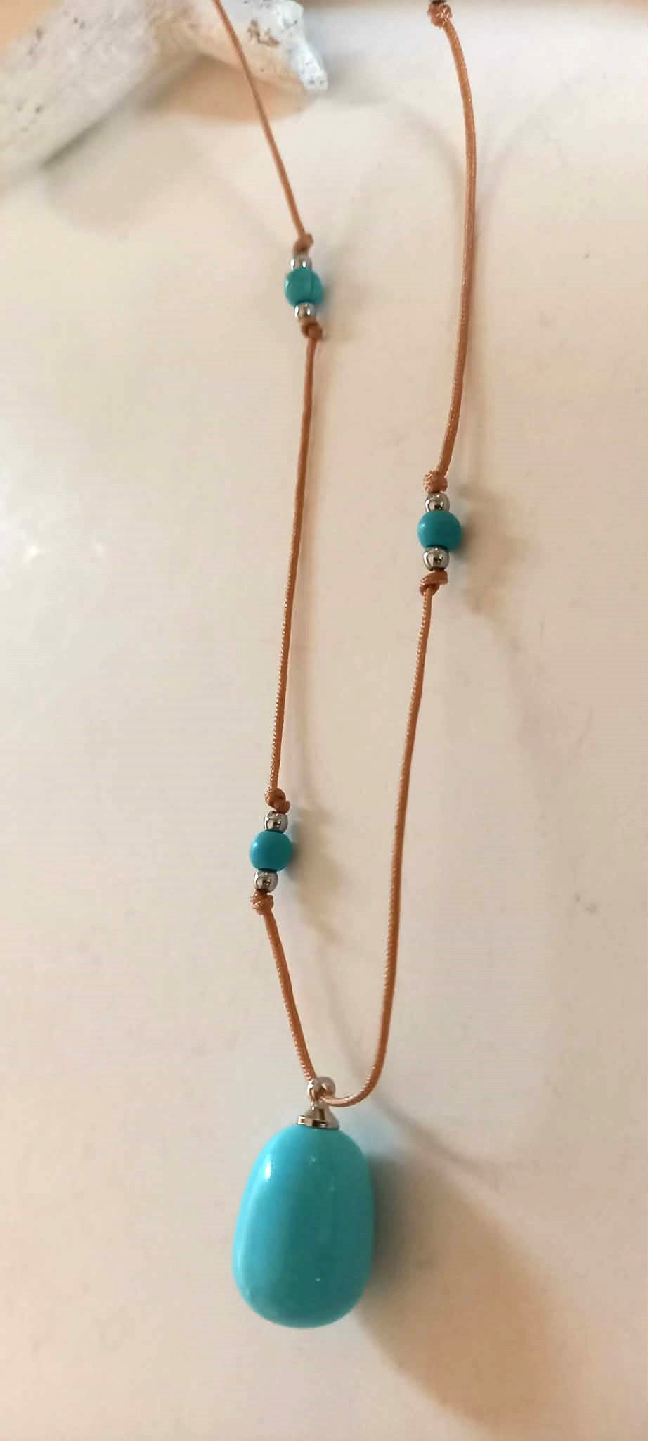Κολιέ με κορδόνι σε φυσικό χρώμα, αυγό από ημιπολύτιμη πέτρα σε φωτεινό τυρκουάζ χρώμα, ασημί αιματίτες και ημιπολύτιμες πέτρες χαολίτη.