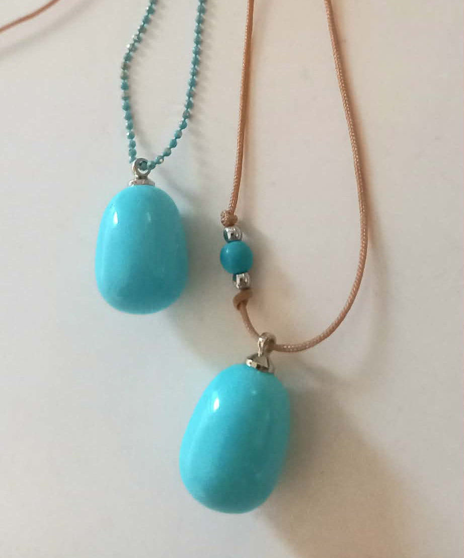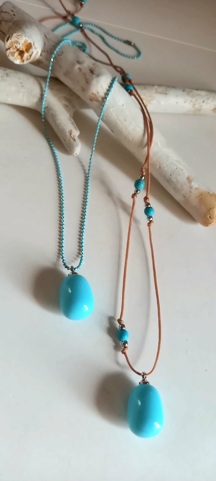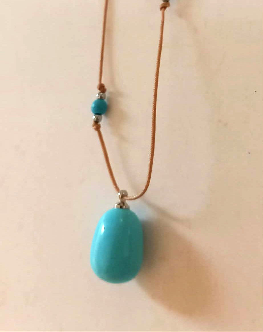 Κολιέ με κορδόνι σε φυσικό χρώμα, αυγό από ημιπολύτιμη πέτρα σε φωτεινό τυρκουάζ χρώμα, ασημί αιματίτες και ημιπολύτιμες πέτρες χαολίτη.