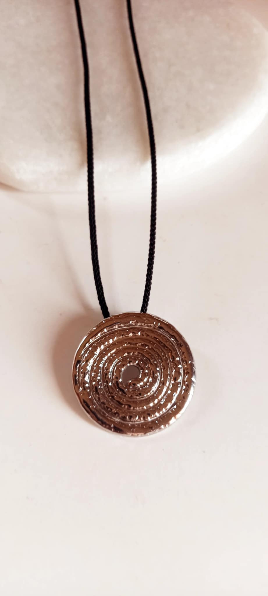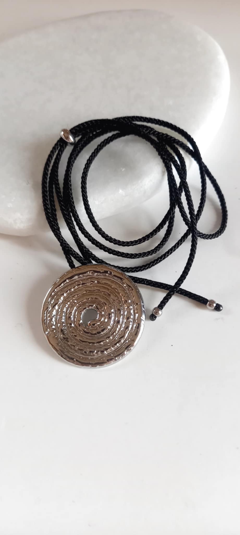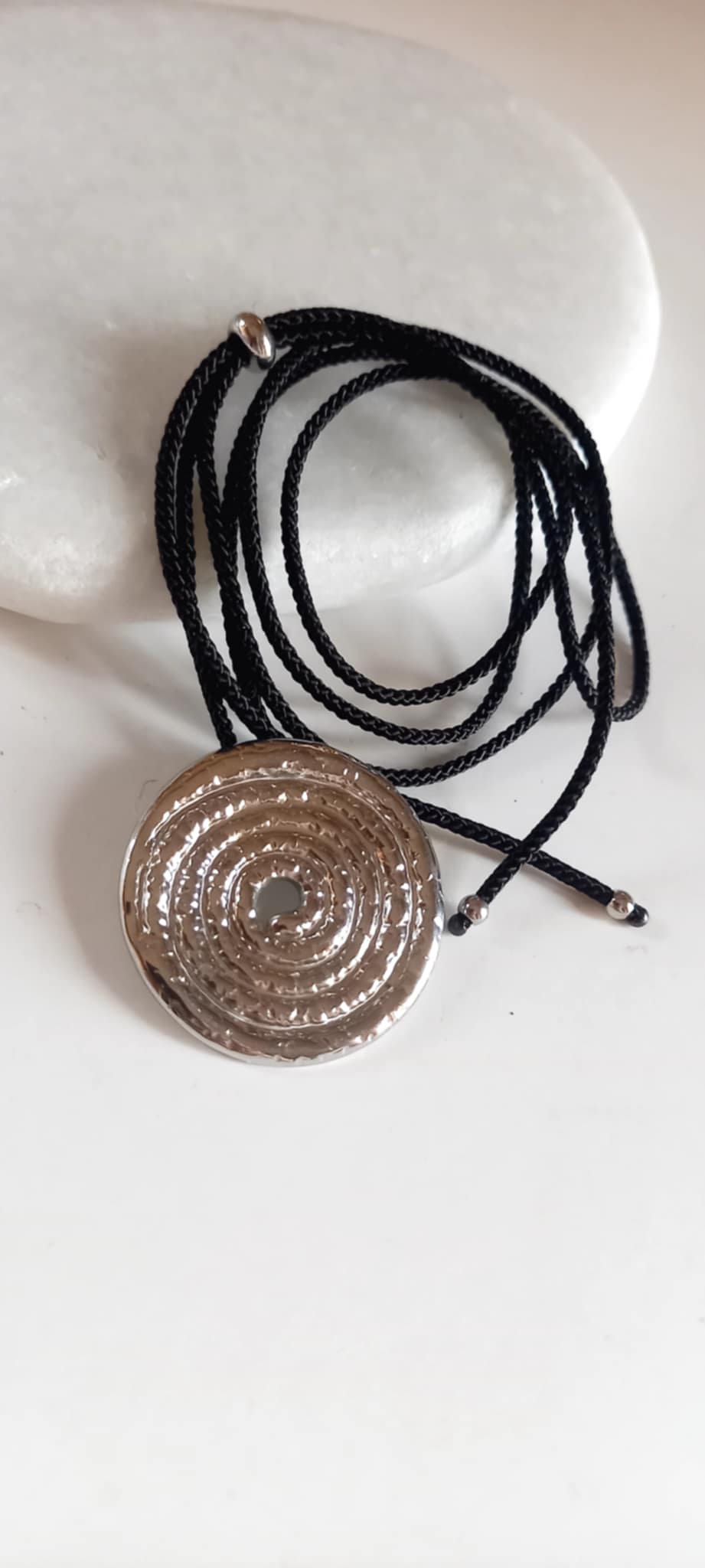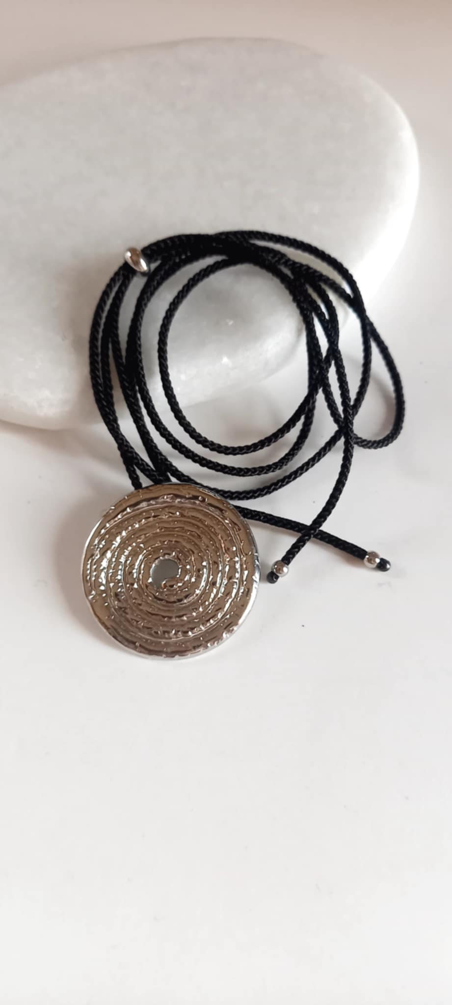 Εντυπωσιακό κολιέ με πολυτελές κορδόνι σε μαύρο χρώμα και στρογγυλό ανάγλυφο μοτίφ.