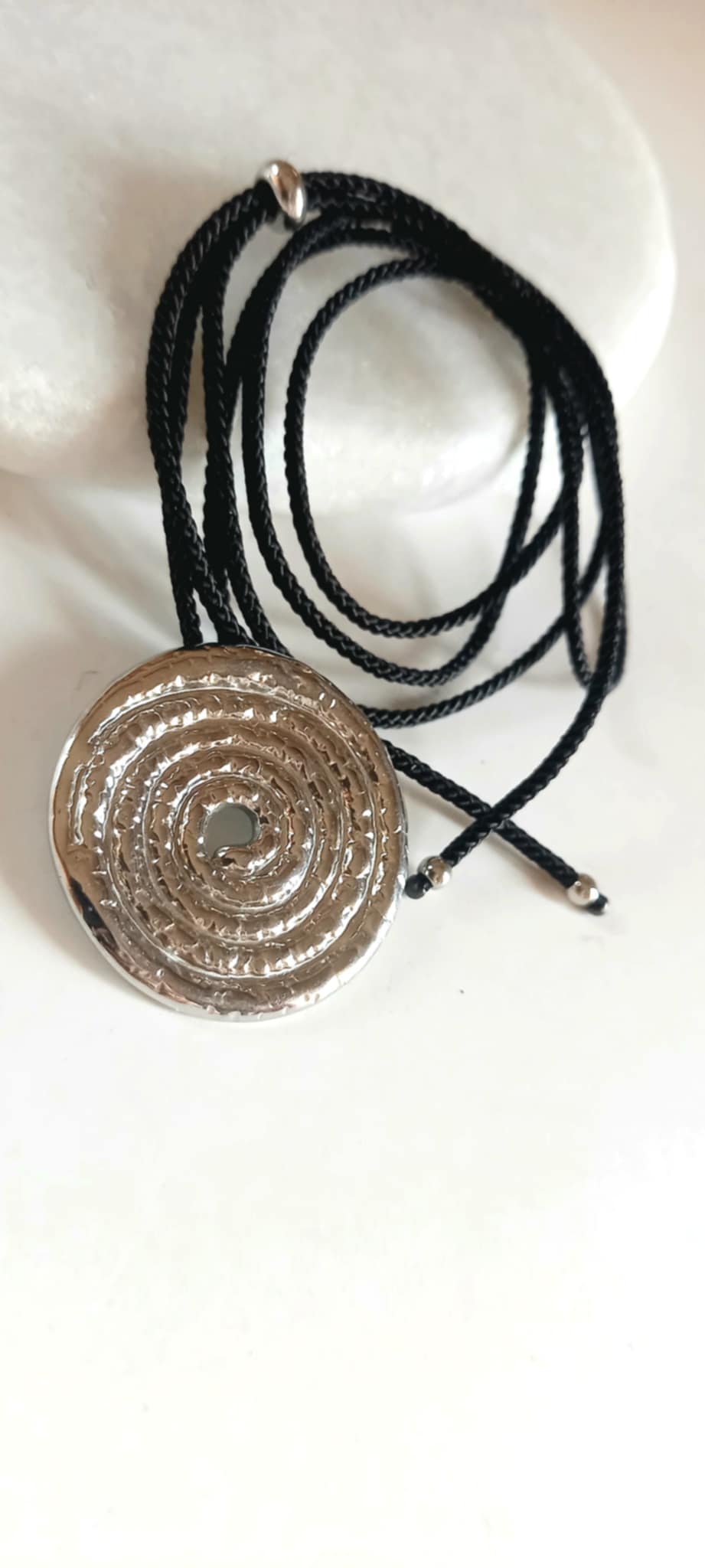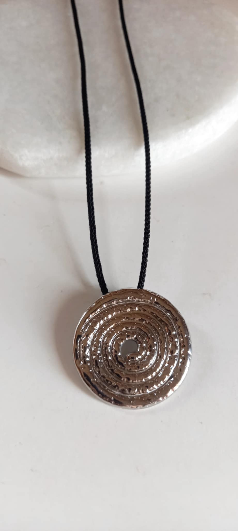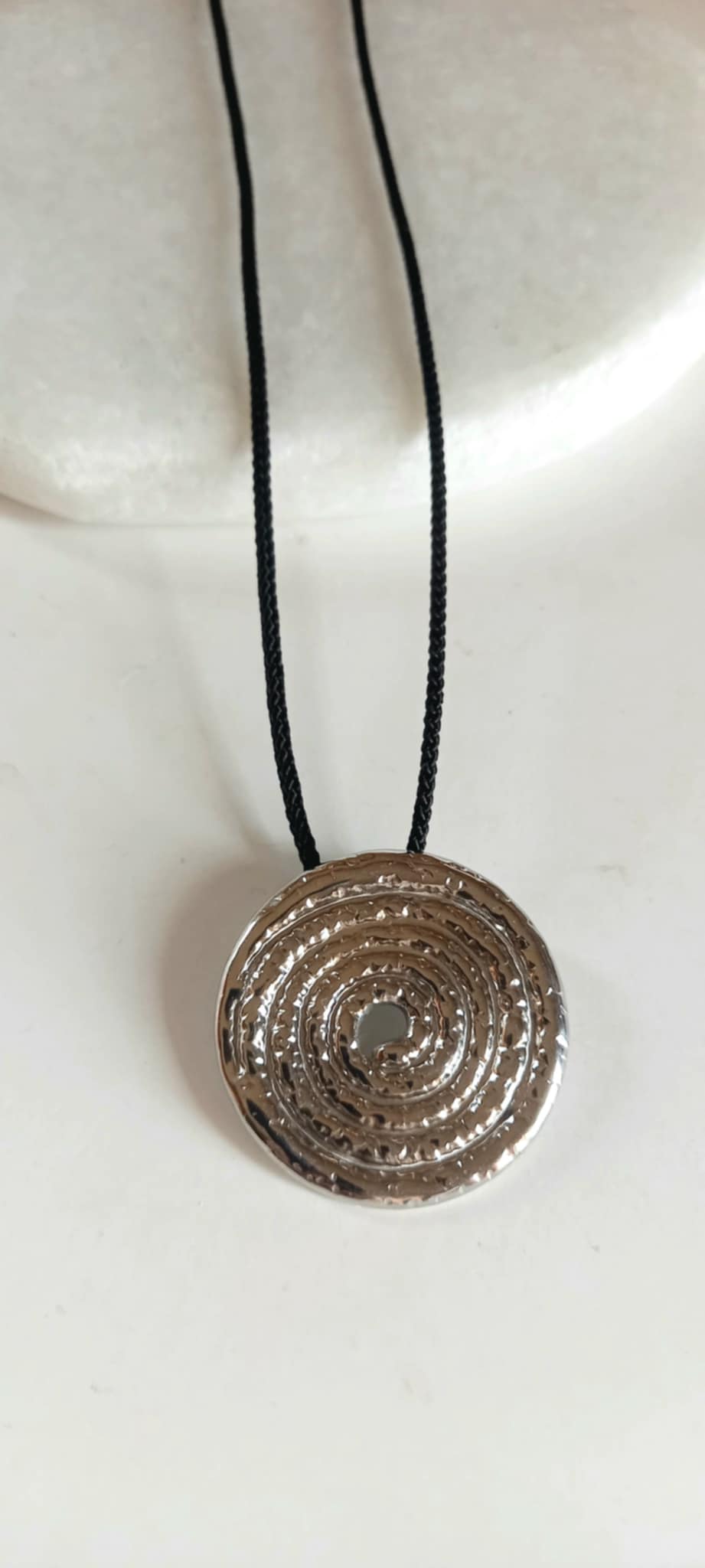 Εντυπωσιακό κολιέ με πολυτελές κορδόνι σε μαύρο χρώμα και στρογγυλό ανάγλυφο μοτίφ.